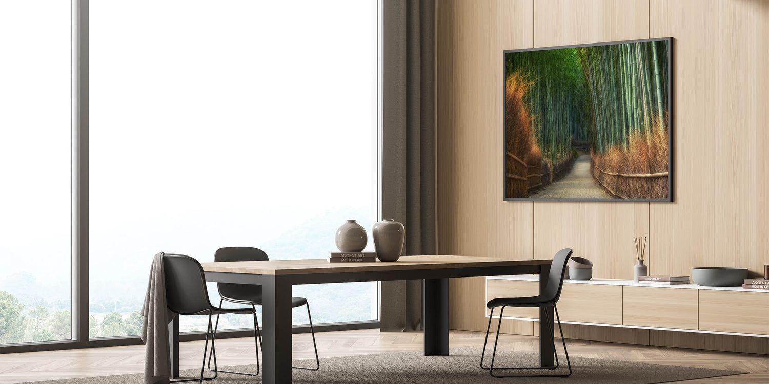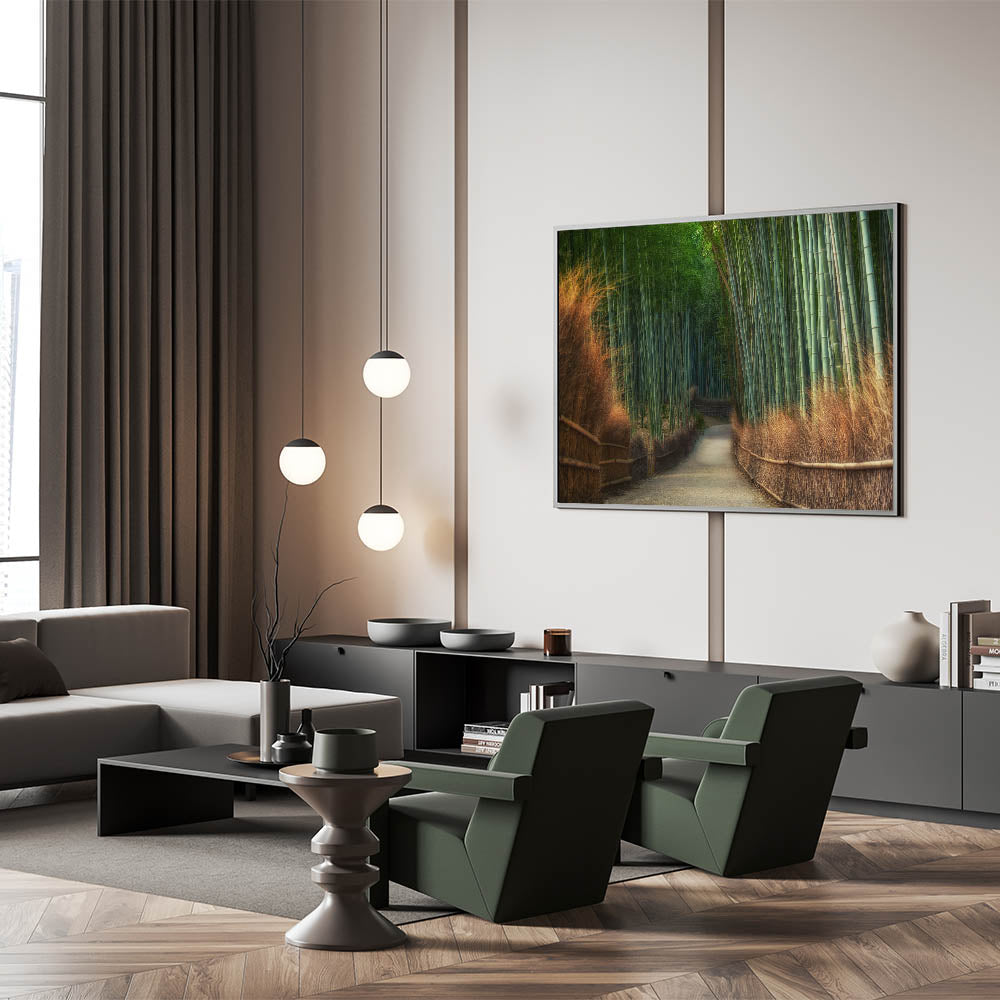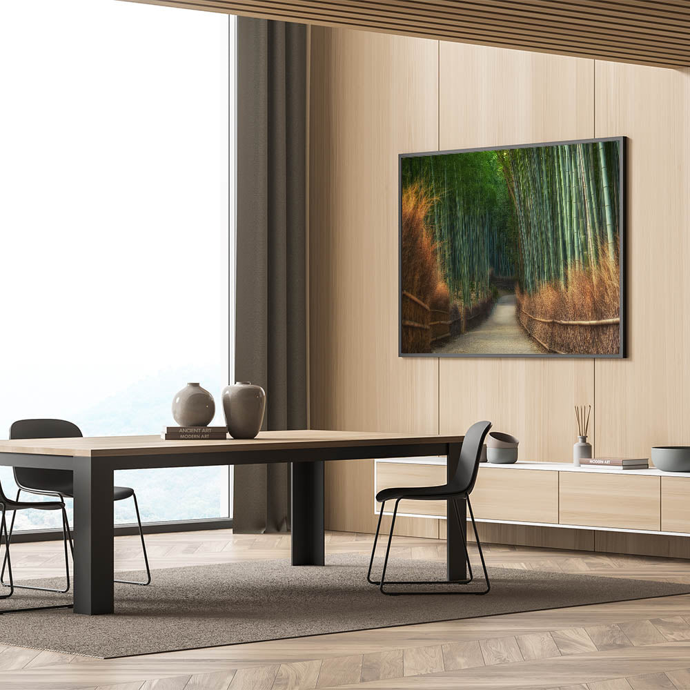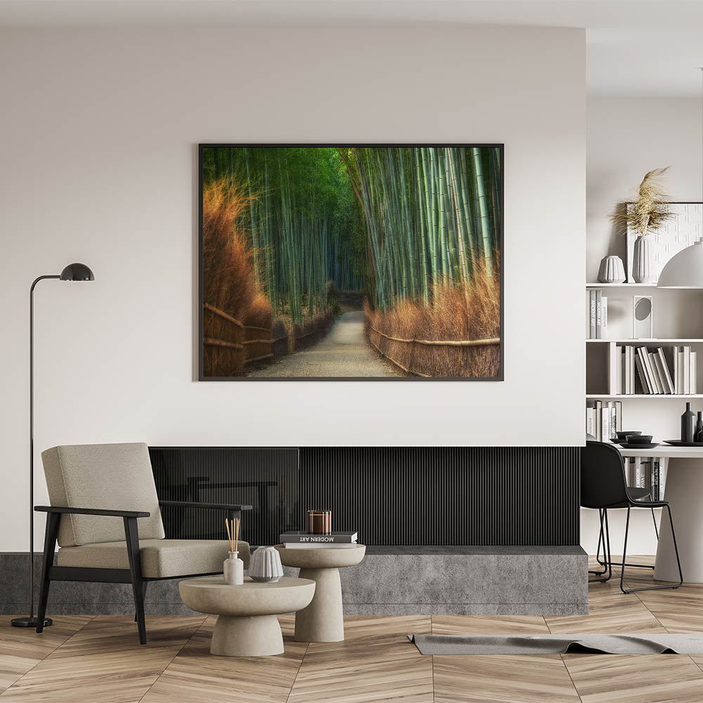 Step into a world of tranquility with this mystical bamboo forest path wall art. This artwork beautifully captures the serene ambiance of a secluded bamboo forest, where tall, elegant bamboo stalks create a natural, green corridor. The pathway, lined with warm golden-brown foliage, gently curves into the distance, inviting you to imagine a peaceful walk through this enchanting setting. The deep greens and warm tones create a harmonious balance, making this piece perfect for adding a touch of nature’s tranquility to any room.