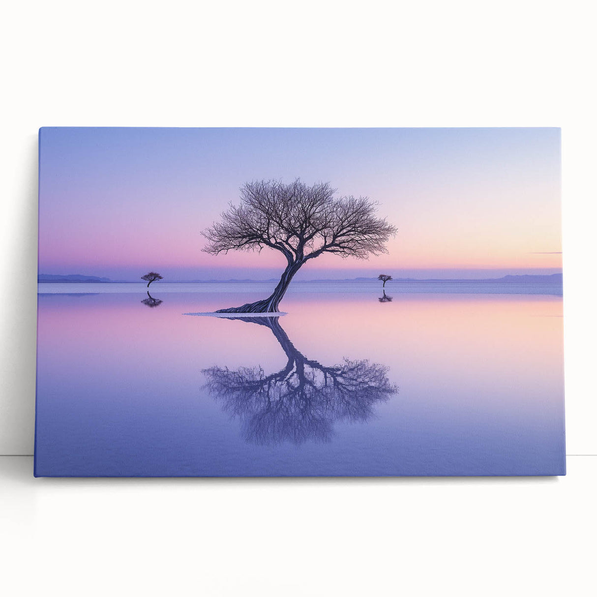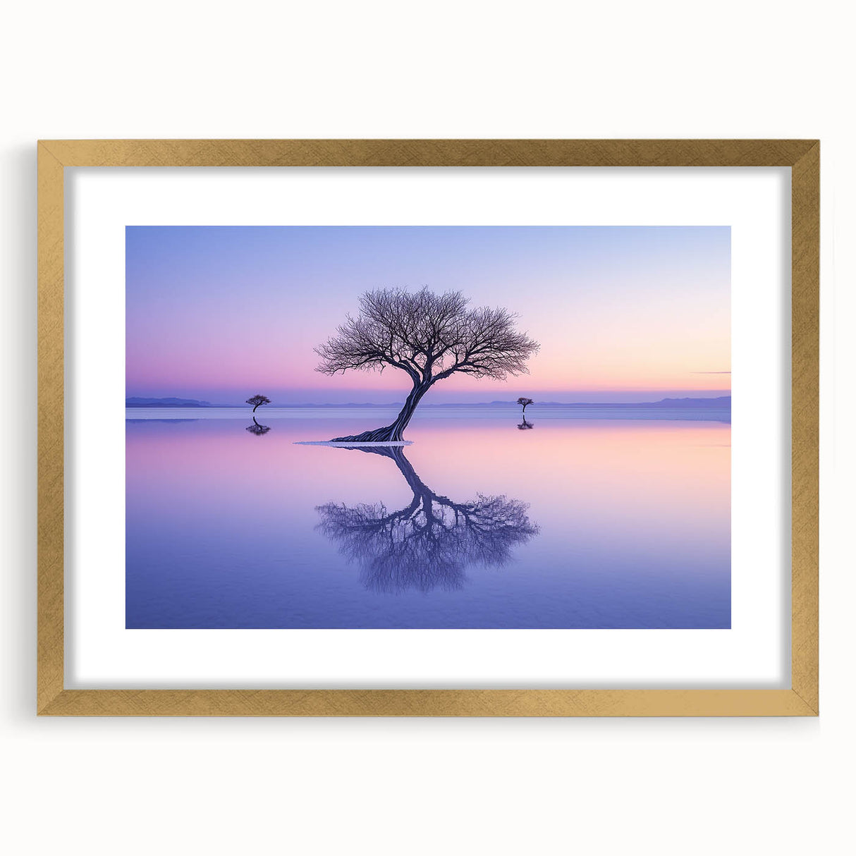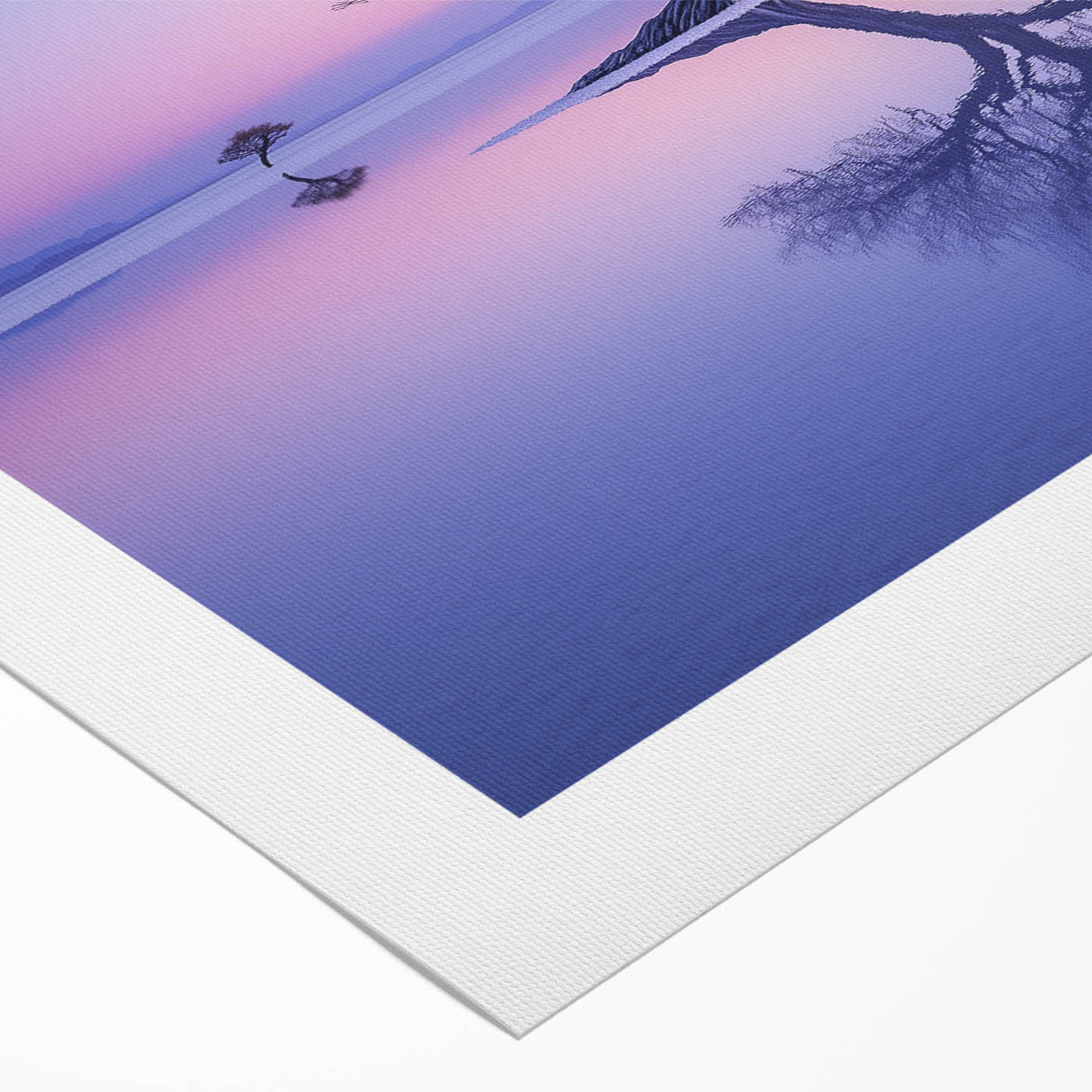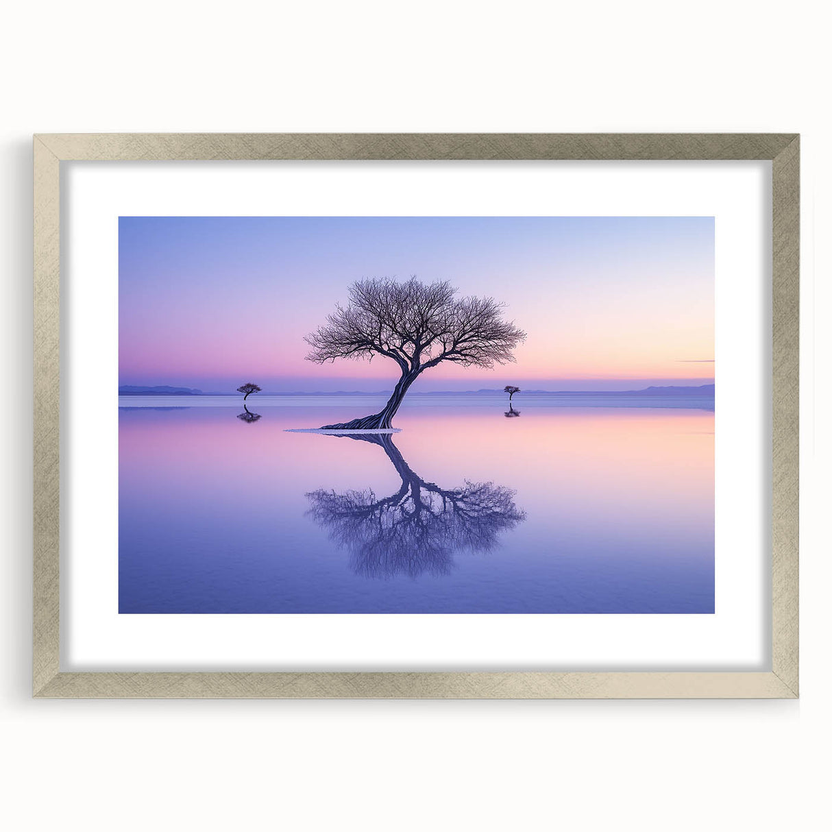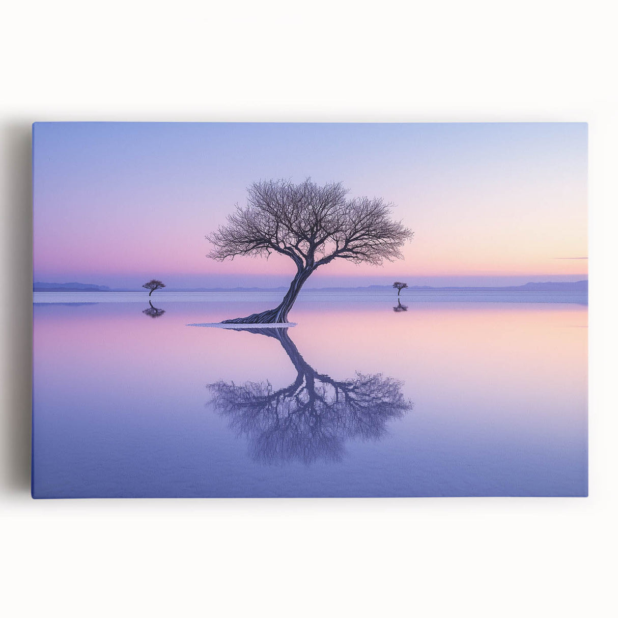 Bring a sense of tranquility into your space with this mesmerizing tree art print, featuring a breathtaking tree reflecting on calm waters. The soft hues of purple, pink, and light blue create a peaceful ambiance, making this landscape art print an exquisite addition to any home or office. This nature-inspired wall art is perfect for those who appreciate minimalistic beauty and the serenity of untouched landscapes.