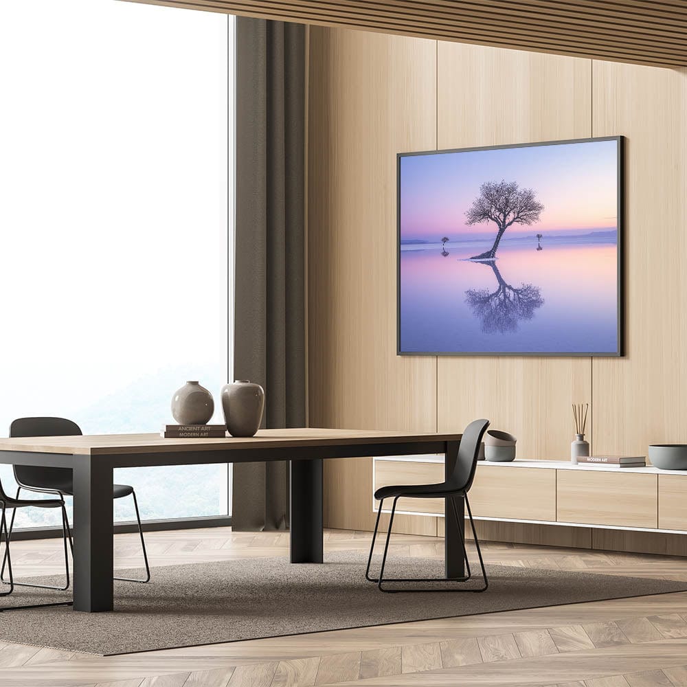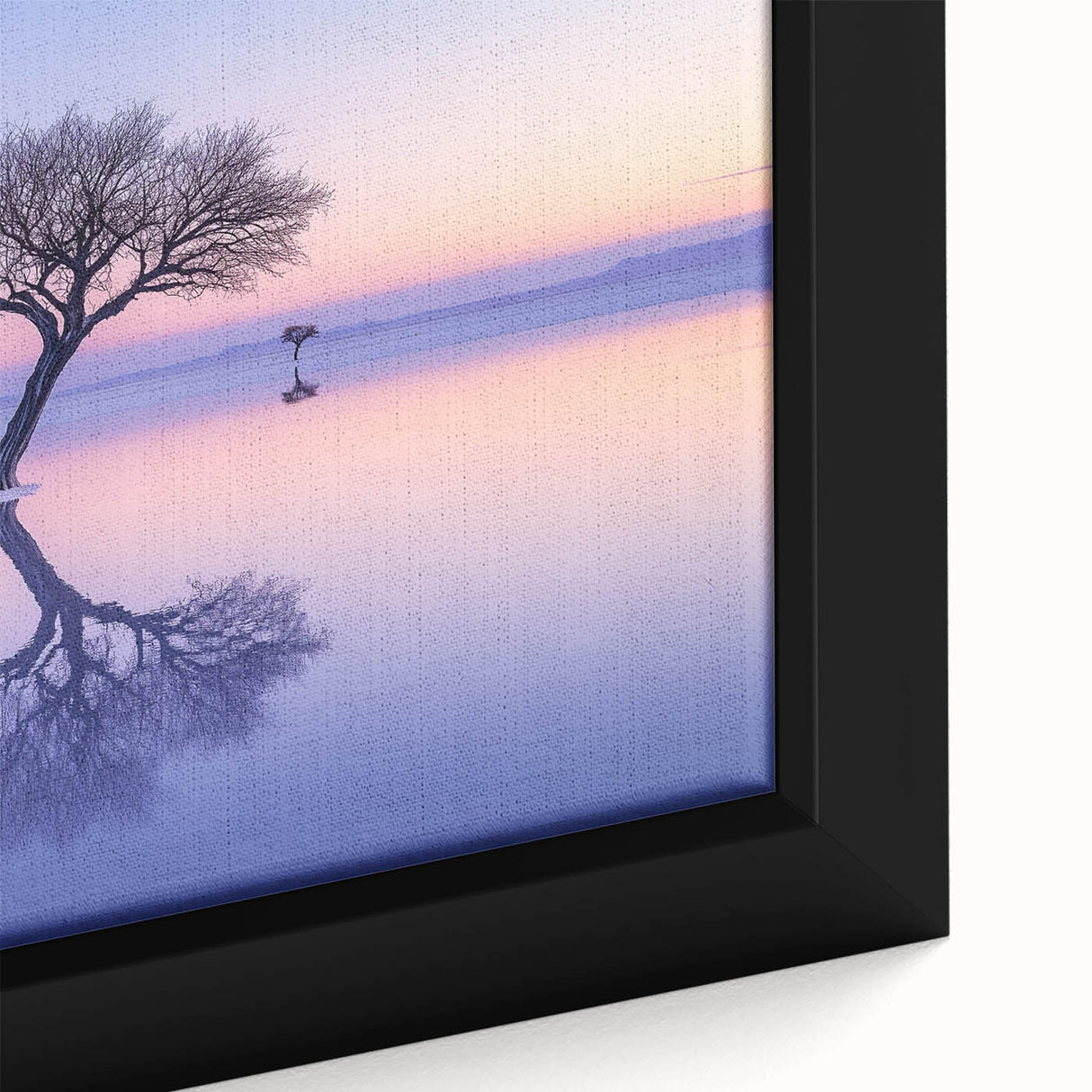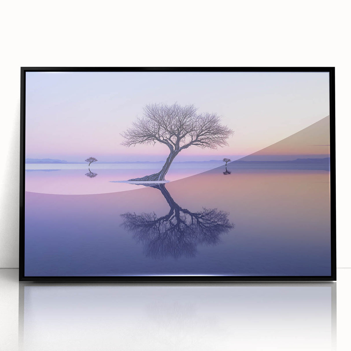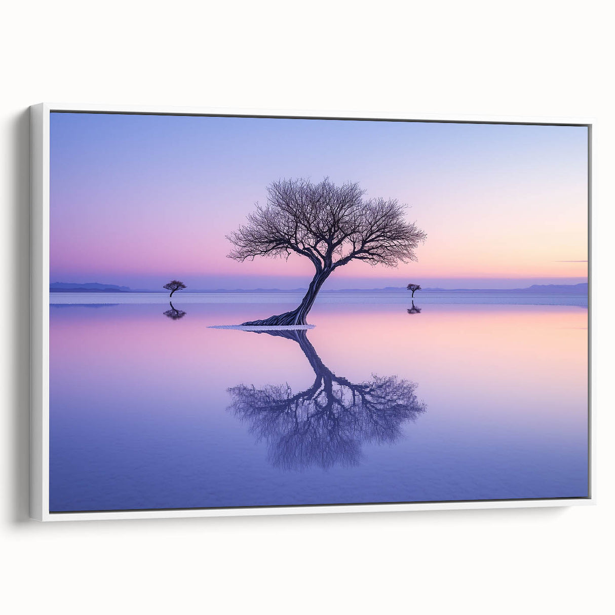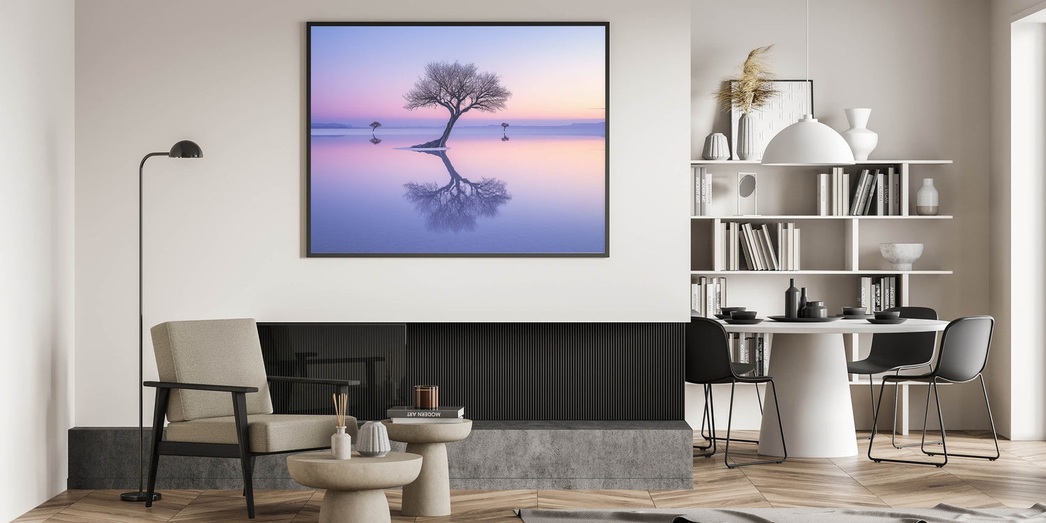 Bring a sense of tranquility into your space with this mesmerizing tree art print, featuring a breathtaking tree reflecting on calm waters. The soft hues of purple, pink, and light blue create a peaceful ambiance, making this landscape art print an exquisite addition to any home or office. This nature-inspired wall art is perfect for those who appreciate minimalistic beauty and the serenity of untouched landscapes.