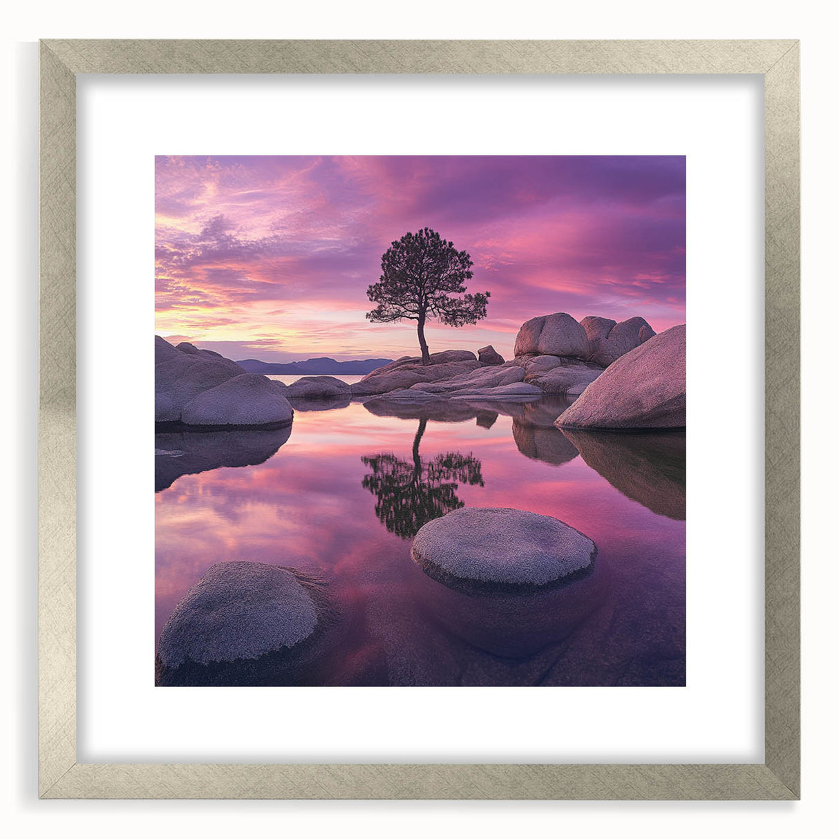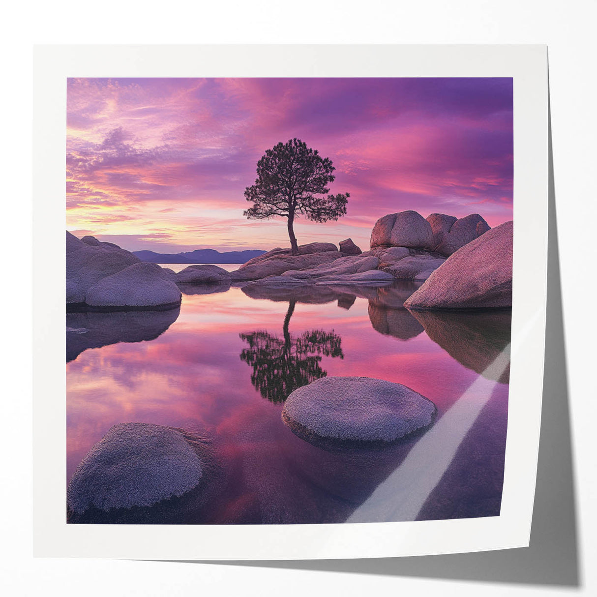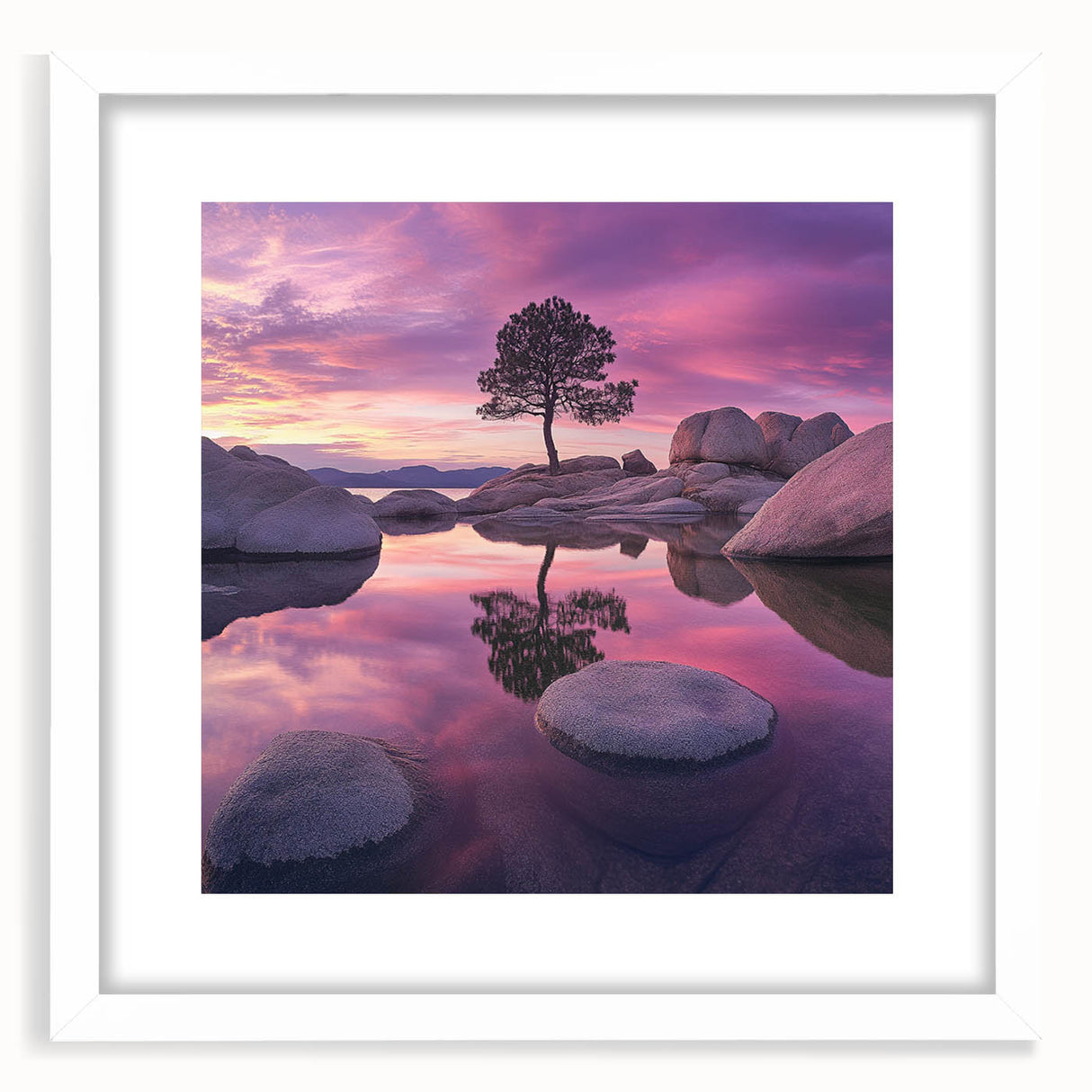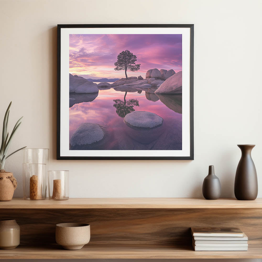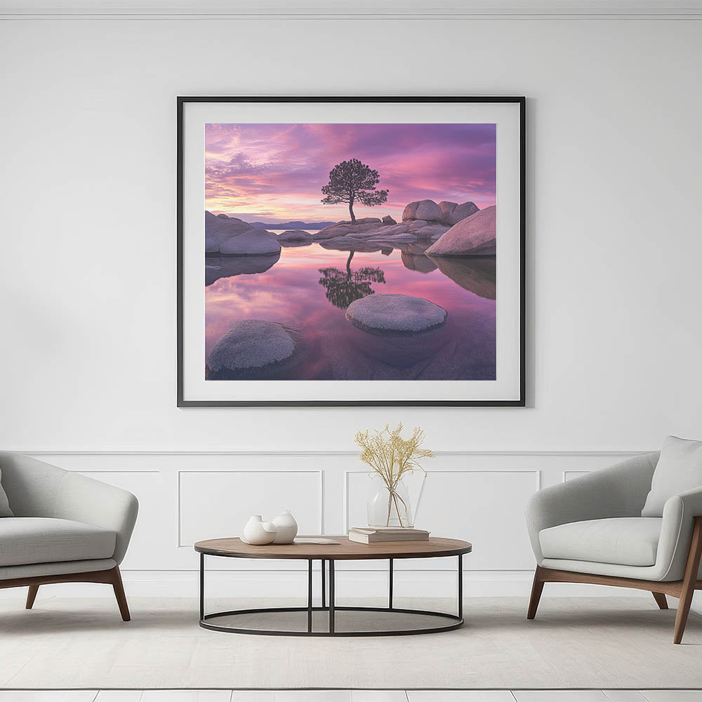 Experience the beauty of tranquility with this tree art print, showcasing a lone tree reflected in calm waters beneath a breathtaking sunset sky. The soft hues of plum, pink, and warm orange blend seamlessly with the rugged rocks, creating a nature-inspired wall art piece that evokes peace and serenity.
