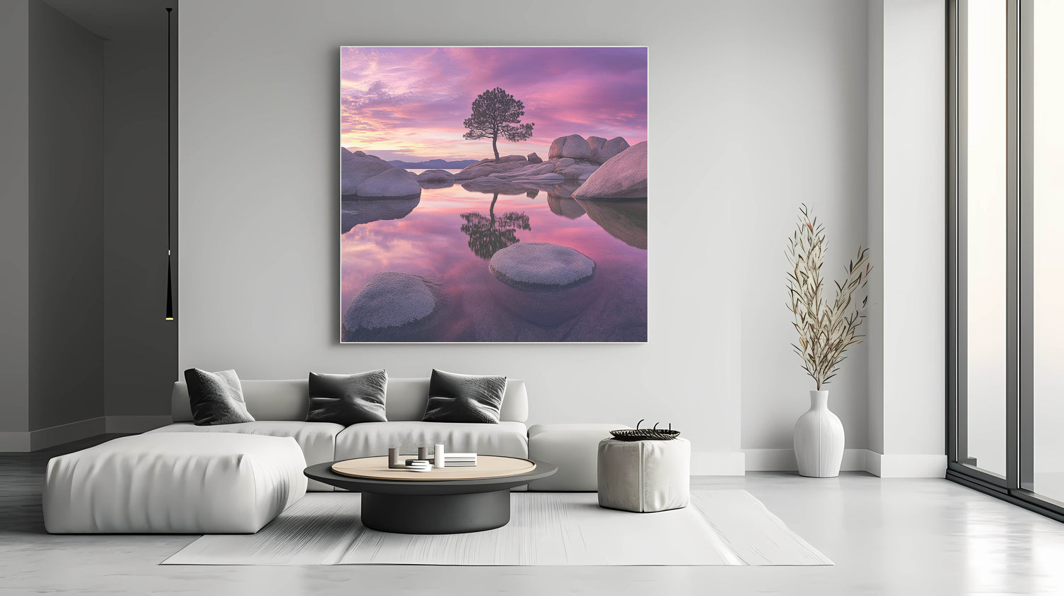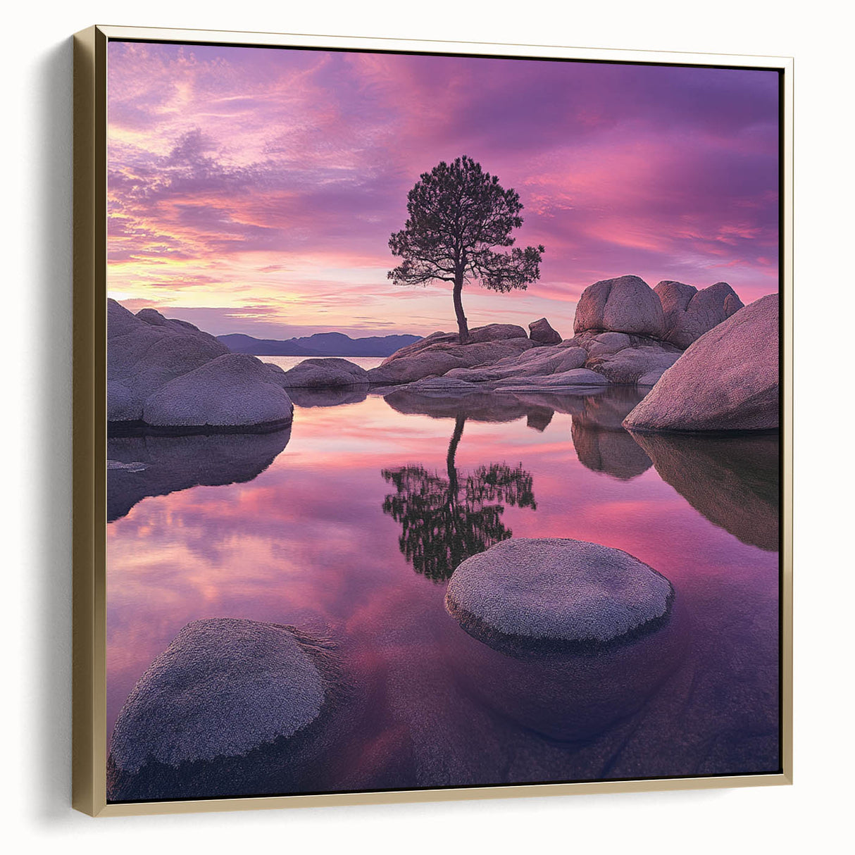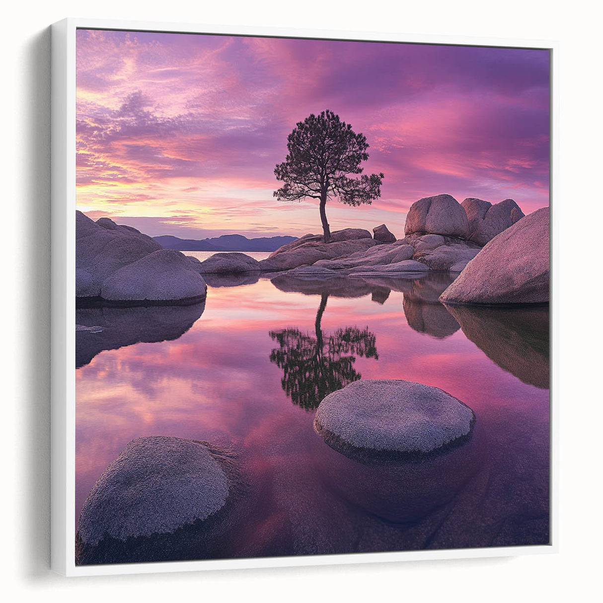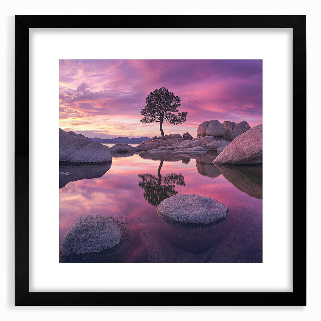 Experience the beauty of tranquility with this tree art print, showcasing a lone tree reflected in calm waters beneath a breathtaking sunset sky. The soft hues of plum, pink, and warm orange blend seamlessly with the rugged rocks, creating a nature-inspired wall art piece that evokes peace and serenity.