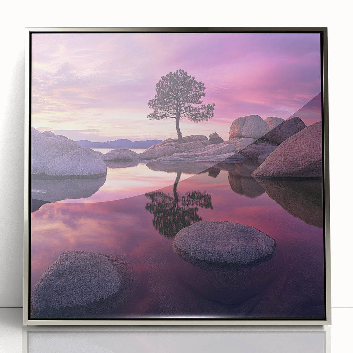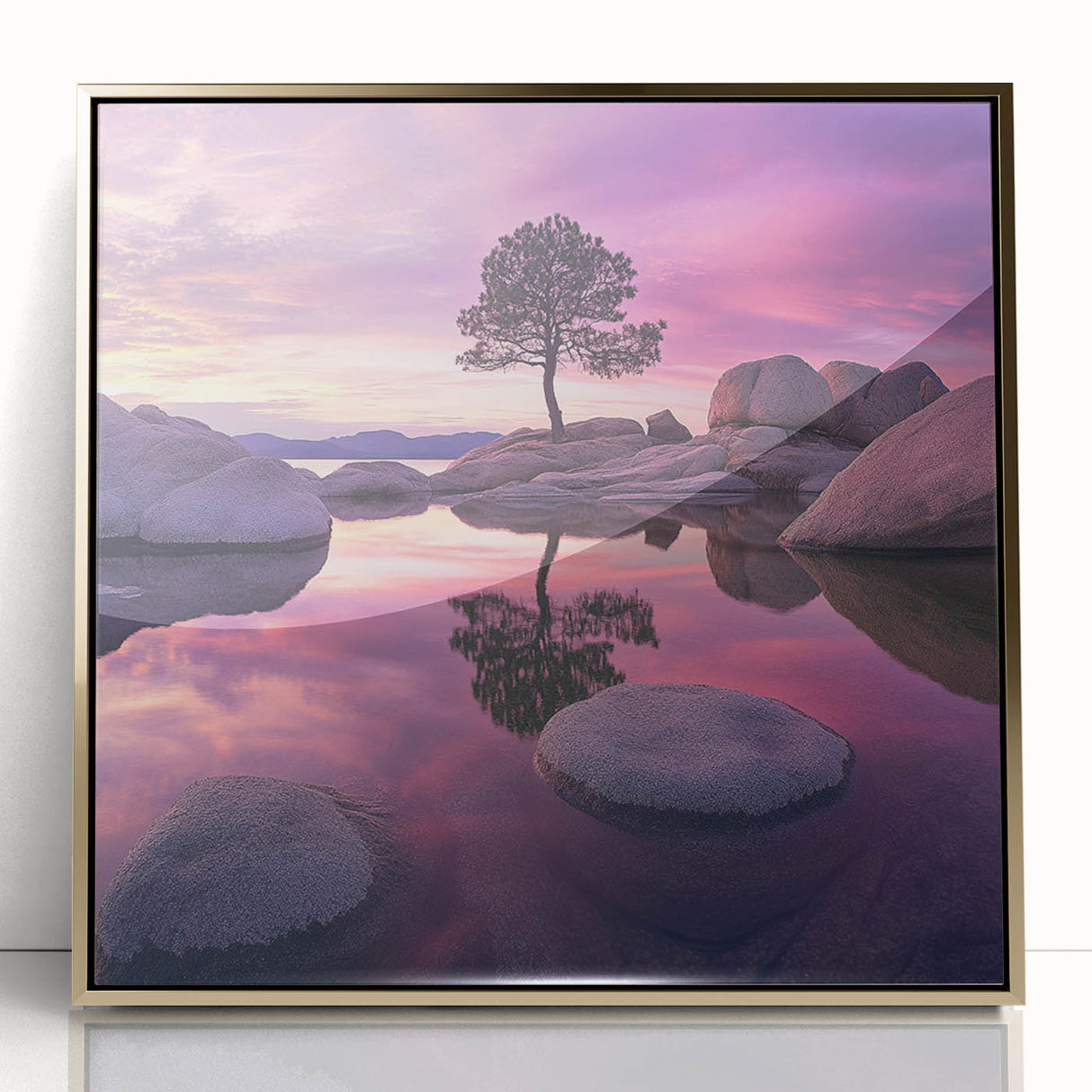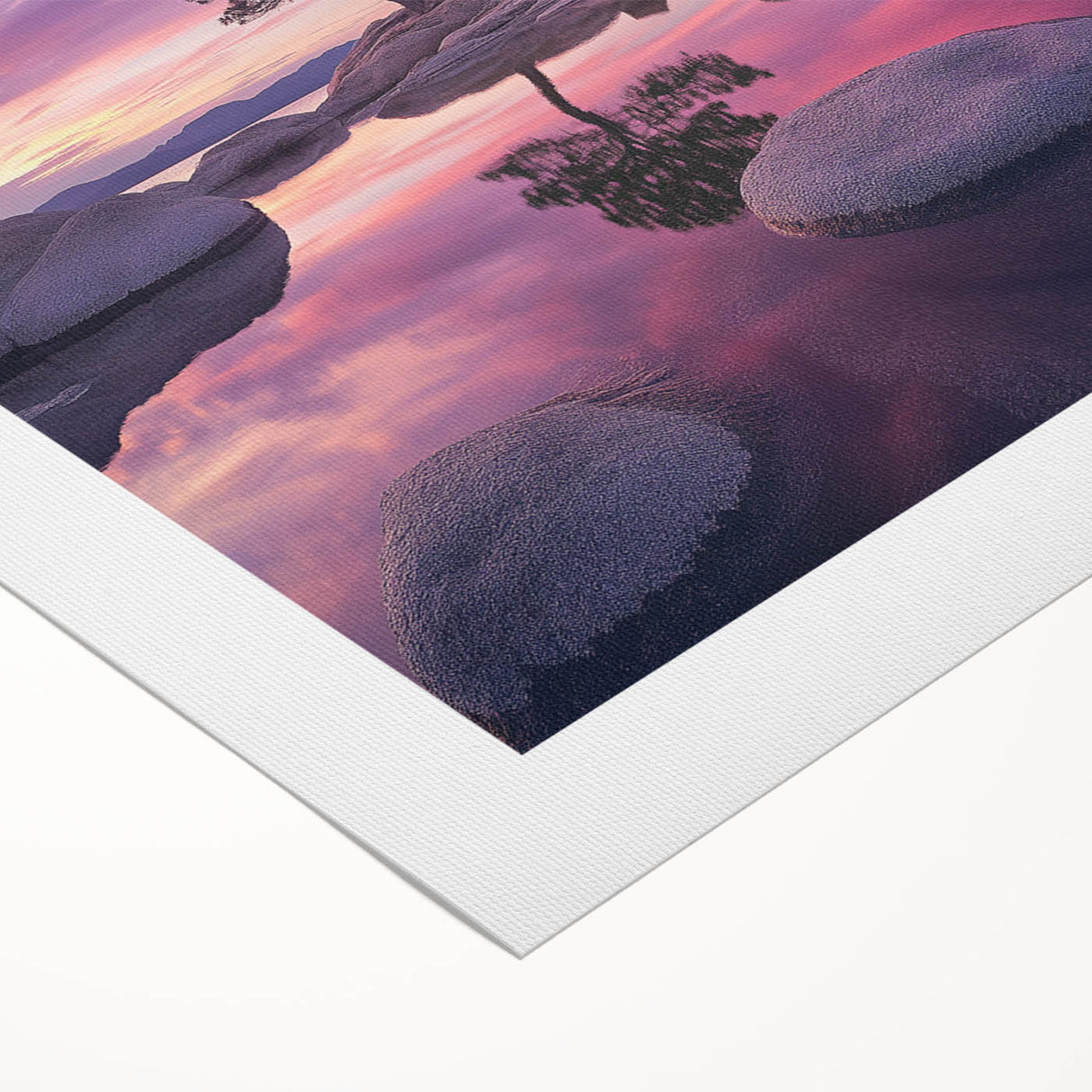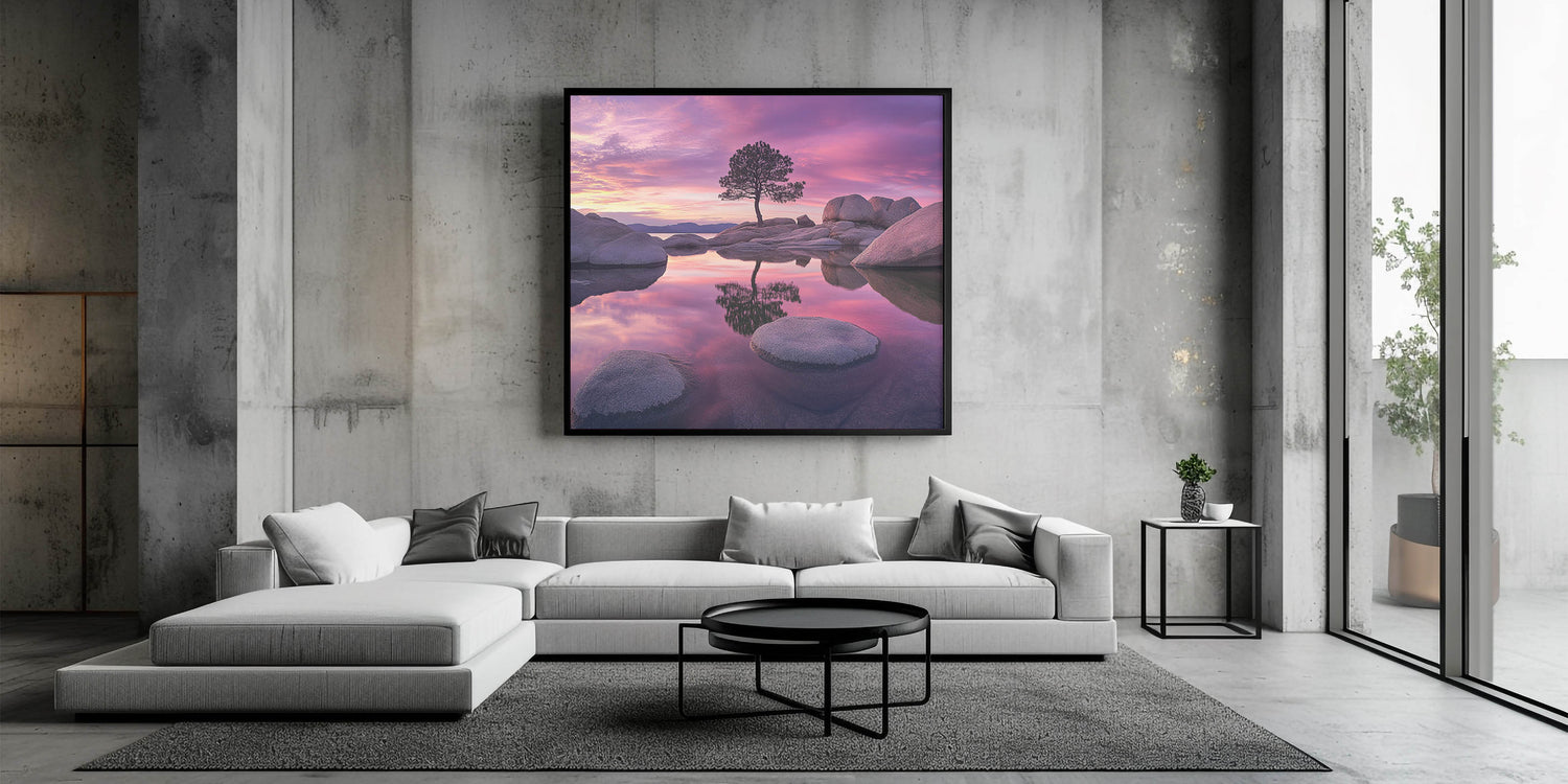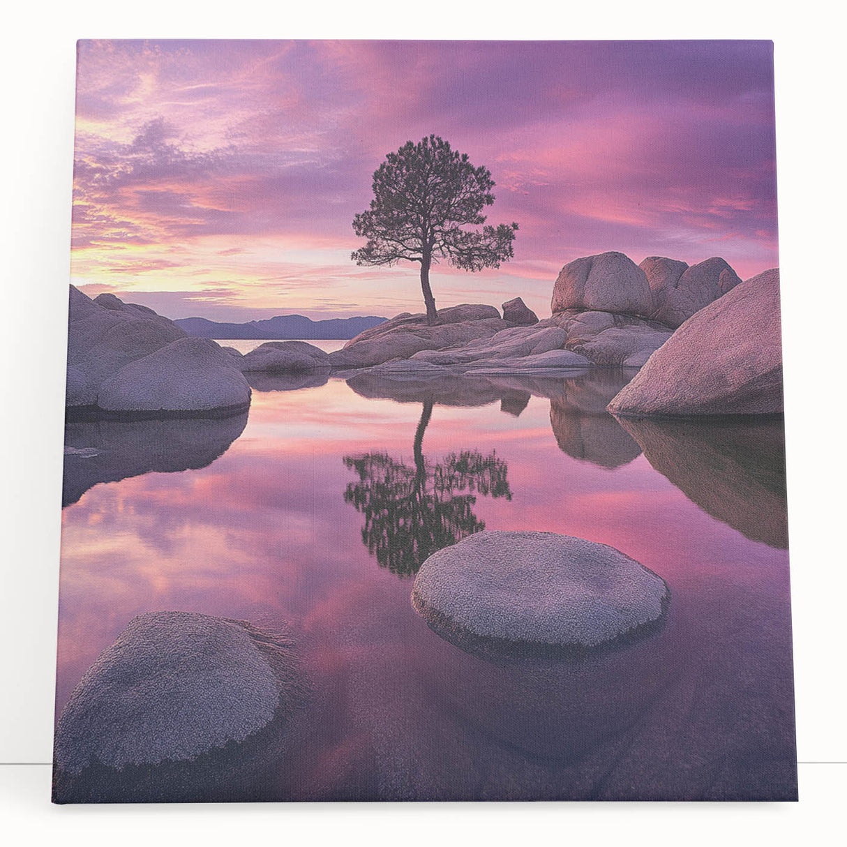 Experience the beauty of tranquility with this tree art print, showcasing a lone tree reflected in calm waters beneath a breathtaking sunset sky. The soft hues of plum, pink, and warm orange blend seamlessly with the rugged rocks, creating a nature-inspired wall art piece that evokes peace and serenity.