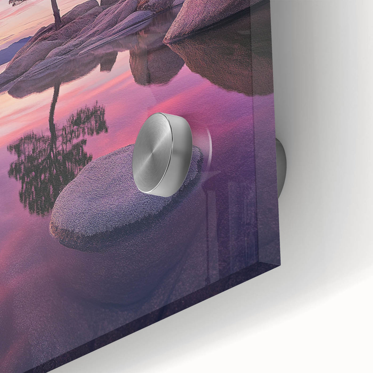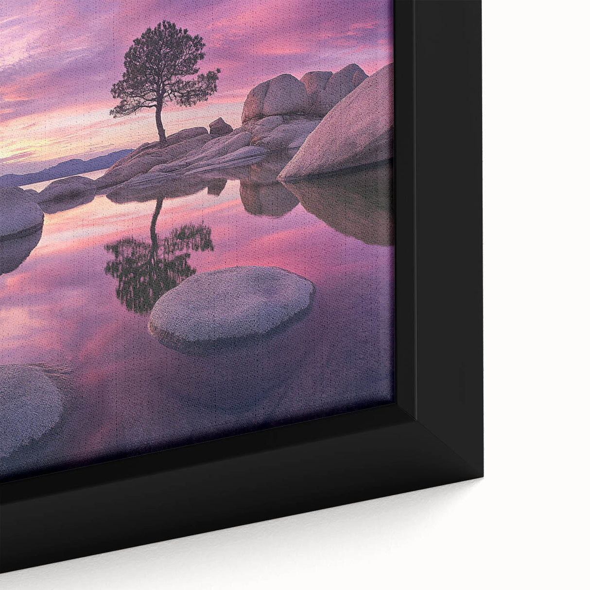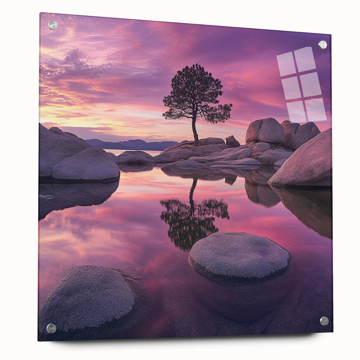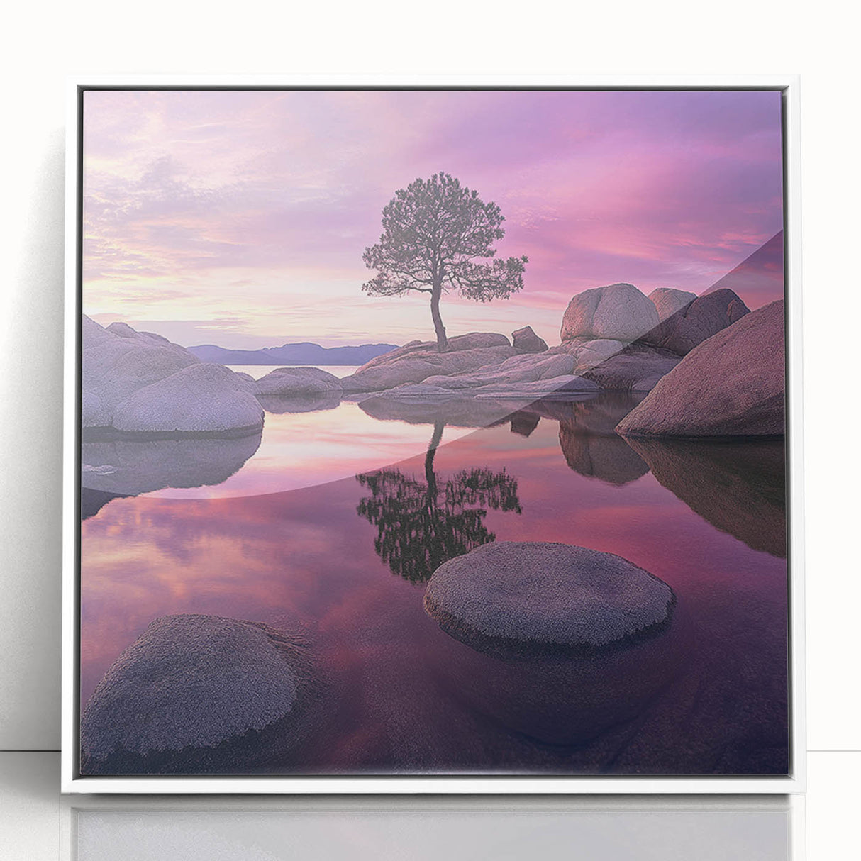 Experience the beauty of tranquility with this tree art print, showcasing a lone tree reflected in calm waters beneath a breathtaking sunset sky. The soft hues of plum, pink, and warm orange blend seamlessly with the rugged rocks, creating a nature-inspired wall art piece that evokes peace and serenity.