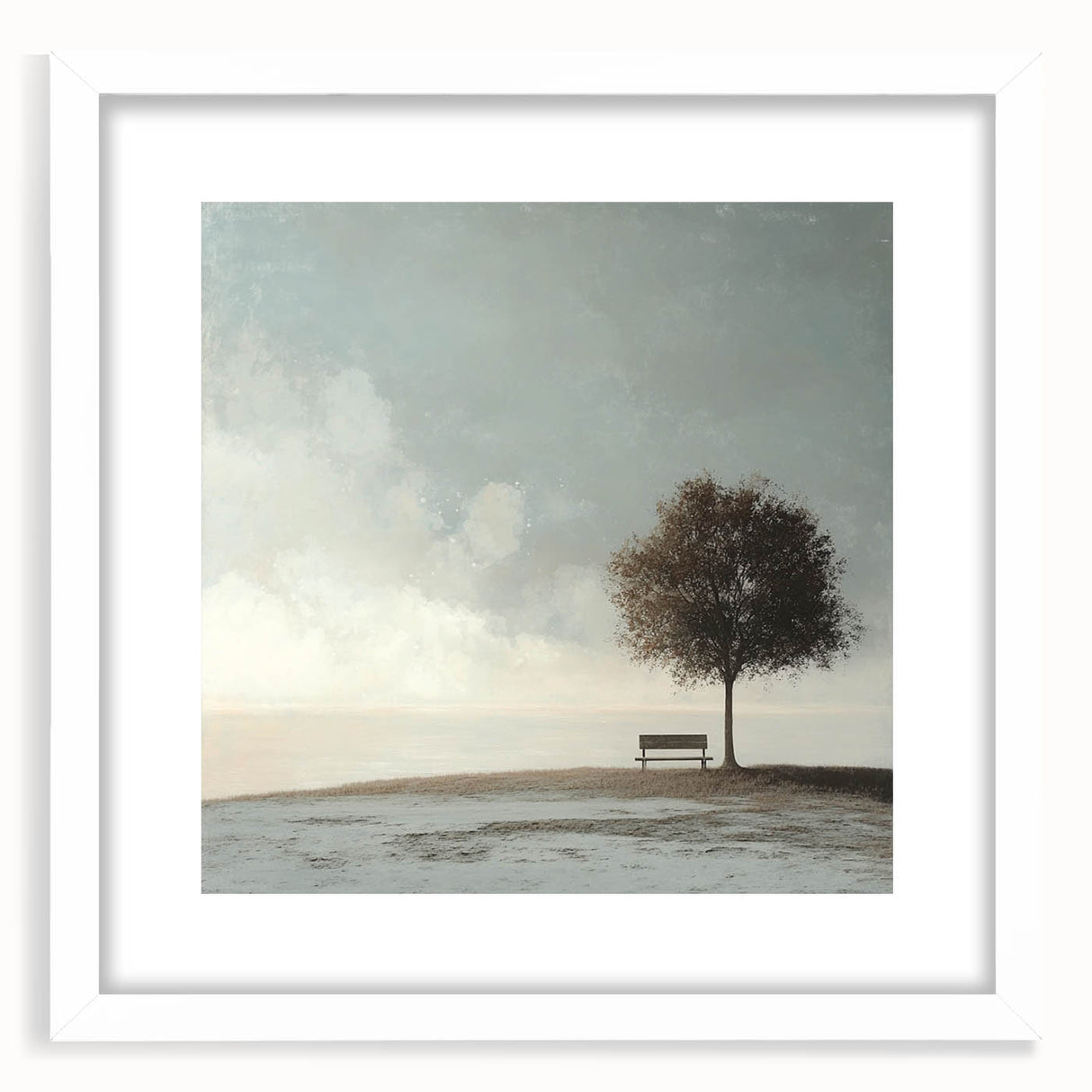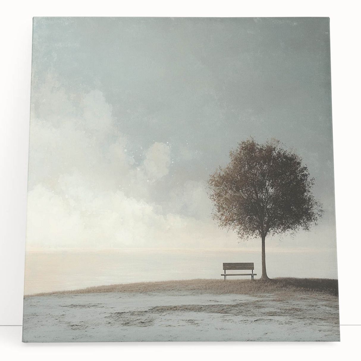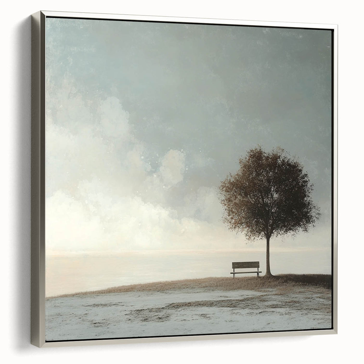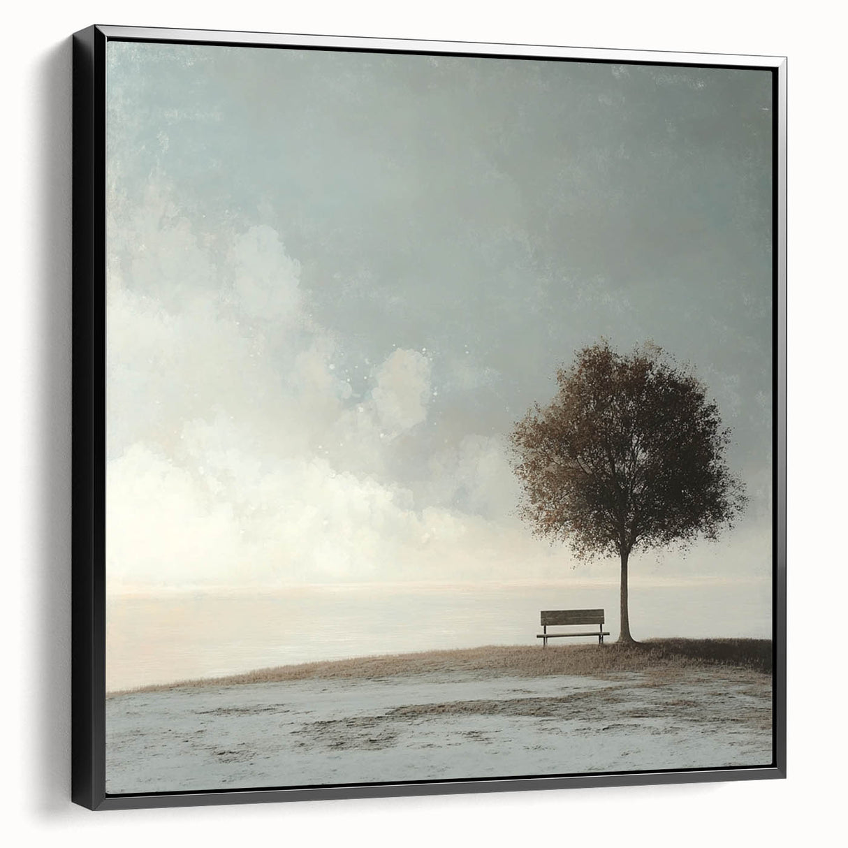 Create a peaceful atmosphere in your space with this Tree Art Print, featuring a lone tree standing beside a quiet bench, overlooking a misty body of water. The soft, muted color palette and delicate textures evoke a sense of solitude and reflection, making this Nature-Inspired Wall Art perfect for contemporary, minimalist, or rustic interiors. The subtle interplay of light and shadows enhances the dreamlike ambiance, offering a moment of tranquility in any room.