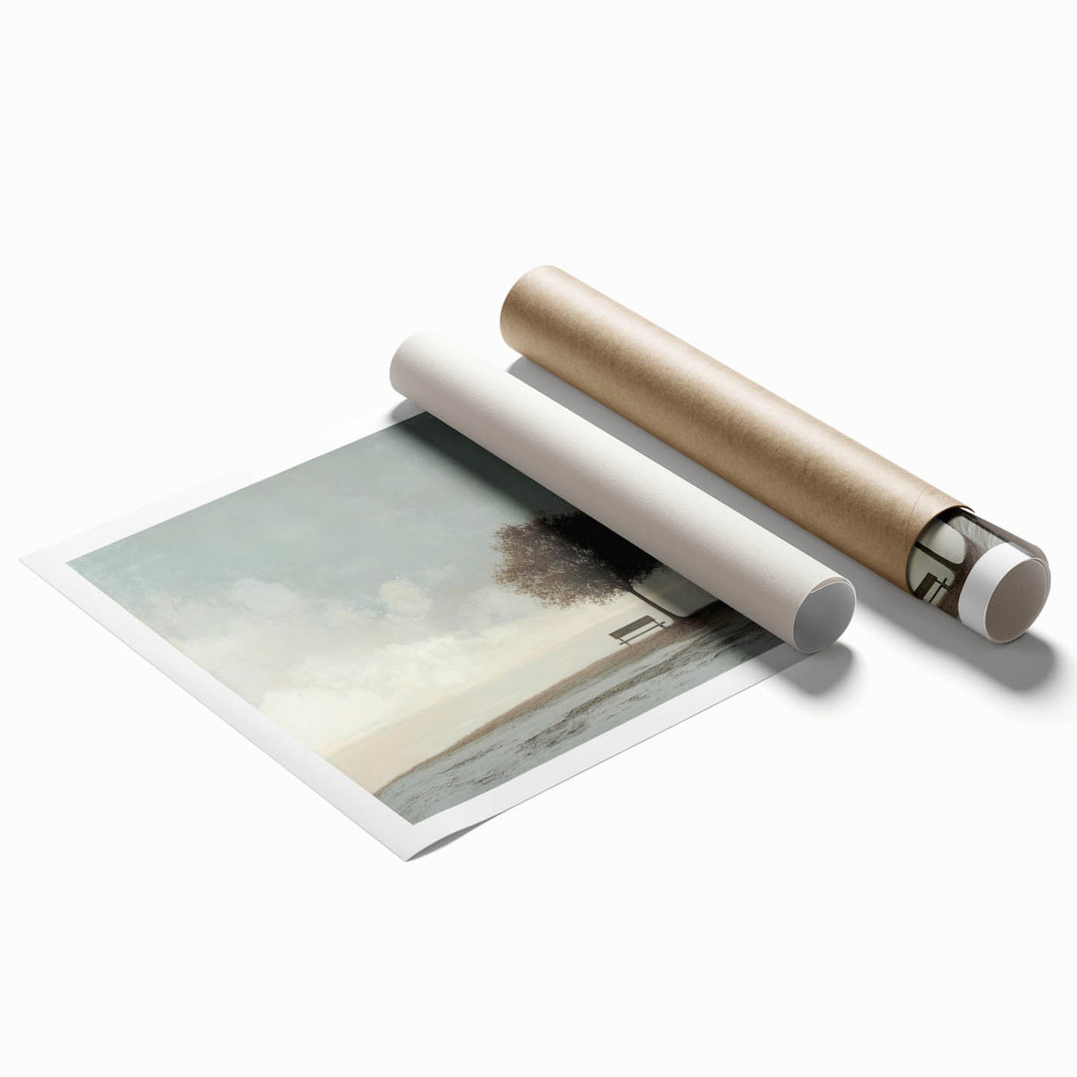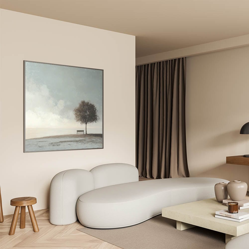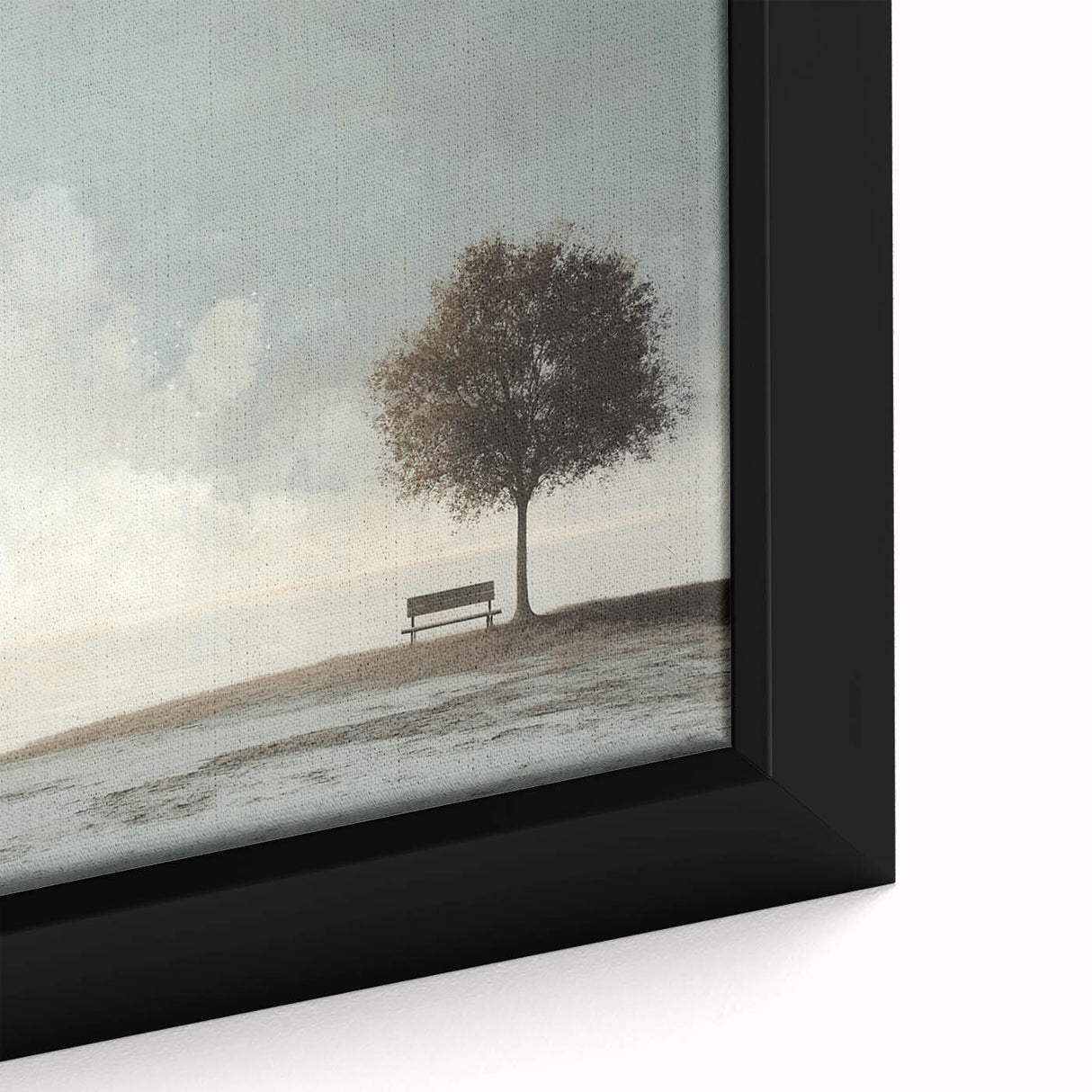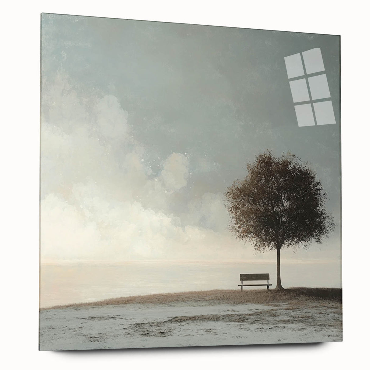 Create a peaceful atmosphere in your space with this Tree Art Print, featuring a lone tree standing beside a quiet bench, overlooking a misty body of water. The soft, muted color palette and delicate textures evoke a sense of solitude and reflection, making this Nature-Inspired Wall Art perfect for contemporary, minimalist, or rustic interiors. The subtle interplay of light and shadows enhances the dreamlike ambiance, offering a moment of tranquility in any room.