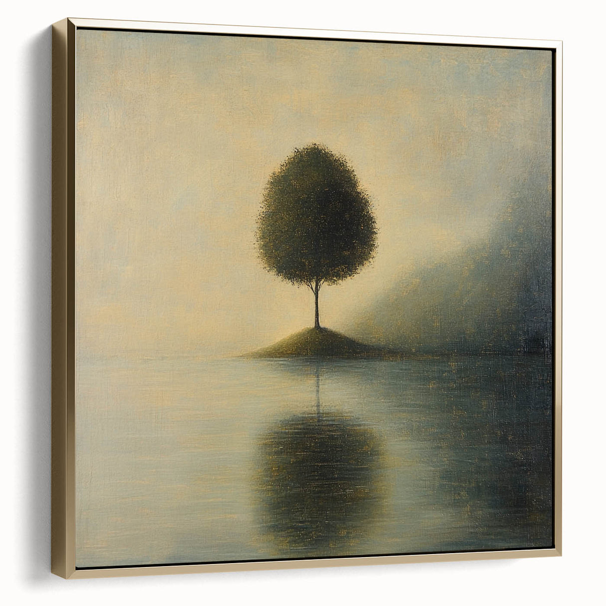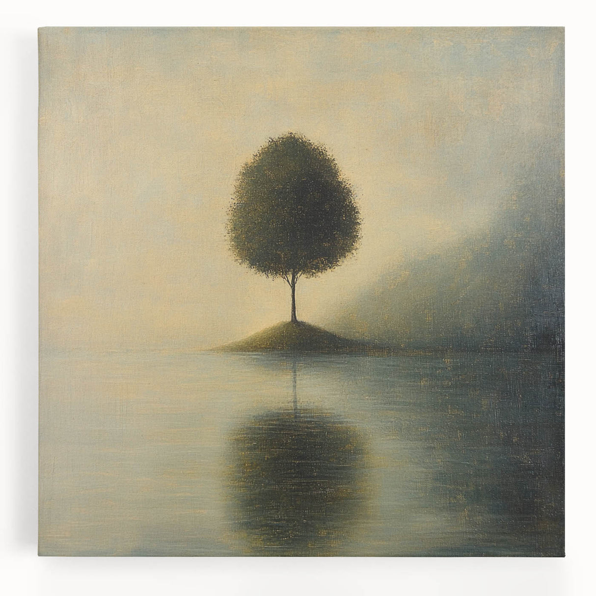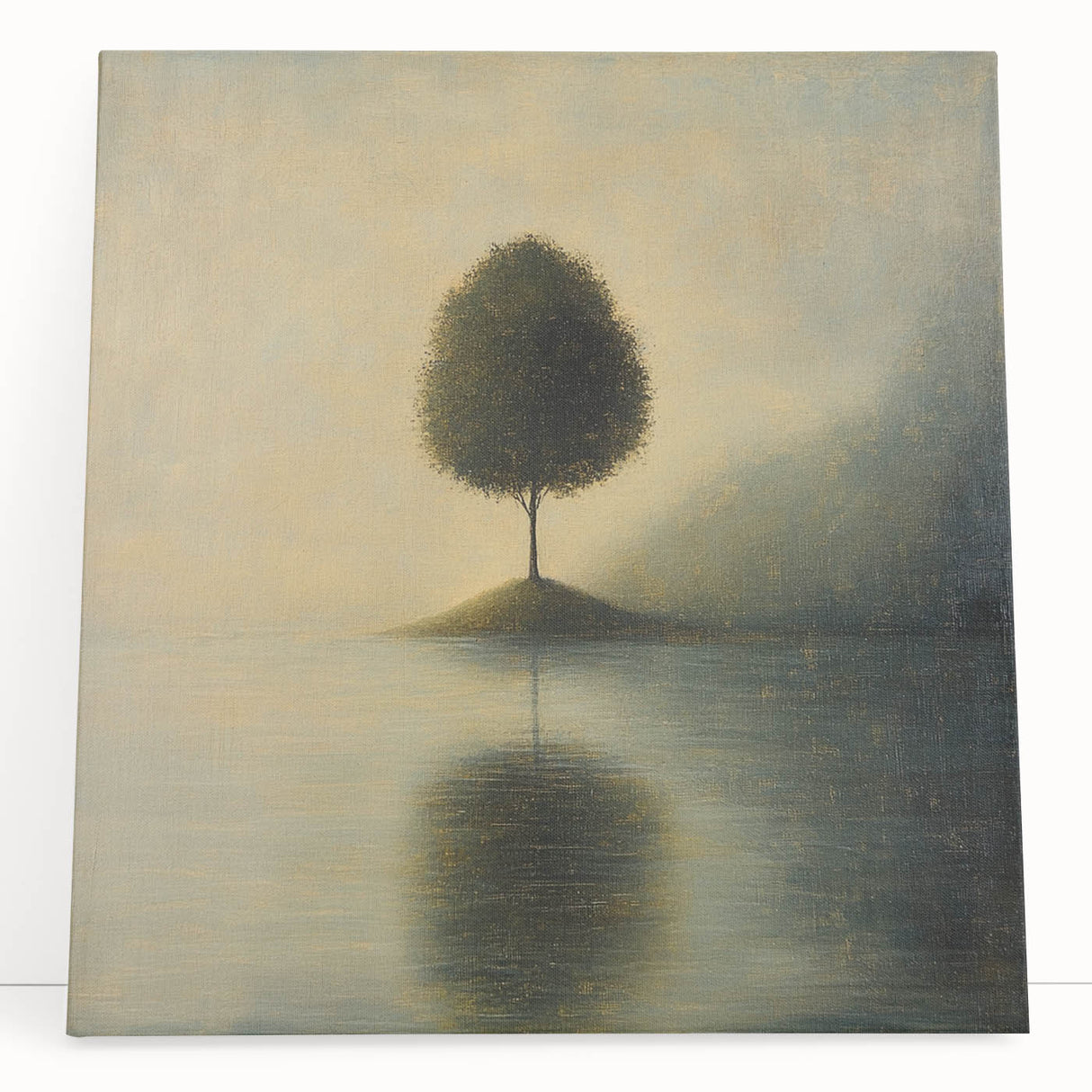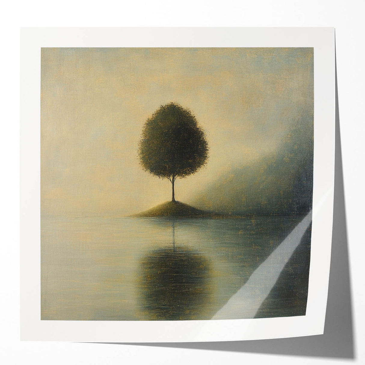 Capture the beauty of stillness with this Tree Art Print, featuring a solitary tree gently reflected in the calm waters of a misty lake. The soft, muted color palette of beige, green, and gold creates a dreamlike quality, making this Nature-Inspired Wall Art an ideal piece for minimalist, modern, and rustic interiors. The delicate brushstrokes and serene composition evoke a sense of peace and introspection.