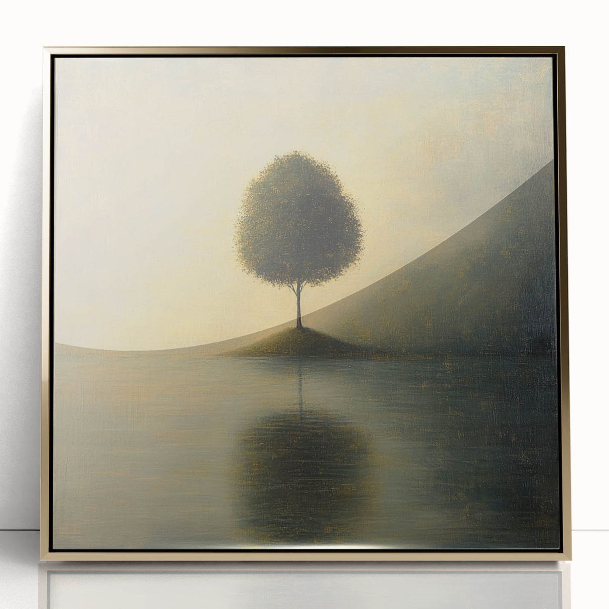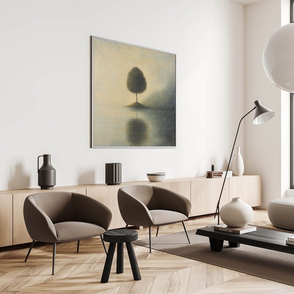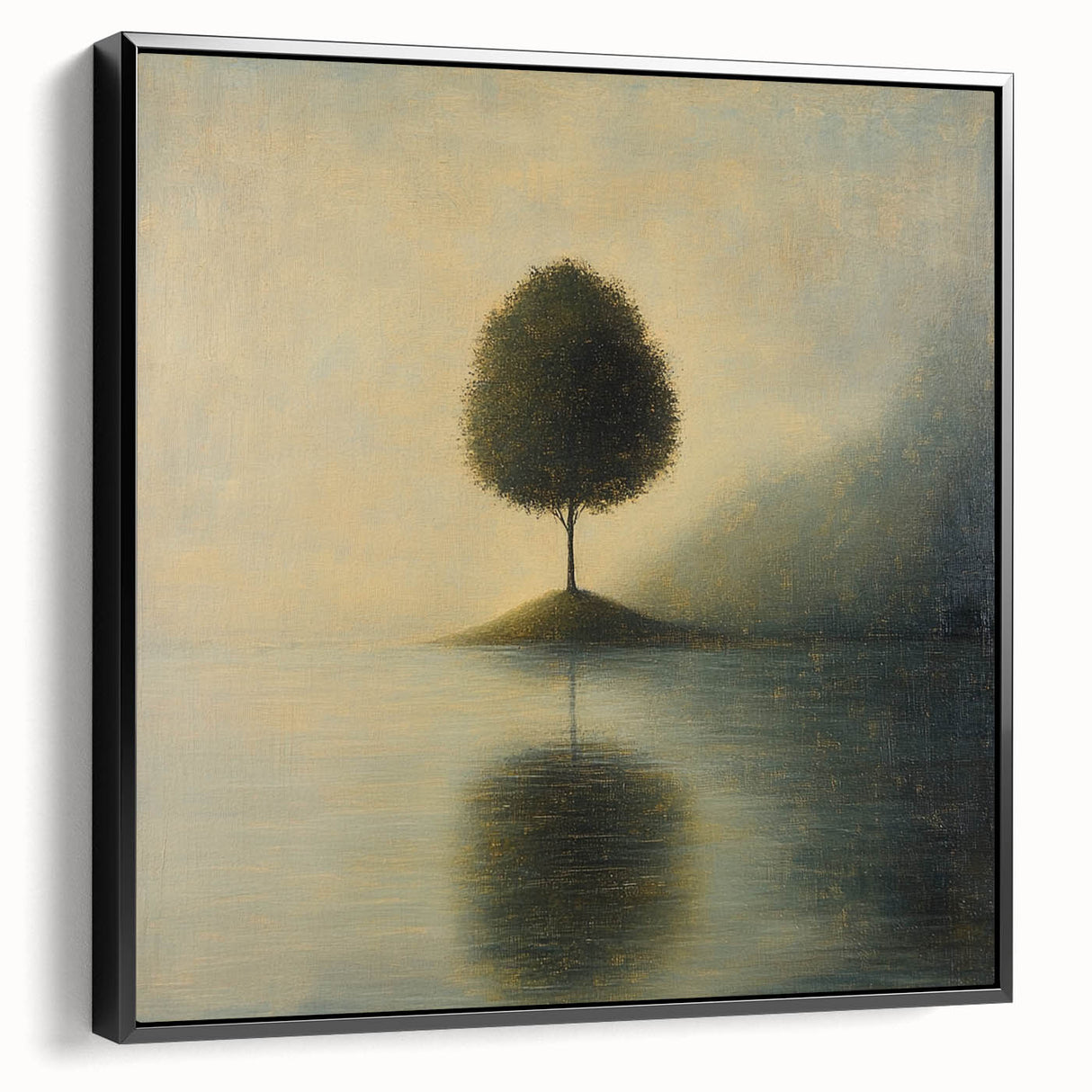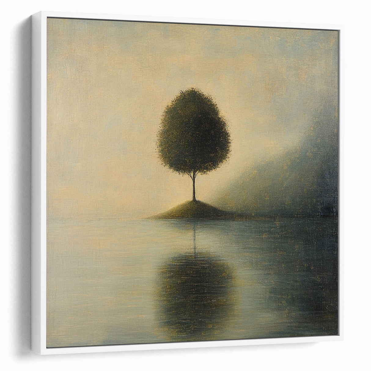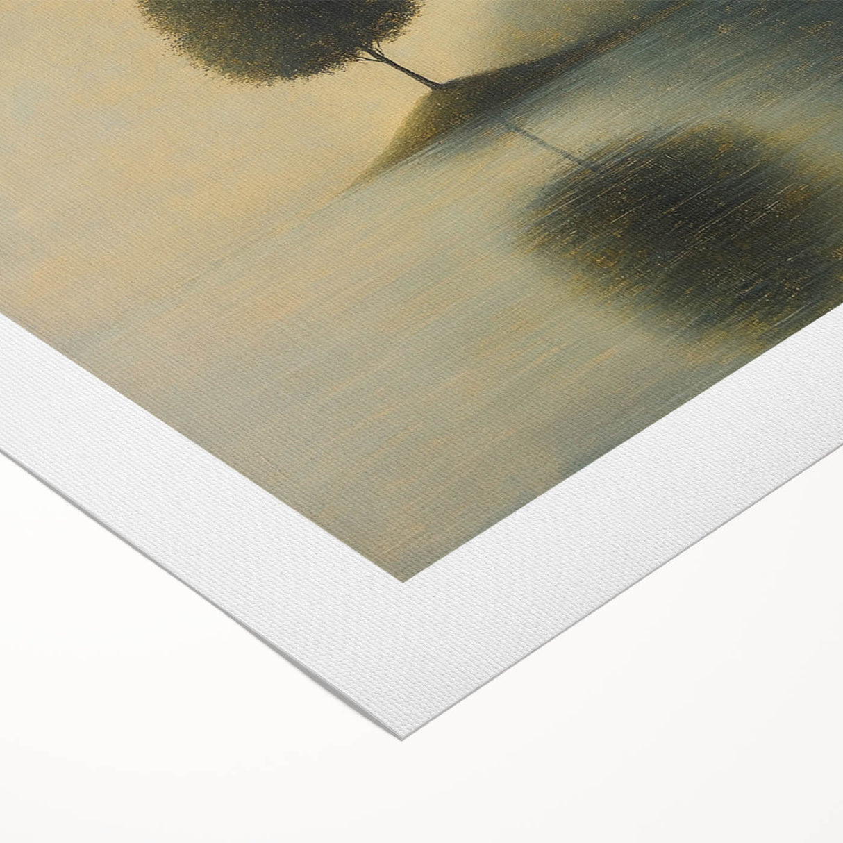 Capture the beauty of stillness with this Tree Art Print, featuring a solitary tree gently reflected in the calm waters of a misty lake. The soft, muted color palette of beige, green, and gold creates a dreamlike quality, making this Nature-Inspired Wall Art an ideal piece for minimalist, modern, and rustic interiors. The delicate brushstrokes and serene composition evoke a sense of peace and introspection.