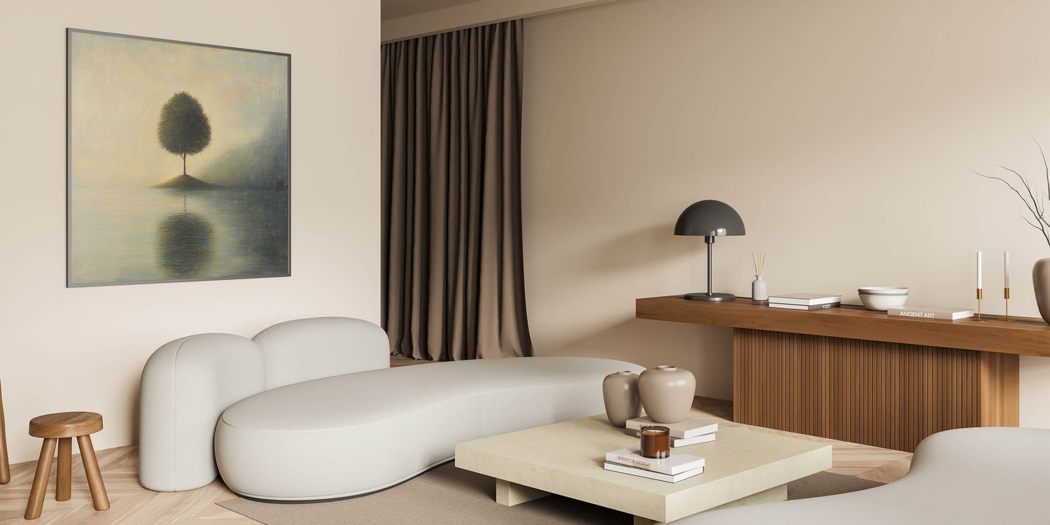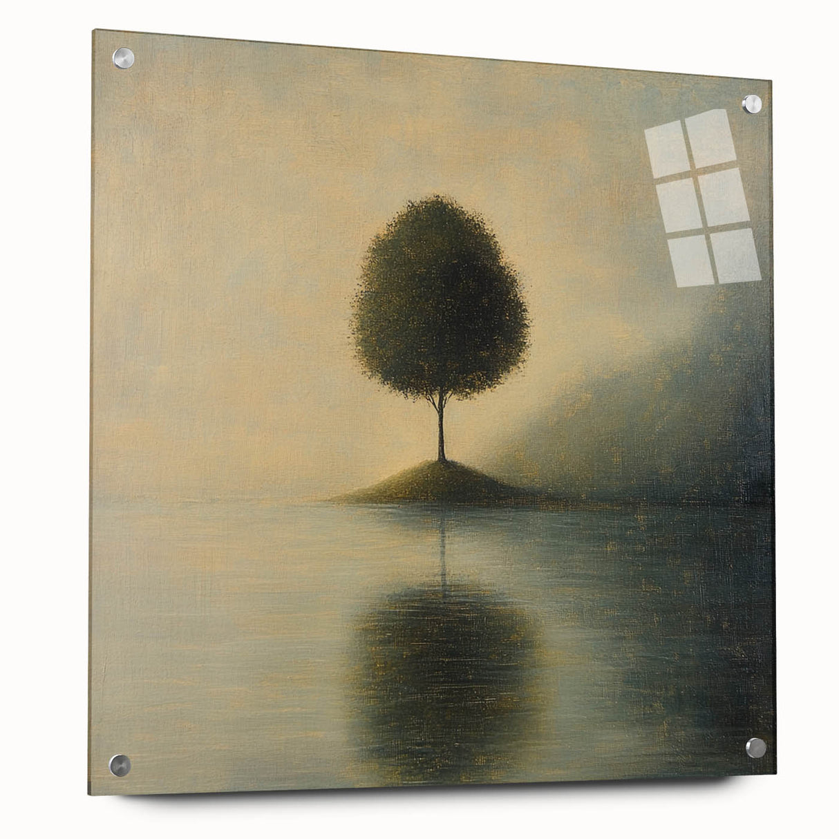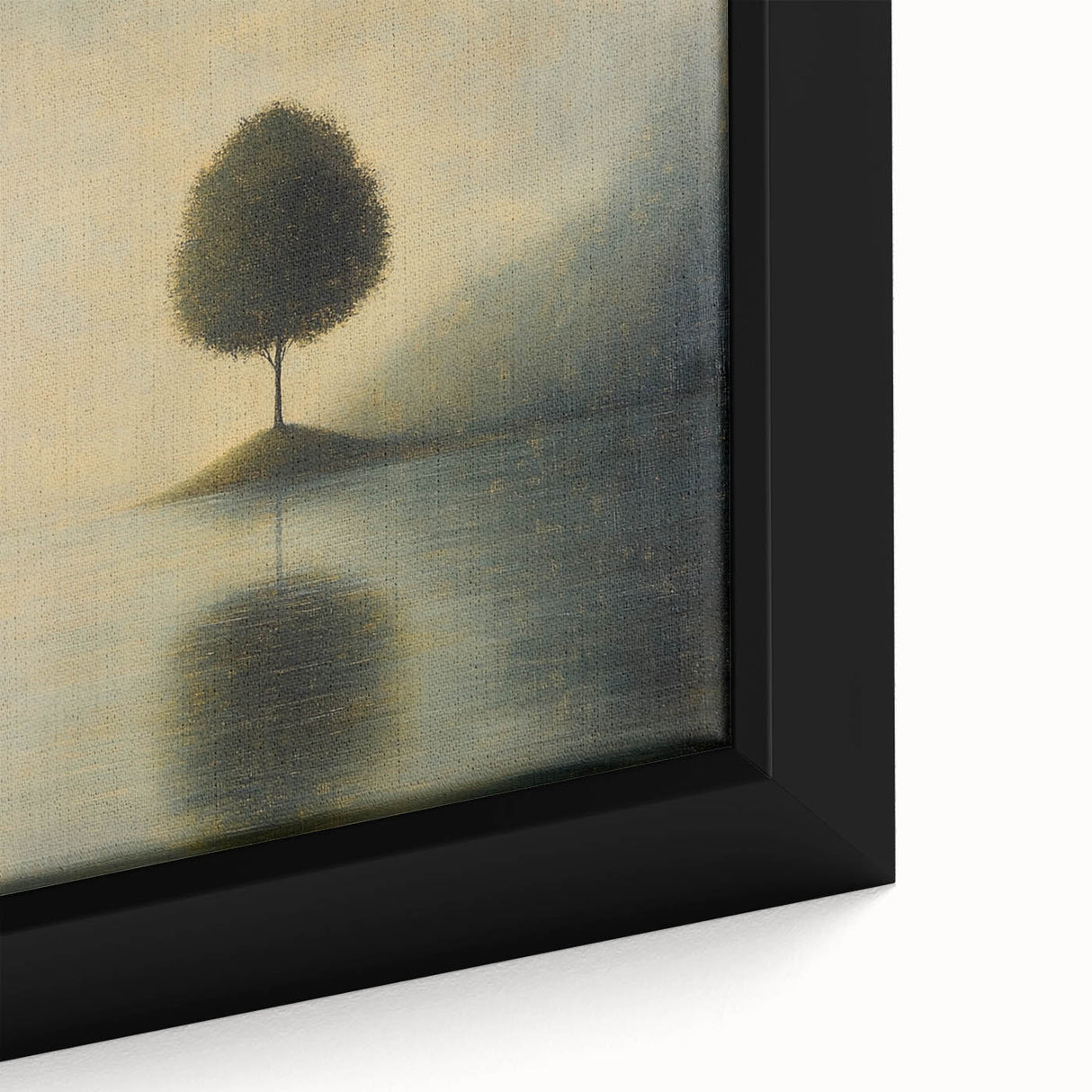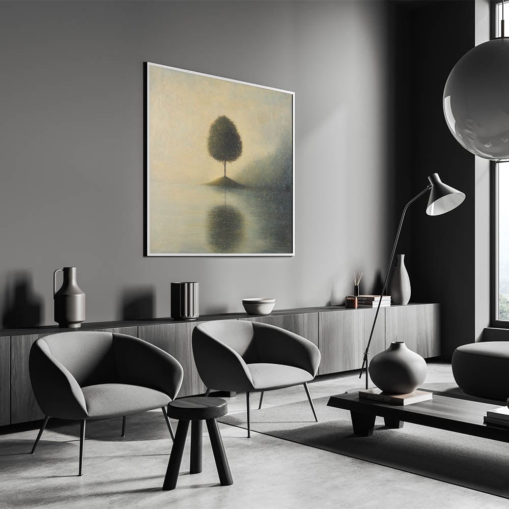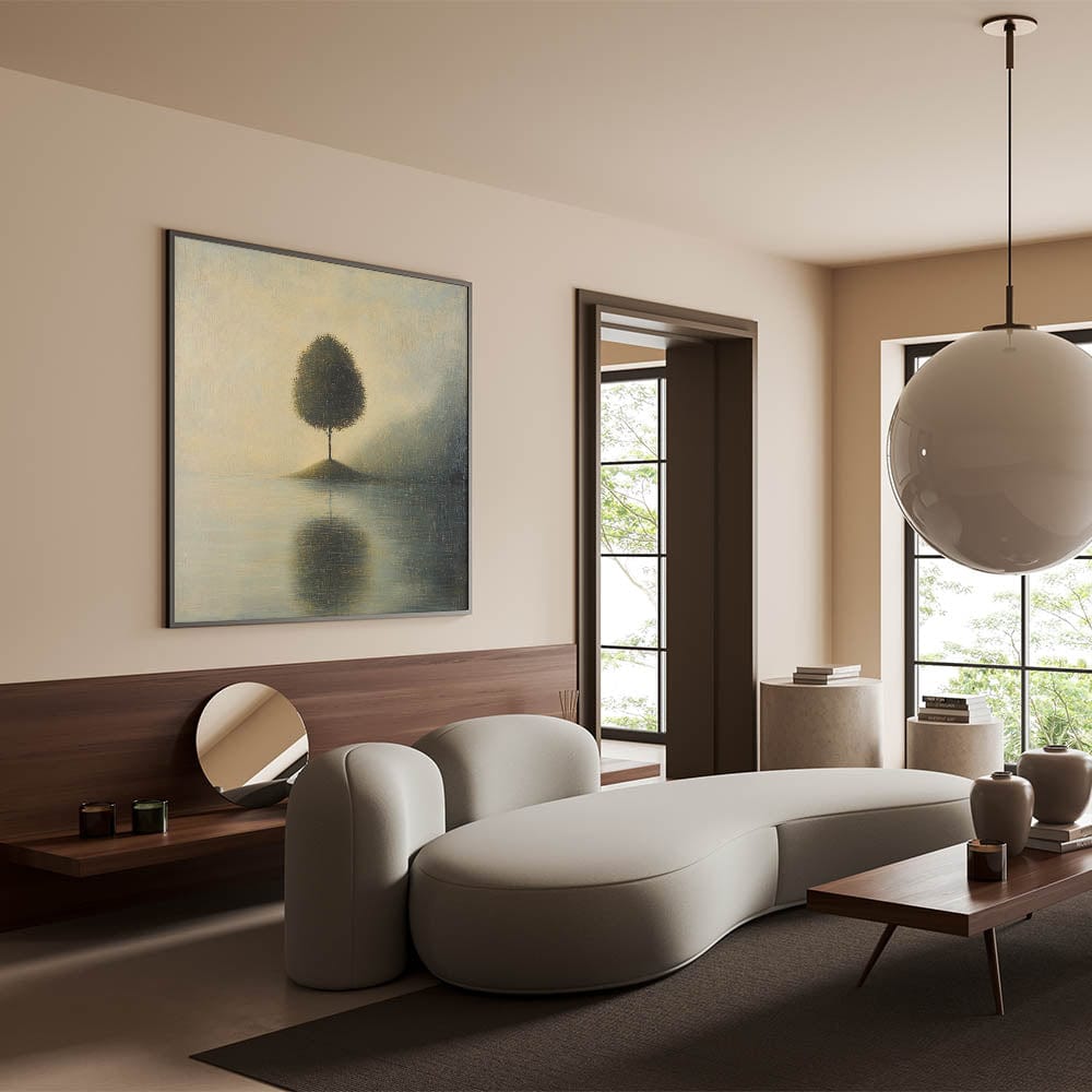 Capture the beauty of stillness with this Tree Art Print, featuring a solitary tree gently reflected in the calm waters of a misty lake. The soft, muted color palette of beige, green, and gold creates a dreamlike quality, making this Nature-Inspired Wall Art an ideal piece for minimalist, modern, and rustic interiors. The delicate brushstrokes and serene composition evoke a sense of peace and introspection.