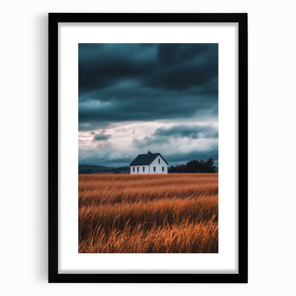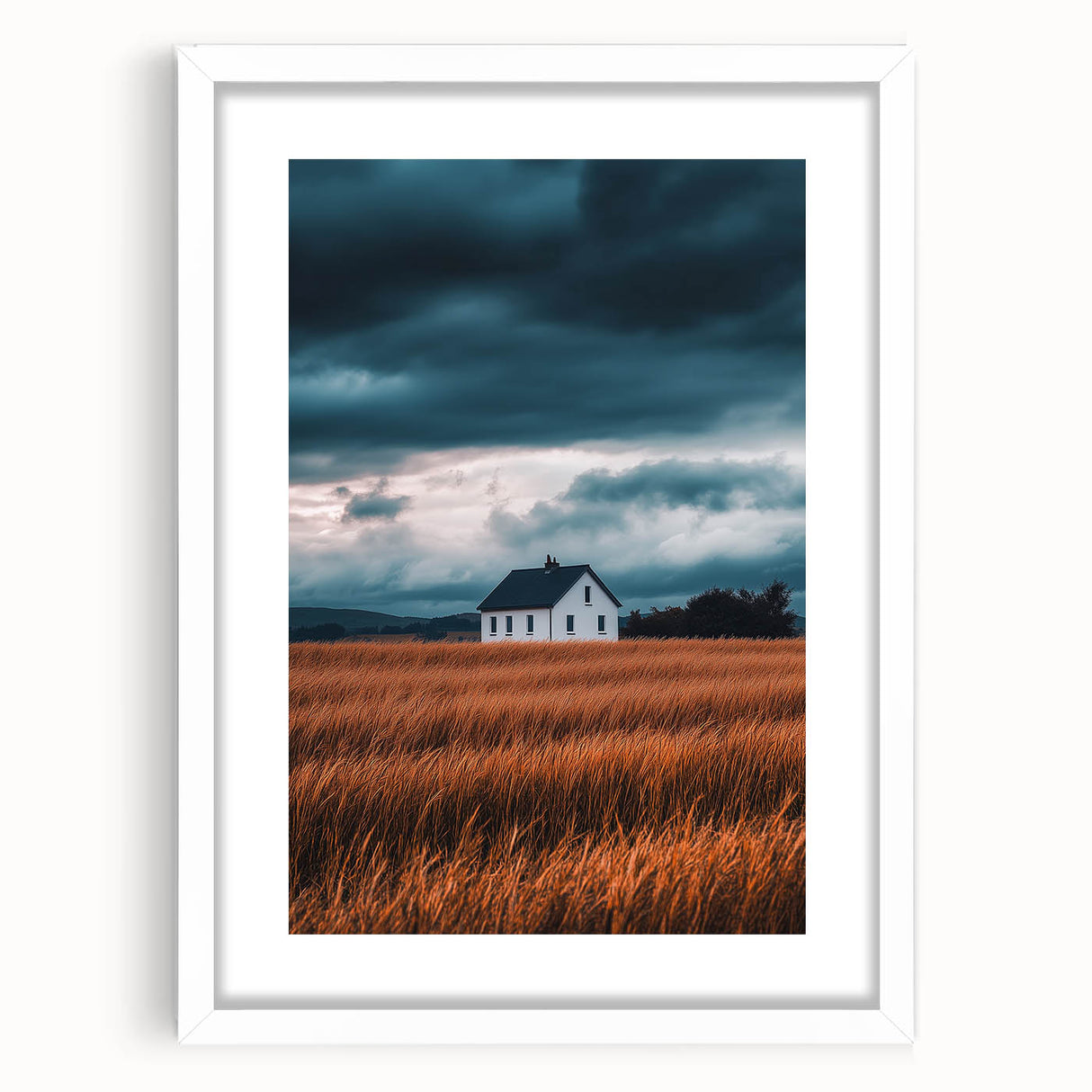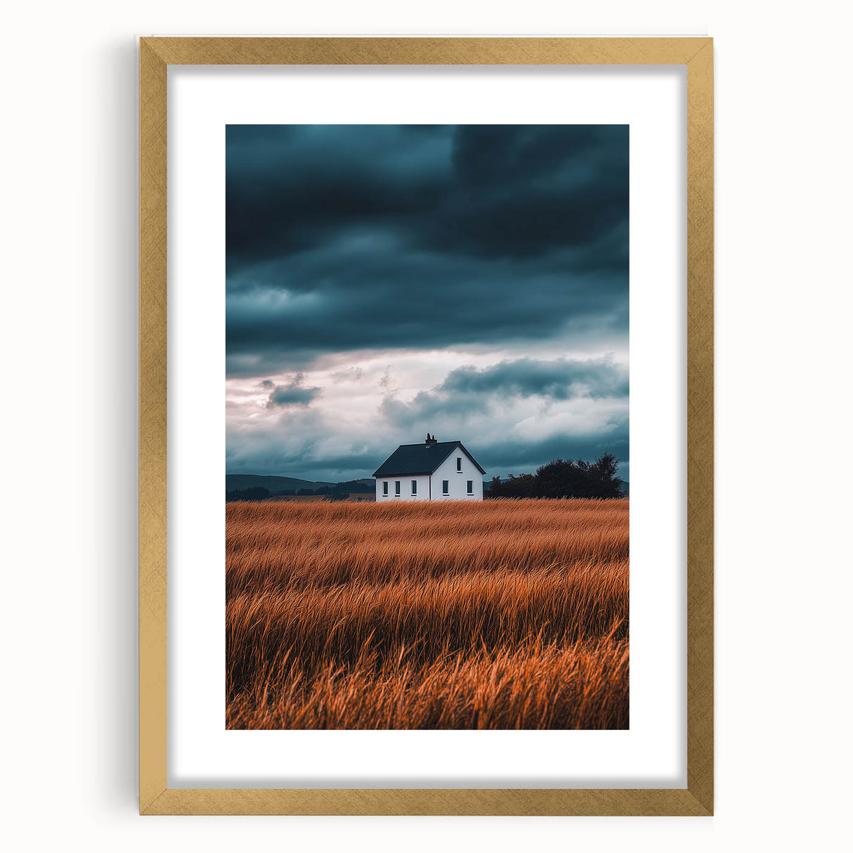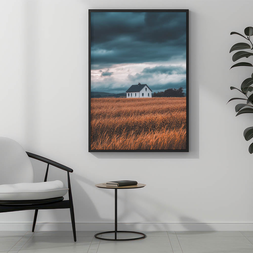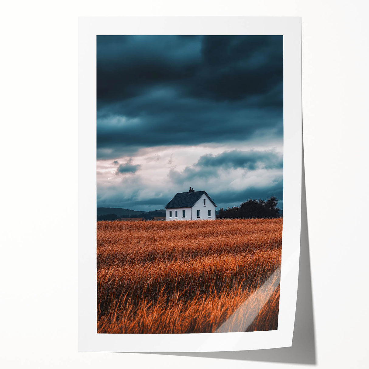 Immerse yourself in the powerful beauty of nature with this landscape art print, capturing a solitary white house amidst golden fields beneath a dramatic stormy sky. The contrast between deep blue storm clouds and warm brown fields creates a stunning balance of tranquility and intensity, making this a perfect nature-inspired wall art piece for modern and rustic interiors.