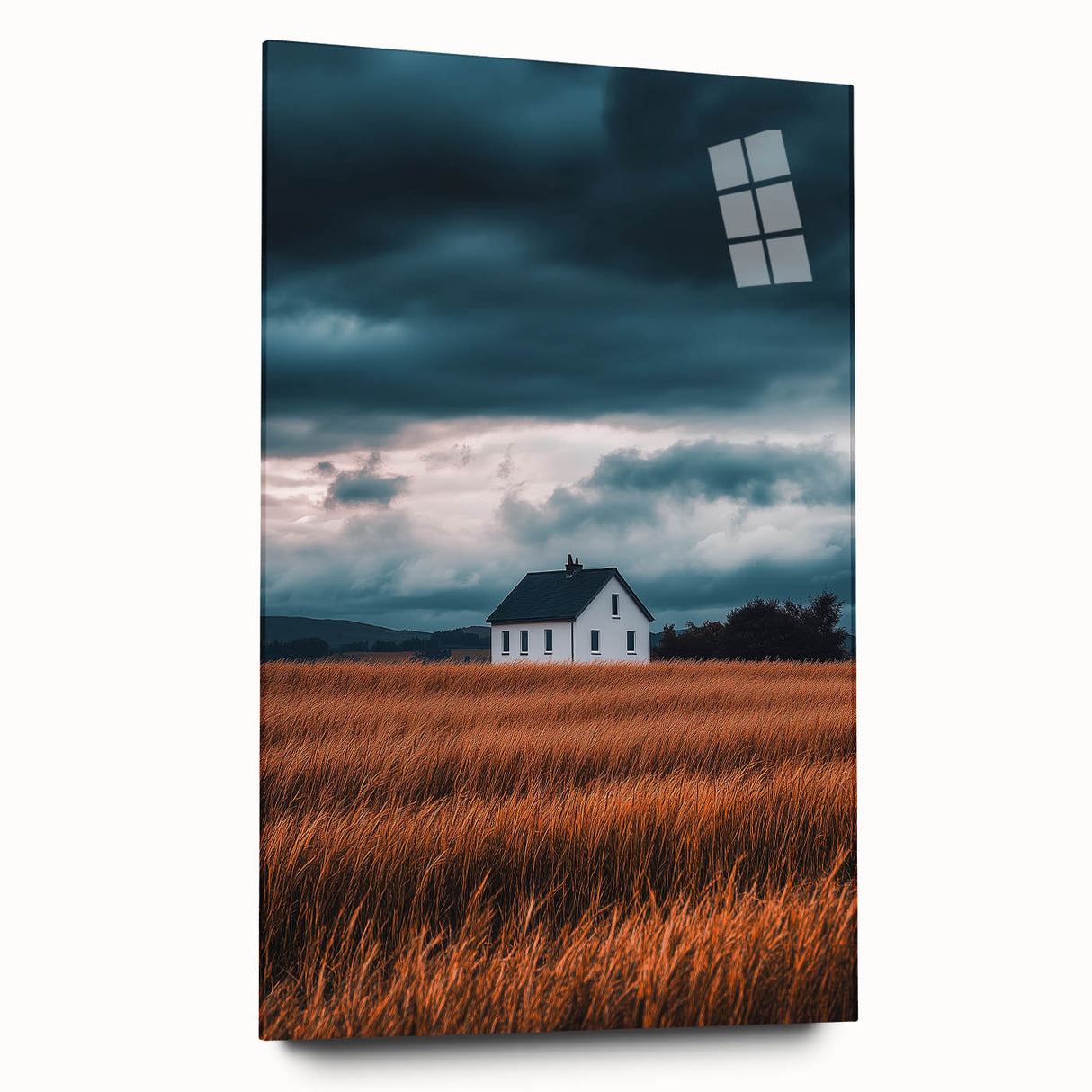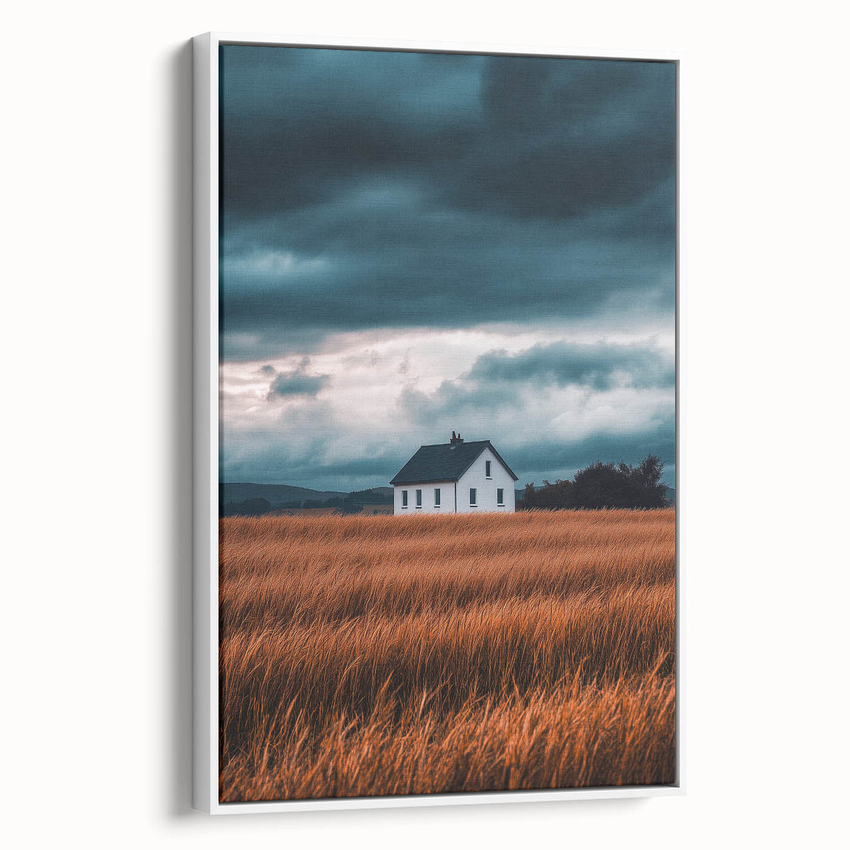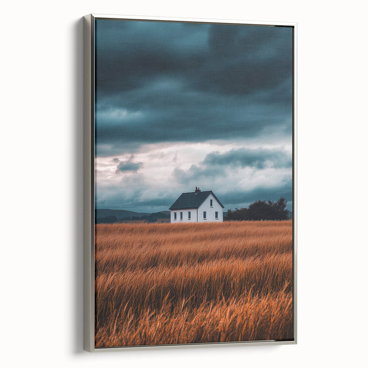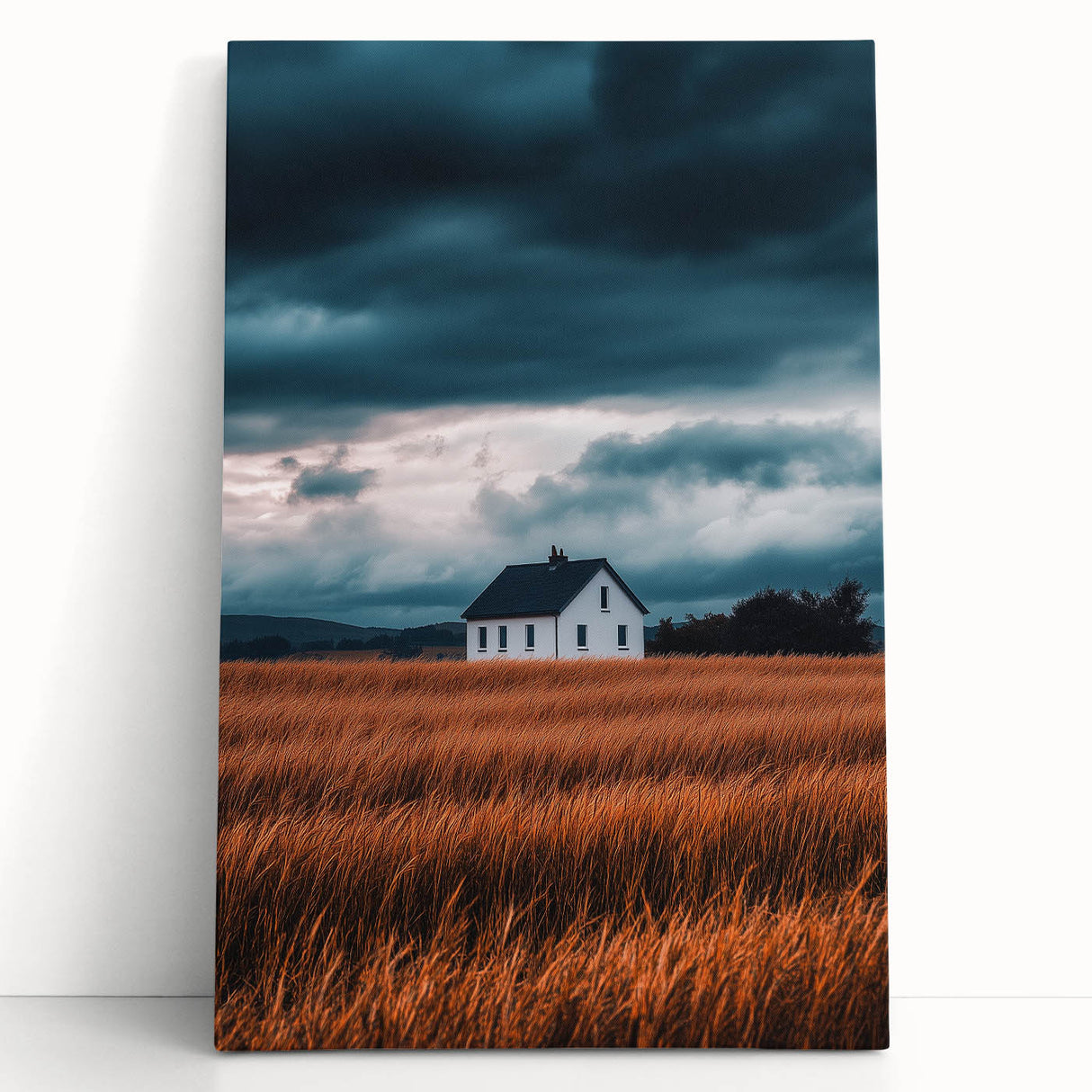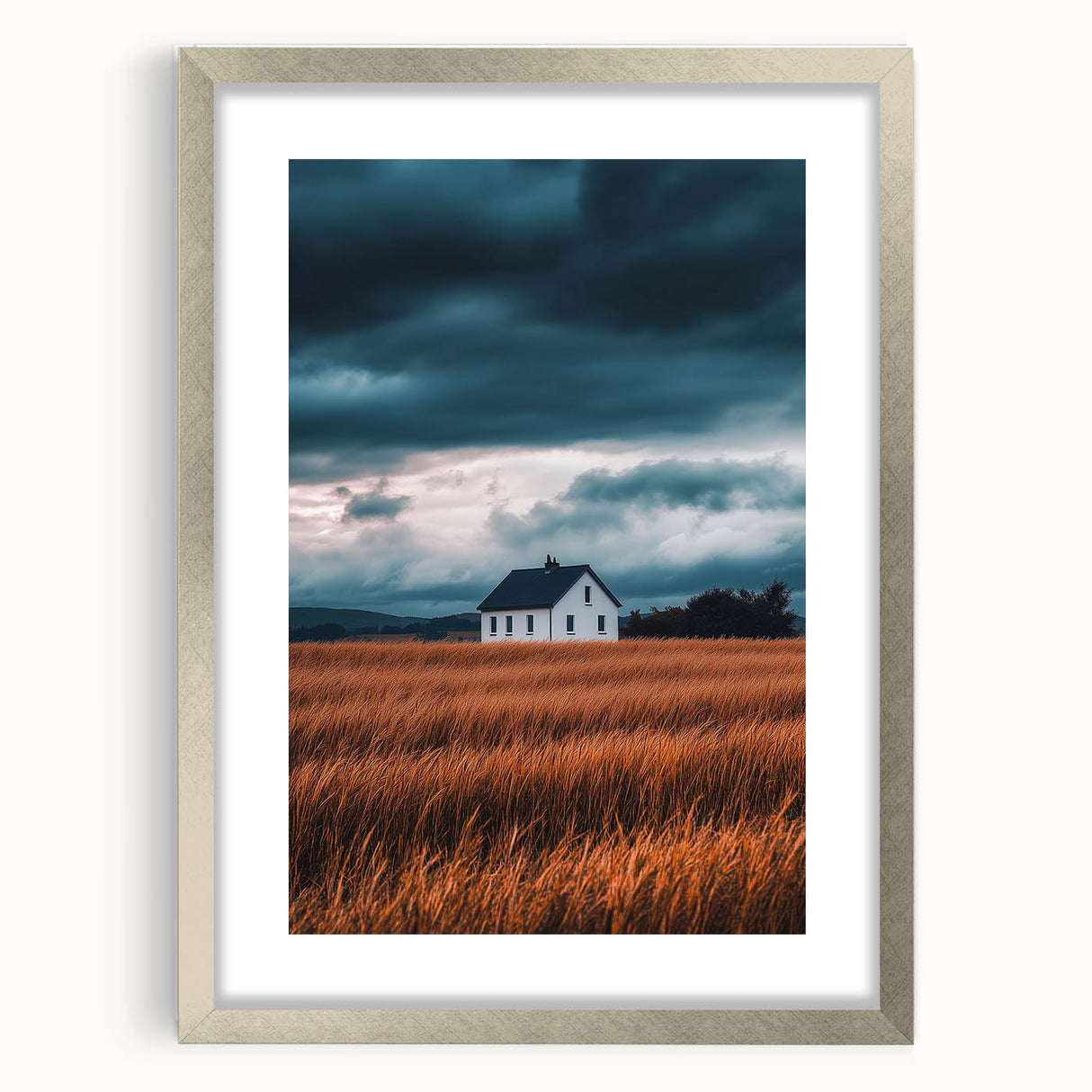 Immerse yourself in the powerful beauty of nature with this landscape art print, capturing a solitary white house amidst golden fields beneath a dramatic stormy sky. The contrast between deep blue storm clouds and warm brown fields creates a stunning balance of tranquility and intensity, making this a perfect nature-inspired wall art piece for modern and rustic interiors.