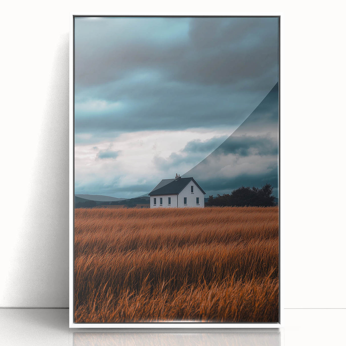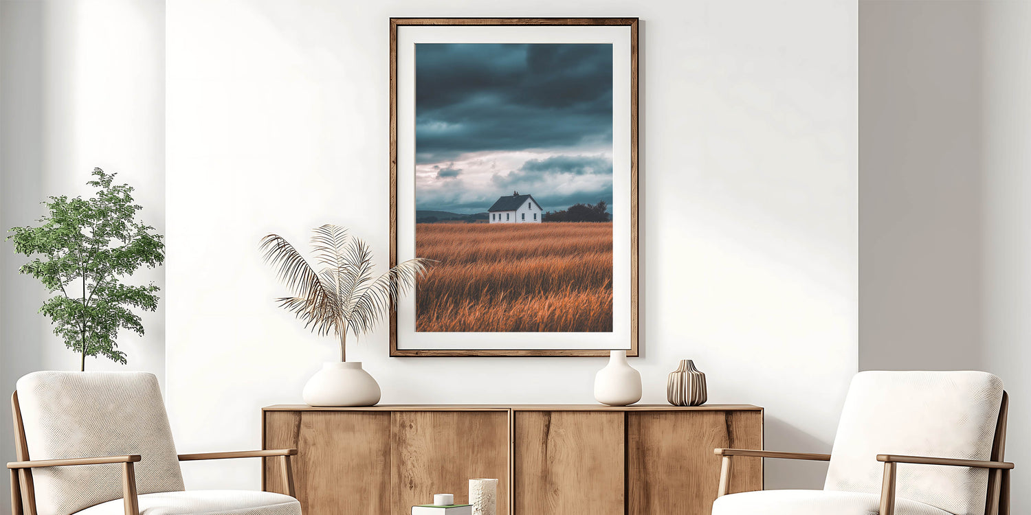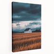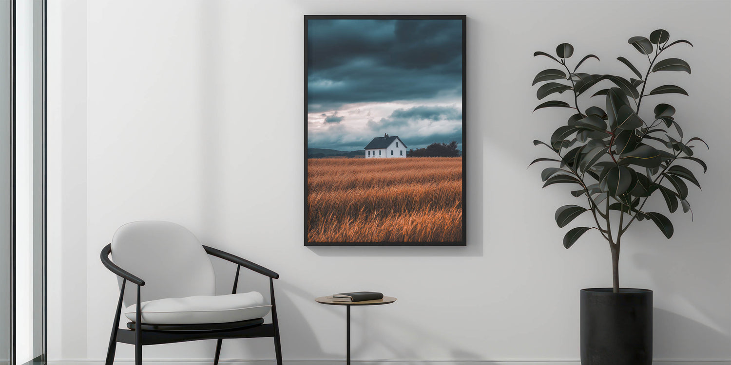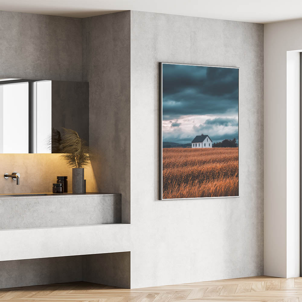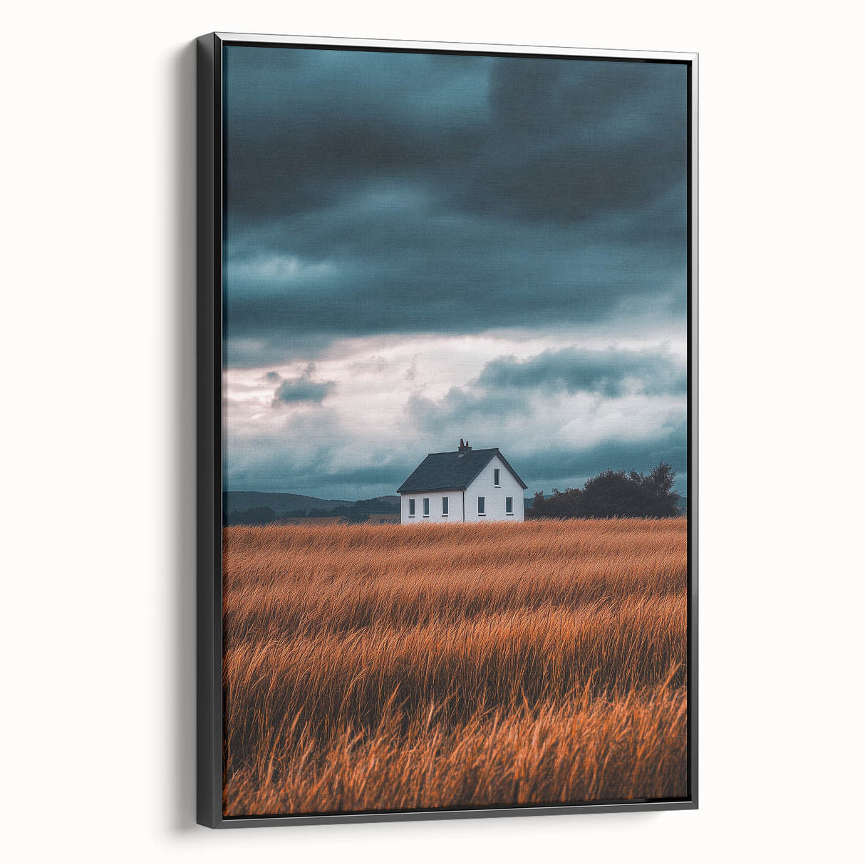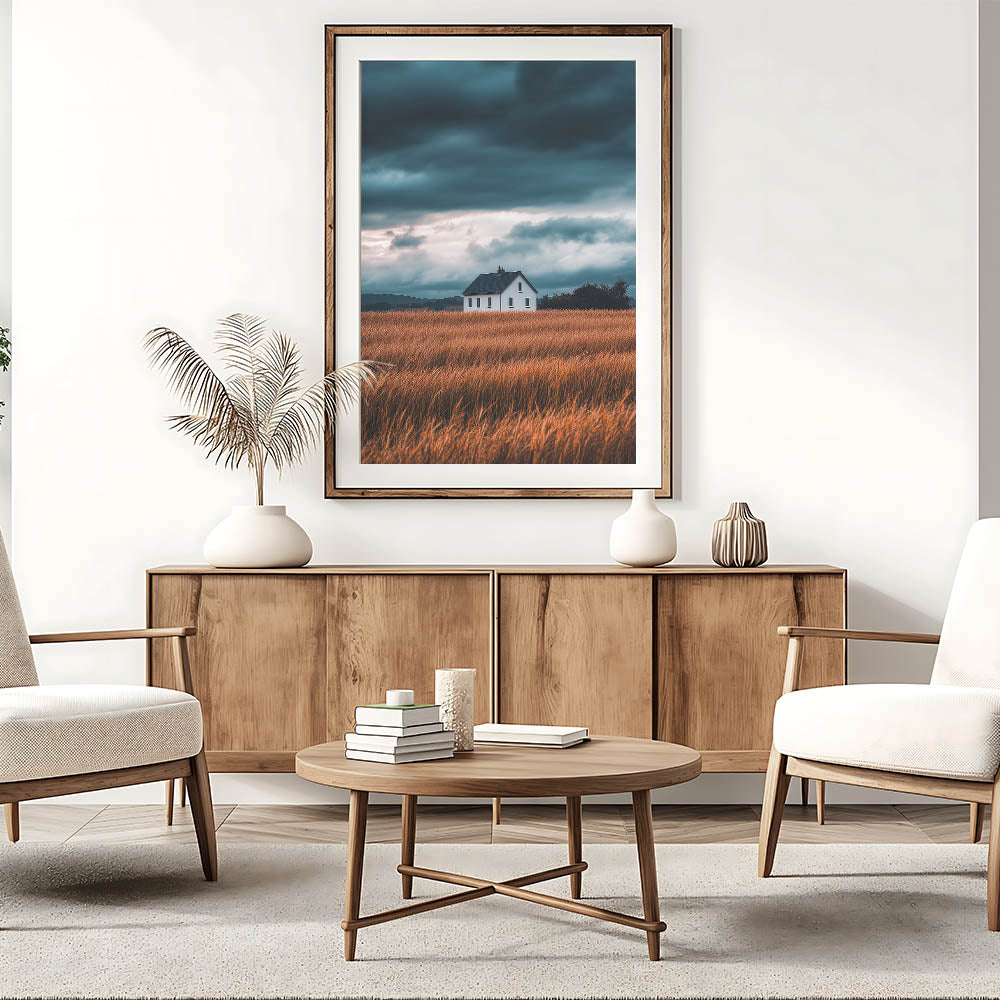 Immerse yourself in the powerful beauty of nature with this landscape art print, capturing a solitary white house amidst golden fields beneath a dramatic stormy sky. The contrast between deep blue storm clouds and warm brown fields creates a stunning balance of tranquility and intensity, making this a perfect nature-inspired wall art piece for modern and rustic interiors.