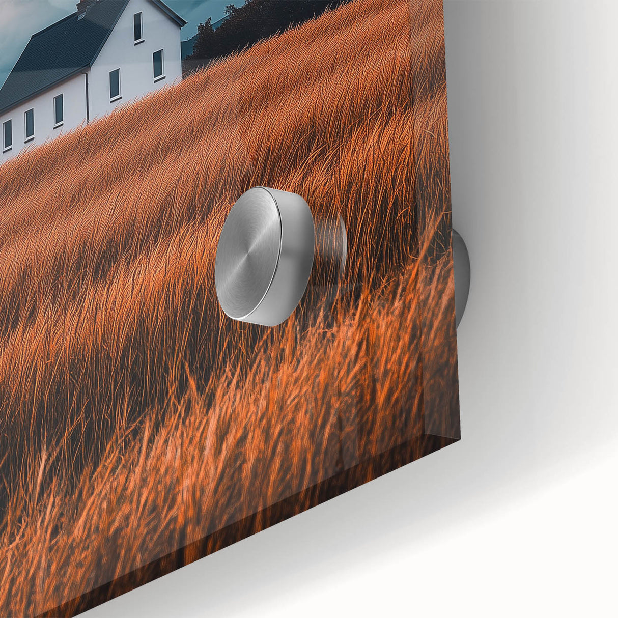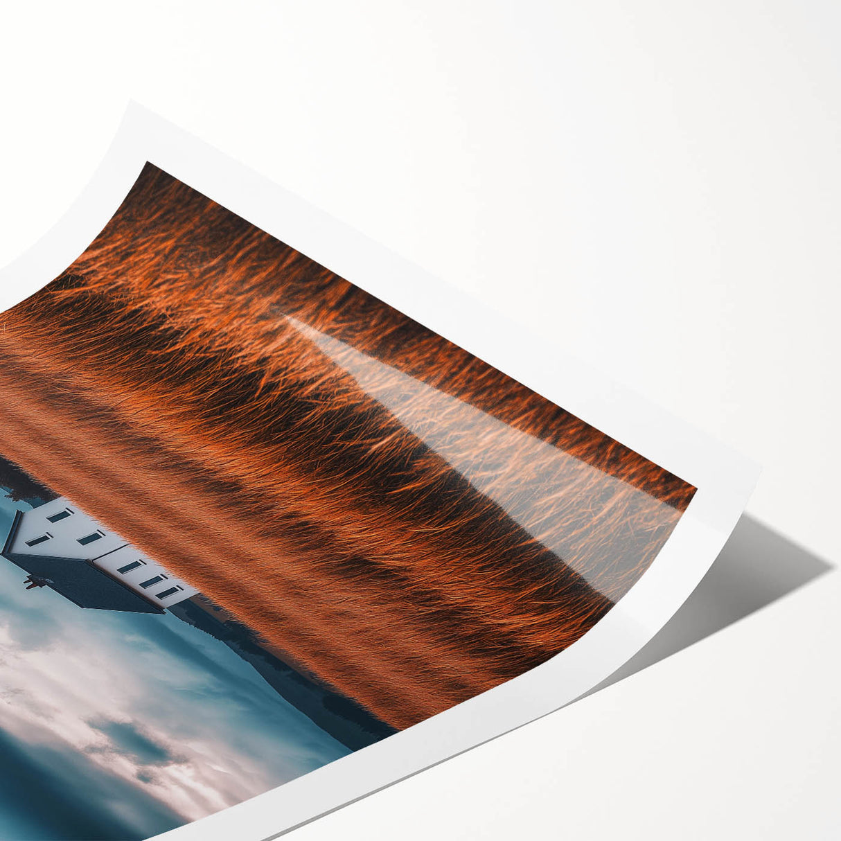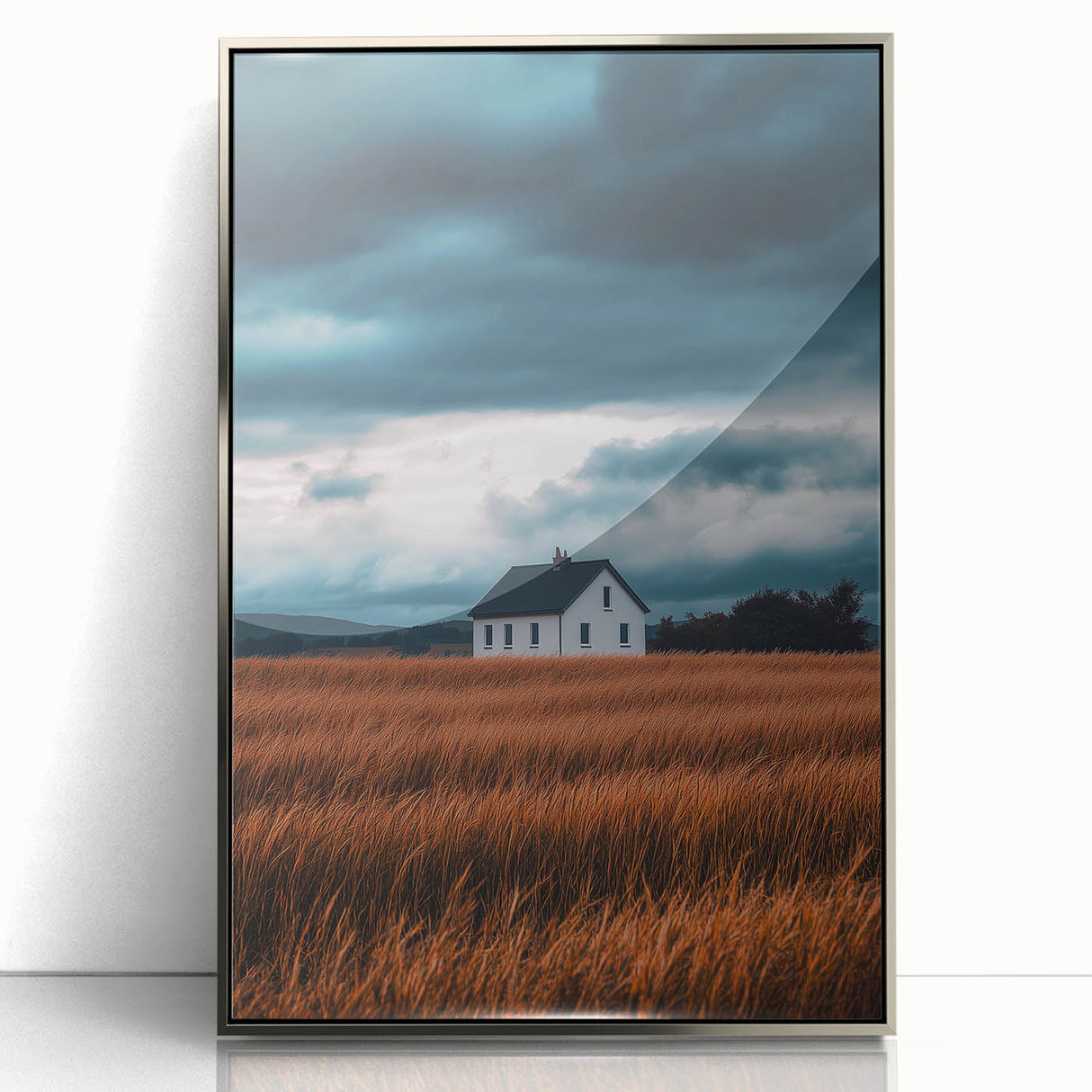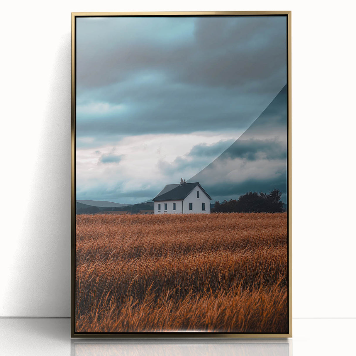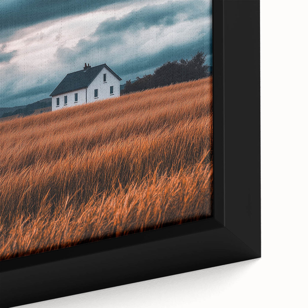 Immerse yourself in the powerful beauty of nature with this landscape art print, capturing a solitary white house amidst golden fields beneath a dramatic stormy sky. The contrast between deep blue storm clouds and warm brown fields creates a stunning balance of tranquility and intensity, making this a perfect nature-inspired wall art piece for modern and rustic interiors.