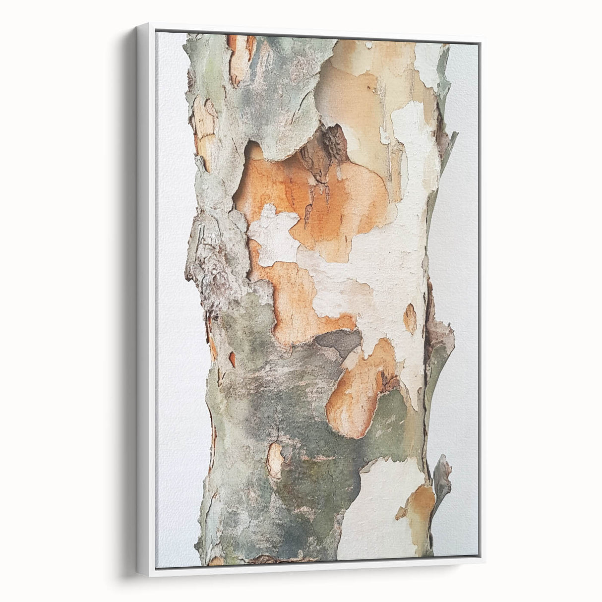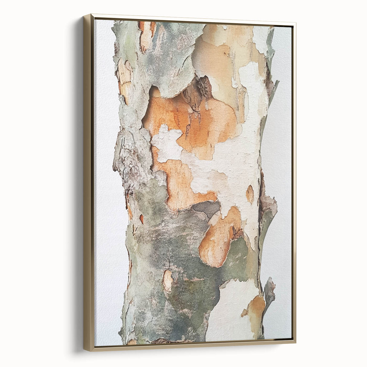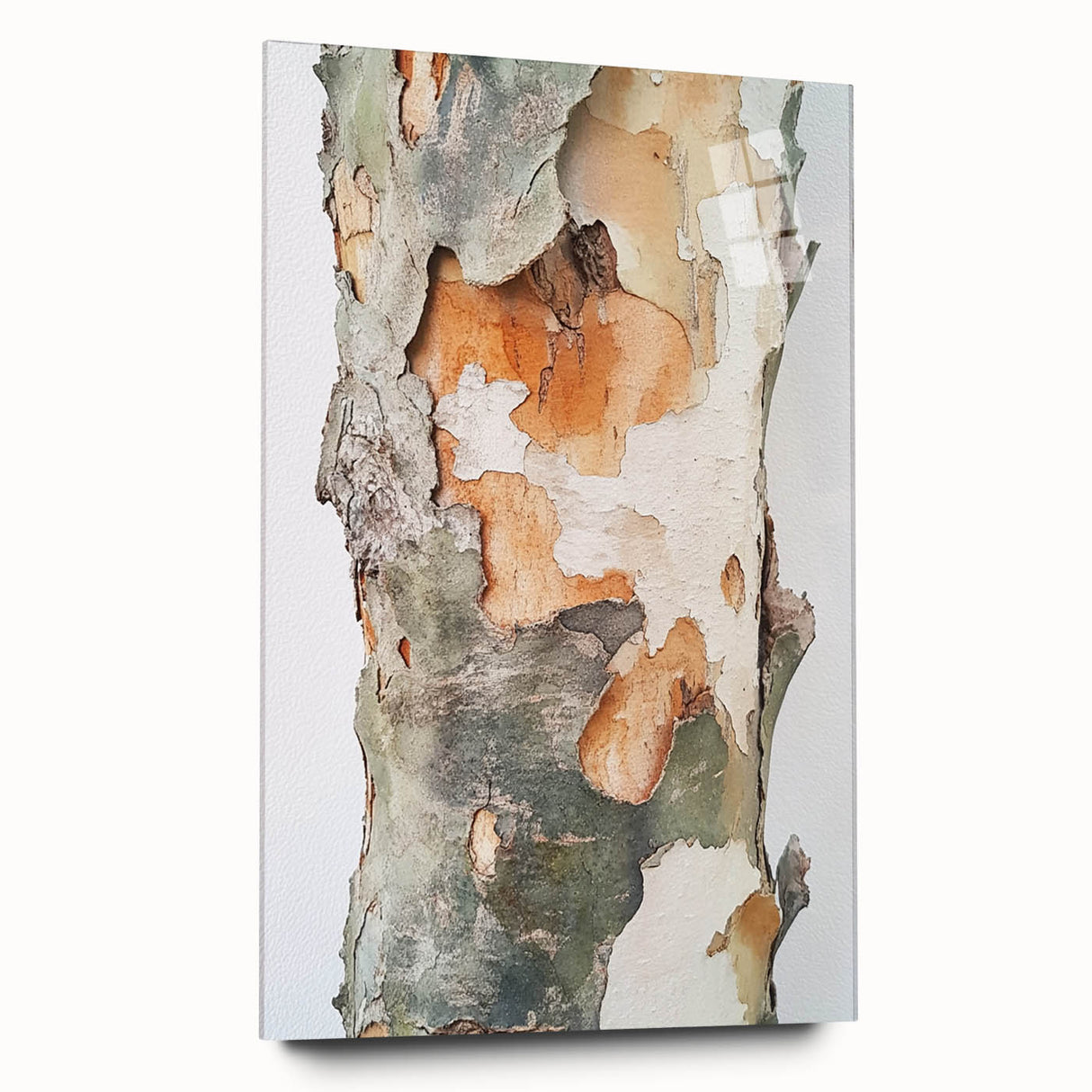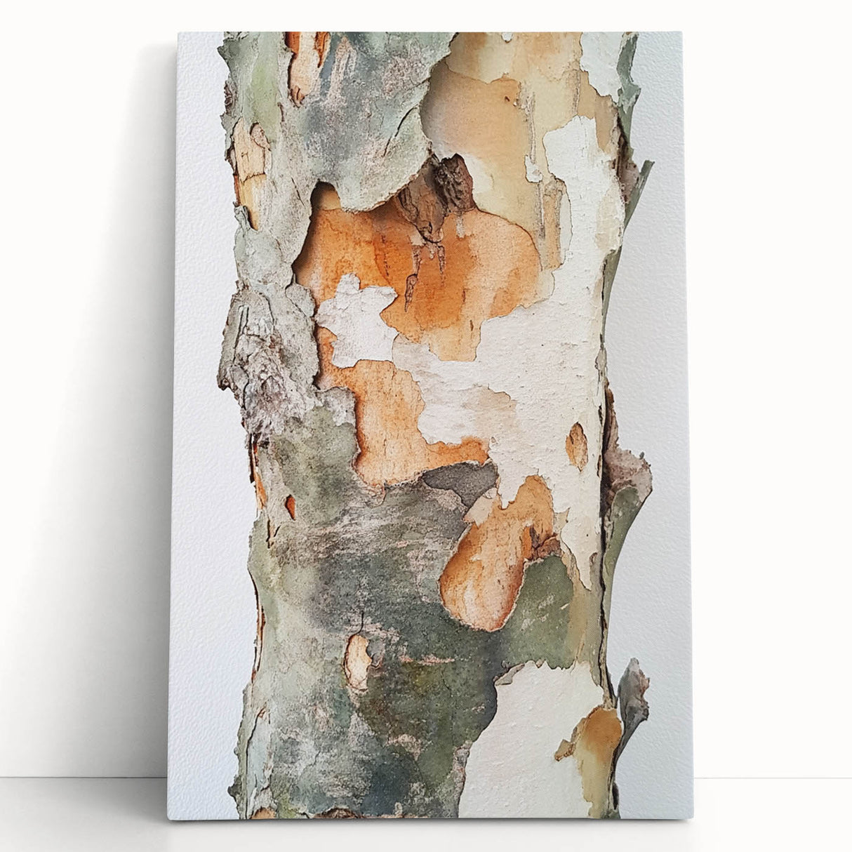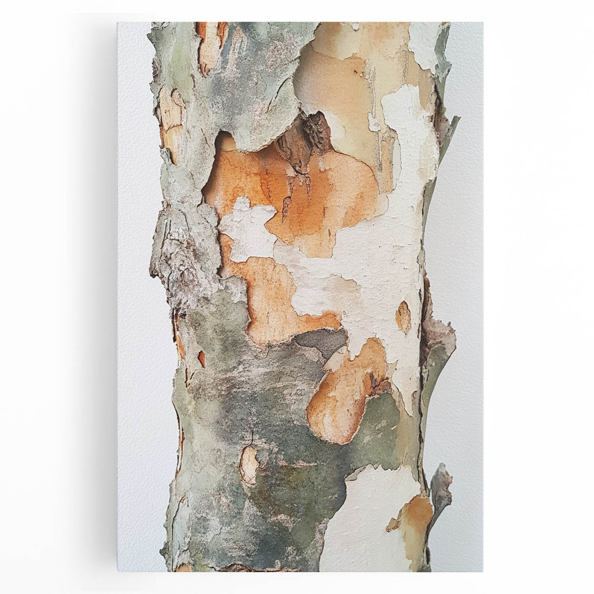 Discover the raw beauty of nature with this tree art print, featuring a close-up of textured tree bark with intricate peeling layers in earthy shades of beige, olive green, and burnt orange. The abstract yet organic design makes this a nature-inspired wall art piece that brings warmth and depth to any space.