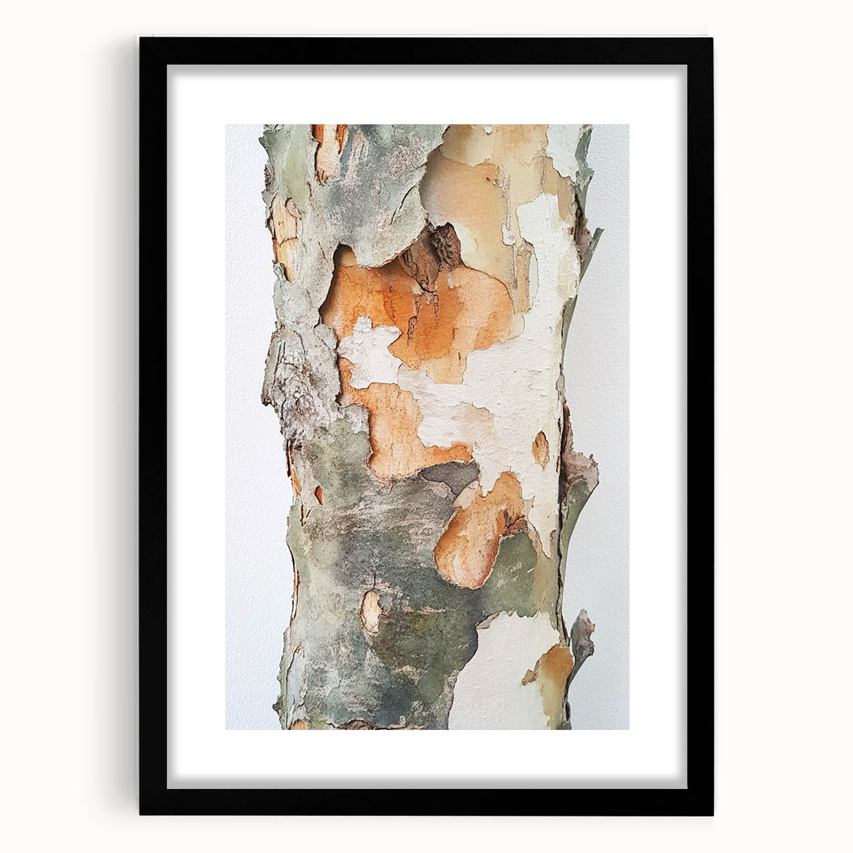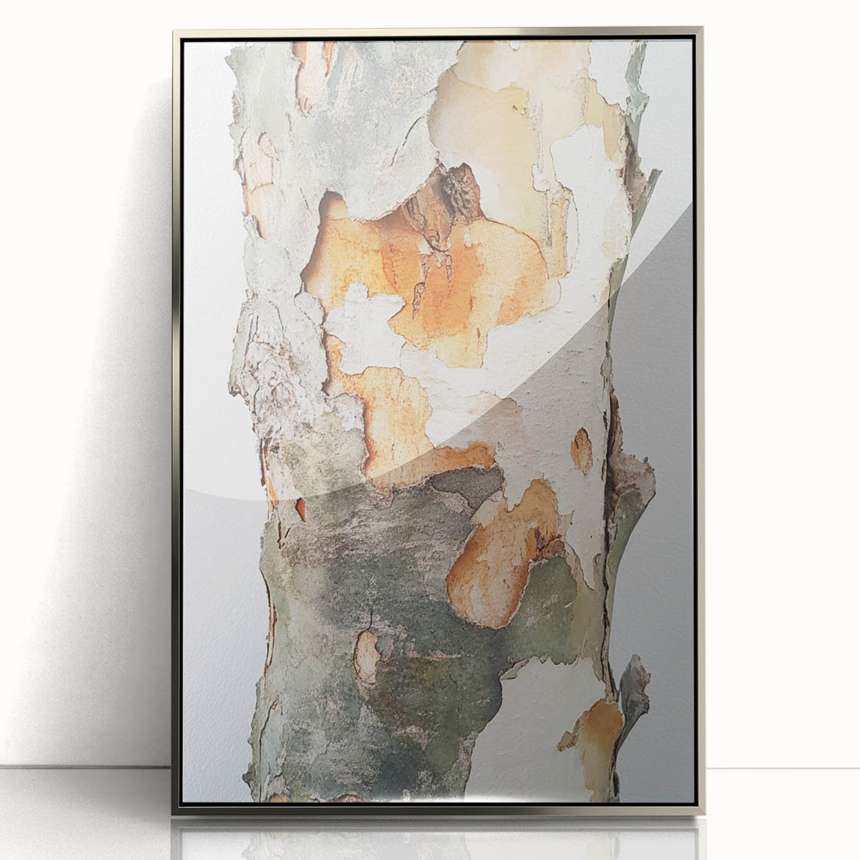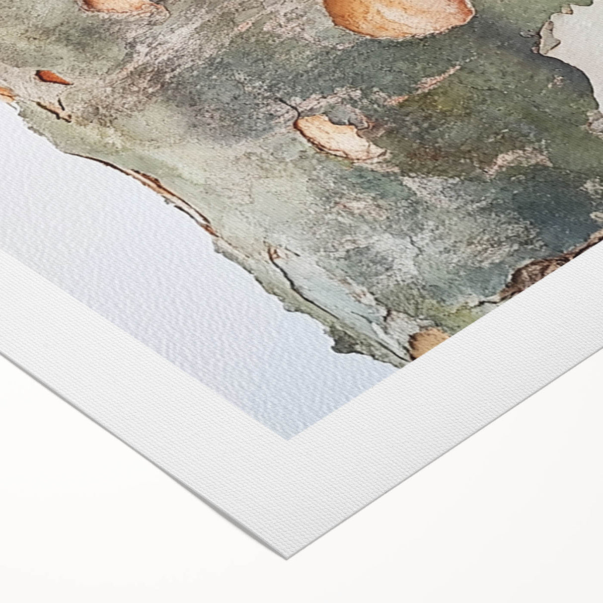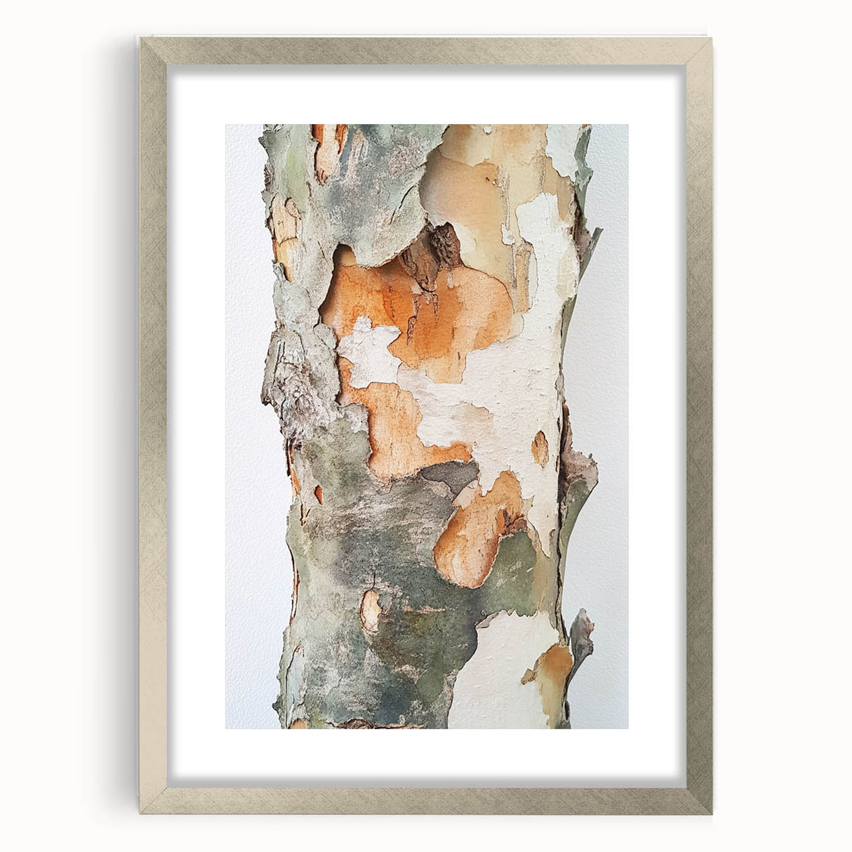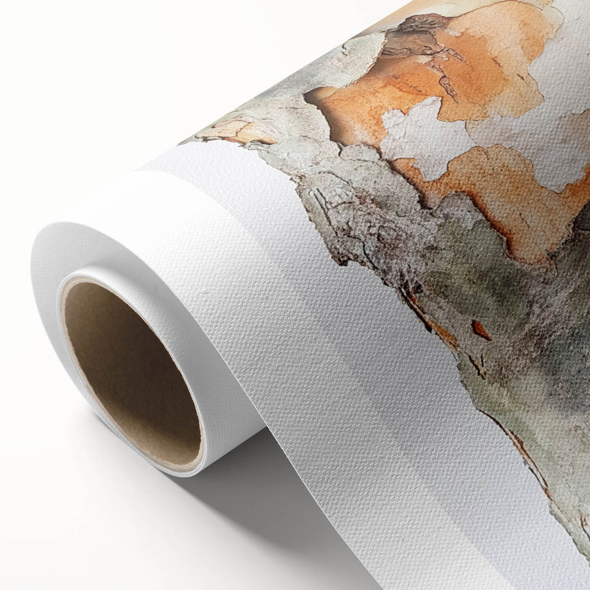 Discover the raw beauty of nature with this tree art print, featuring a close-up of textured tree bark with intricate peeling layers in earthy shades of beige, olive green, and burnt orange. The abstract yet organic design makes this a nature-inspired wall art piece that brings warmth and depth to any space.