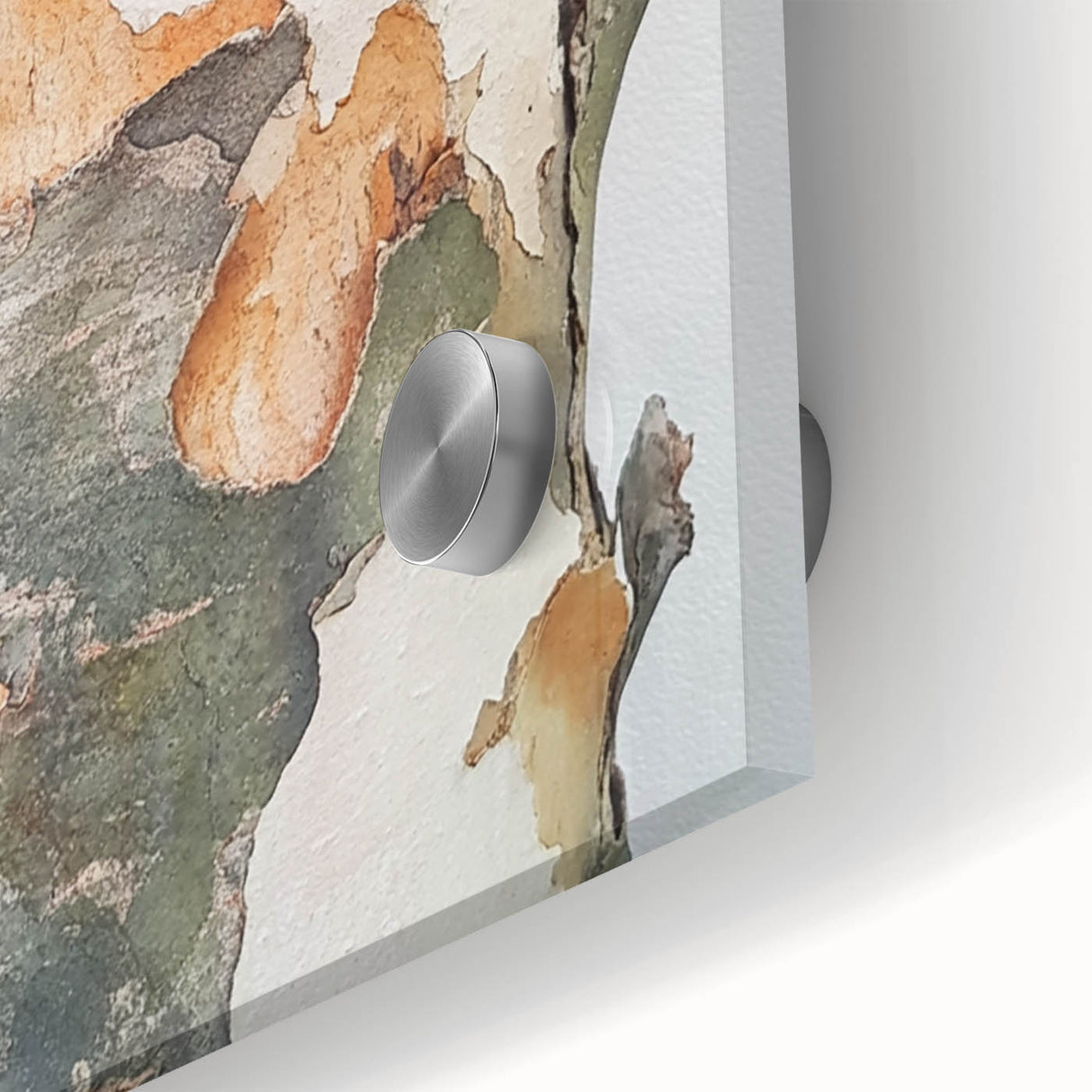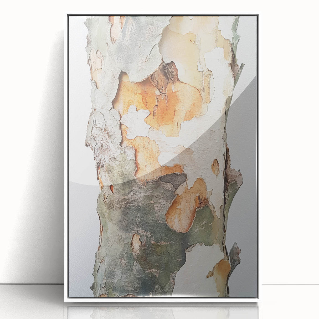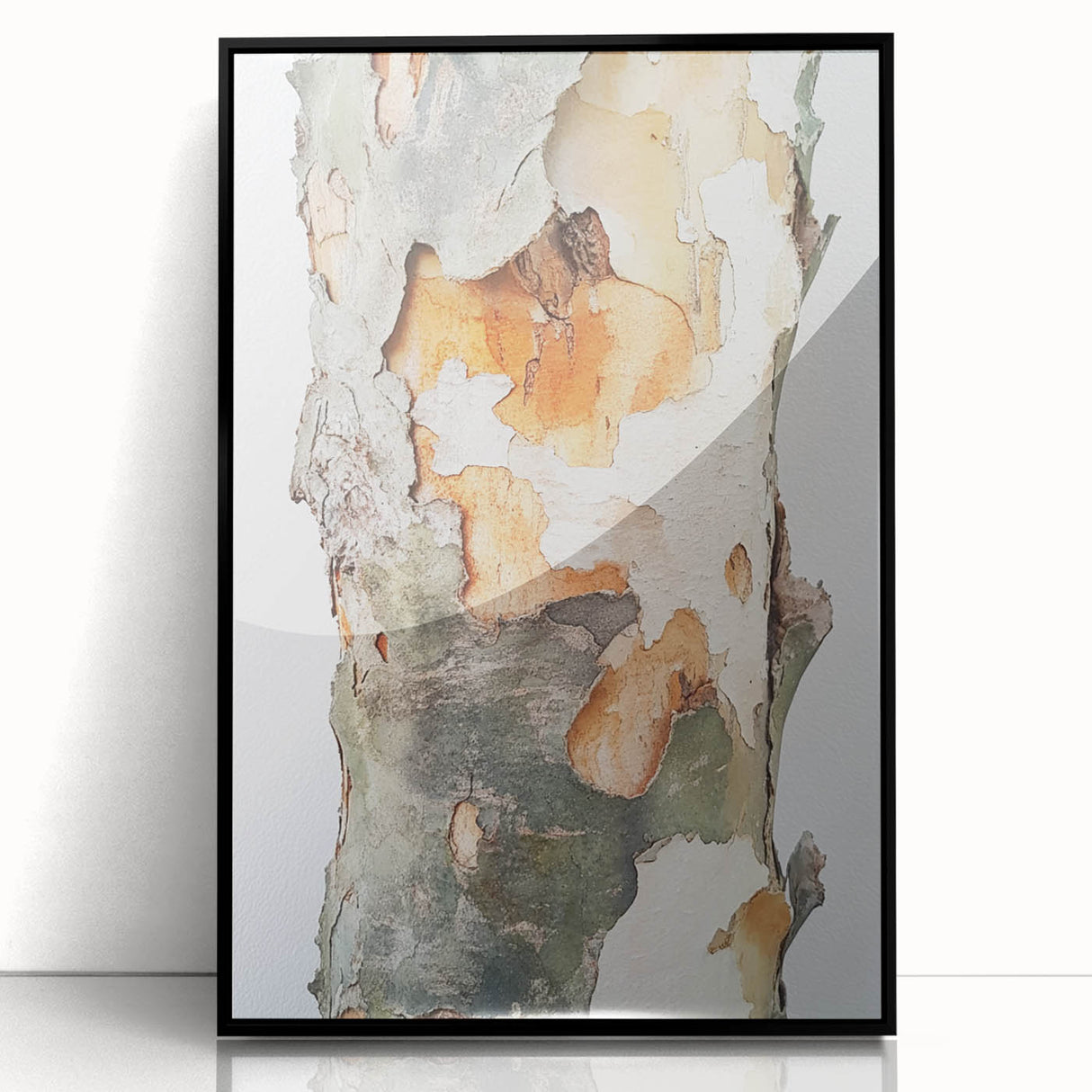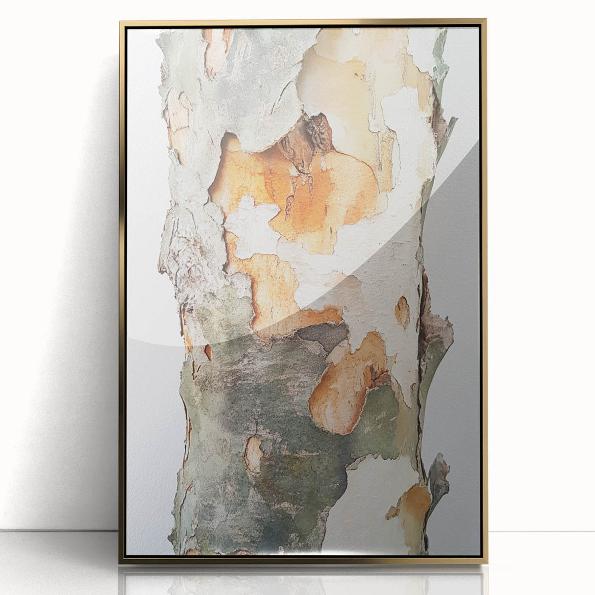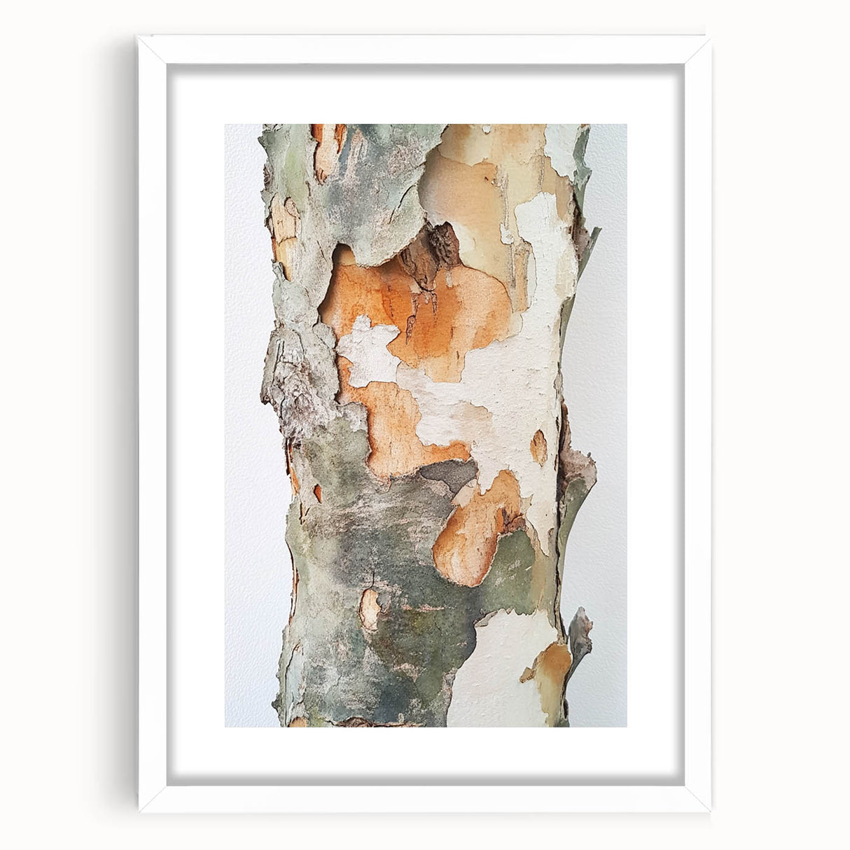 Discover the raw beauty of nature with this tree art print, featuring a close-up of textured tree bark with intricate peeling layers in earthy shades of beige, olive green, and burnt orange. The abstract yet organic design makes this a nature-inspired wall art piece that brings warmth and depth to any space.