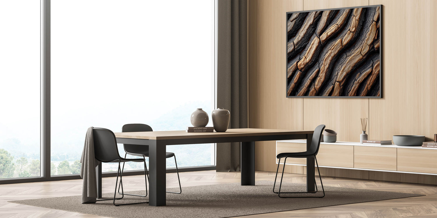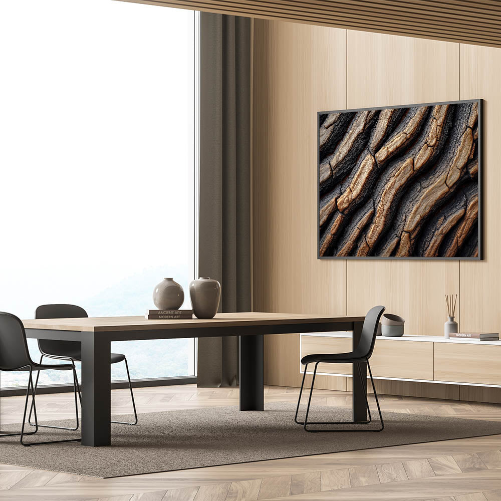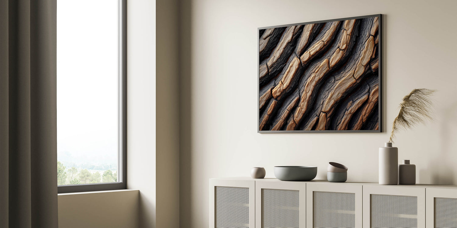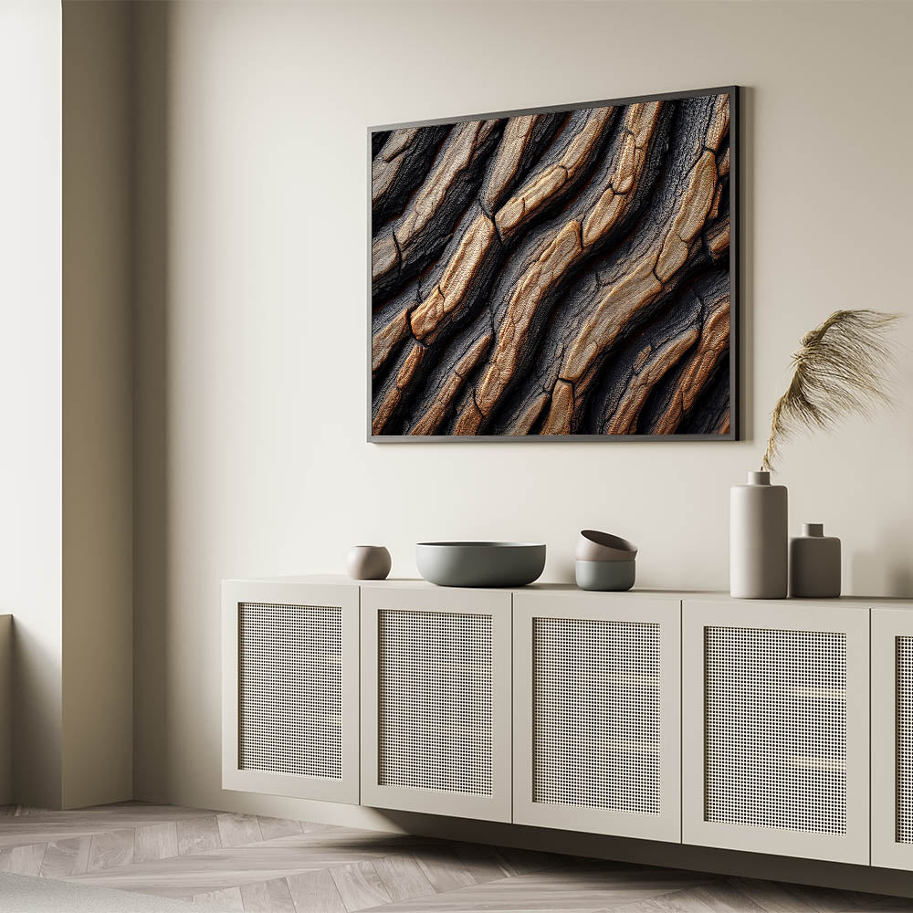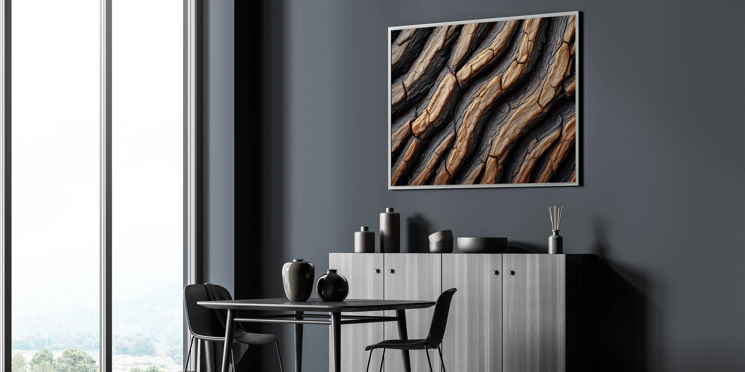 This beautiful close-up of textured tree bark brings a unique combination of rustic charm and modern elegance to your home decor. The intricate details of the tree bark, with its natural grooves and patterns, create a visually captivating design that adds depth and warmth to any space. The rich contrast between dark and light tones gives this nature-inspired art piece a bold and sophisticated look, making it perfect for contemporary interiors or nature lovers looking to bring the outdoors inside.