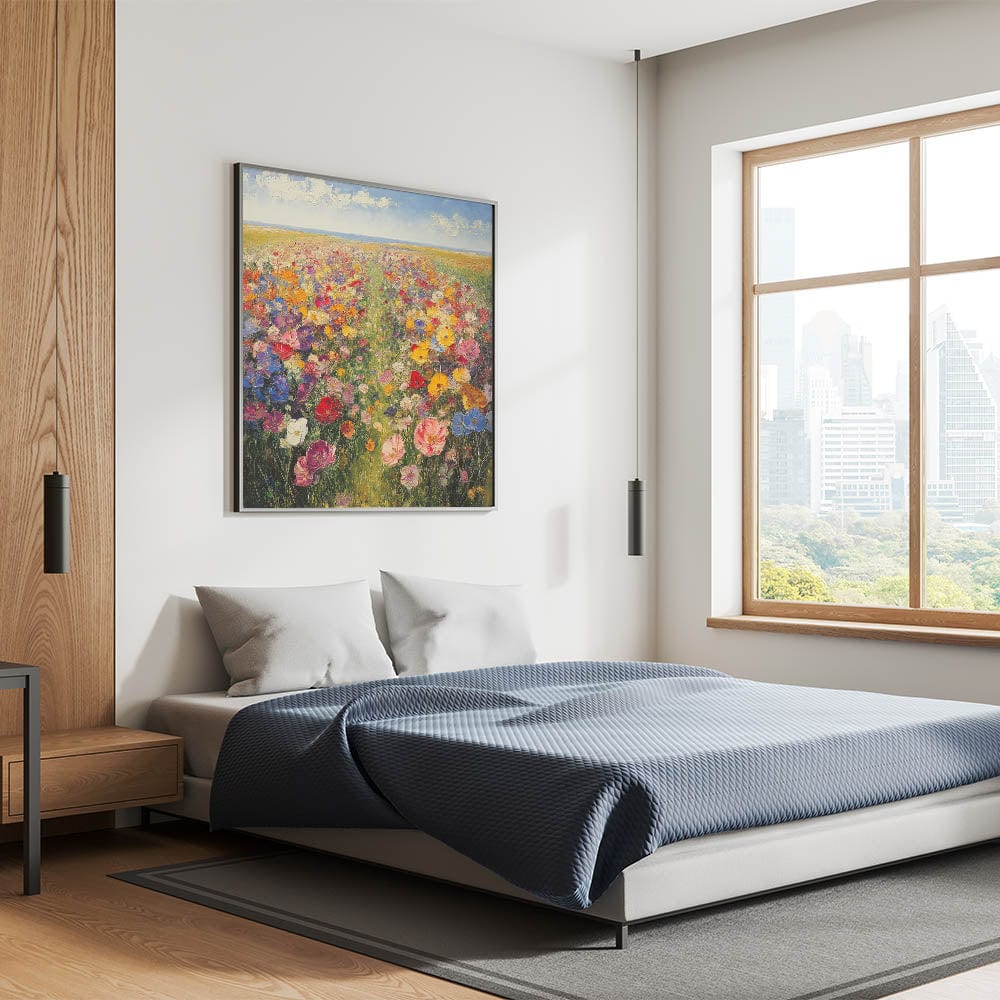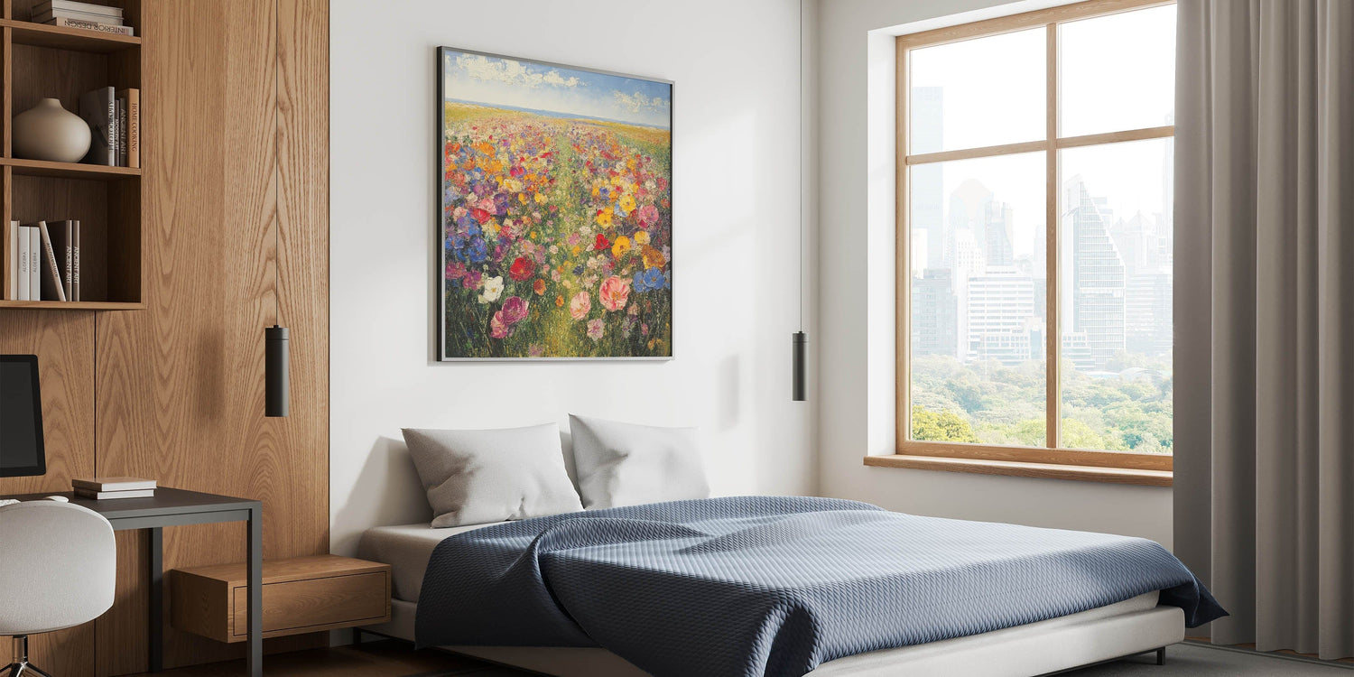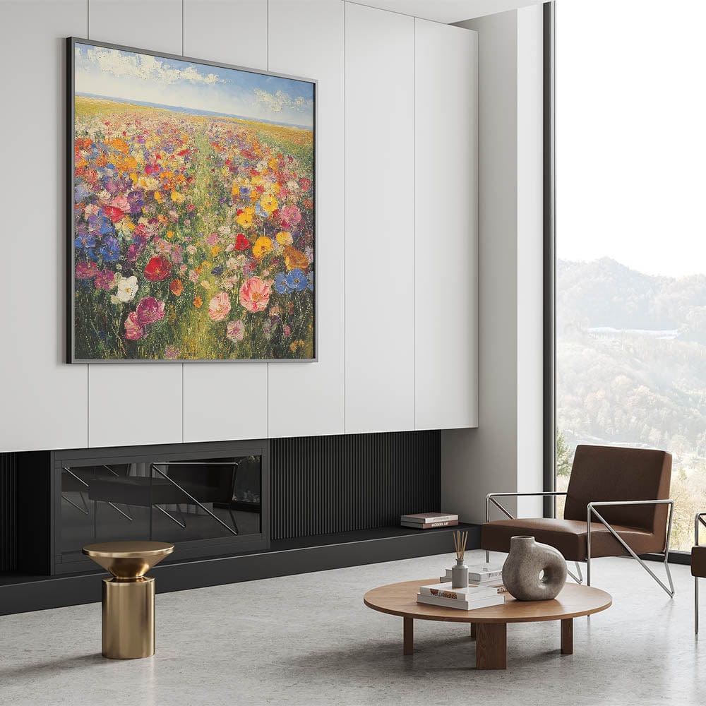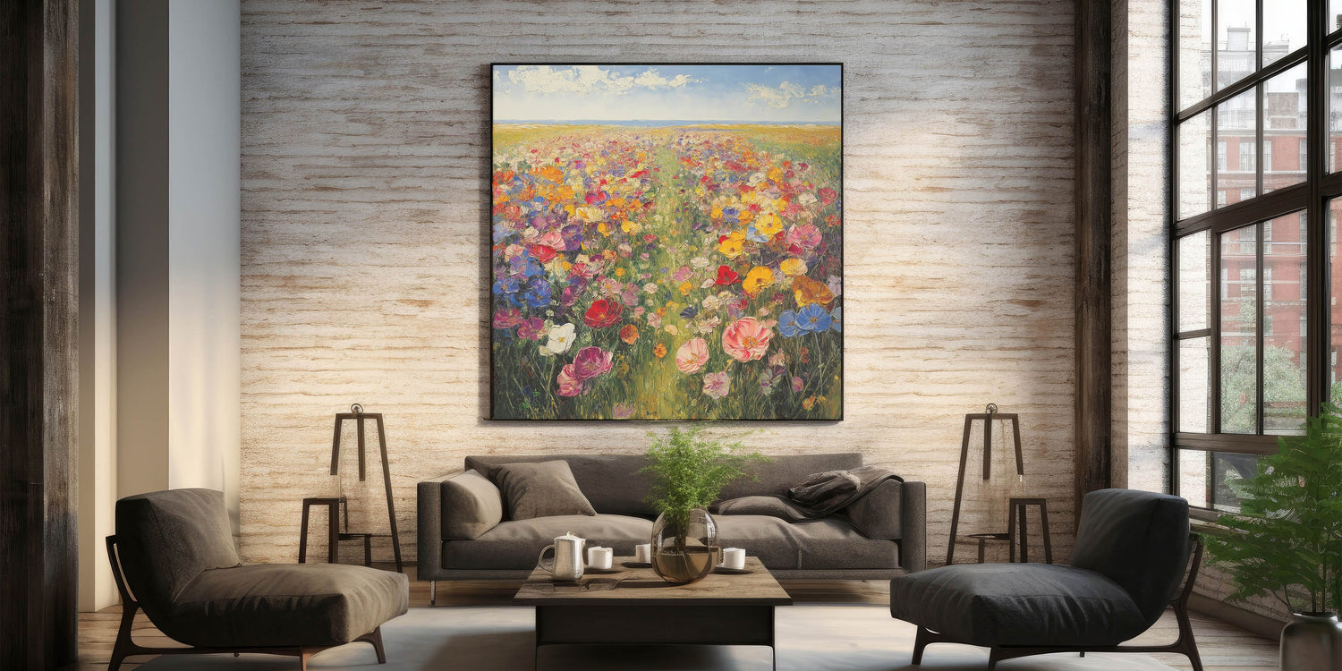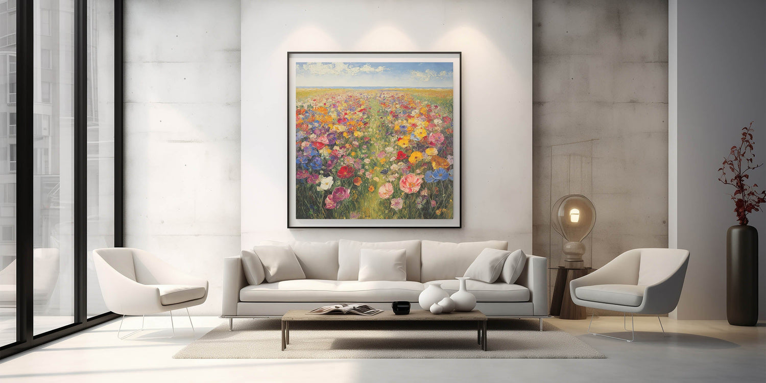 Immerse yourself in the beauty of nature with this Tree Art Print, featuring a breathtaking wildflower meadow bursting with color. A harmonious blend of vivid reds, yellows, pinks, blues, and purples stretches across the canvas, creating a stunning Nature-Inspired Wall Art piece that radiates warmth and joy. The impressionistic brushstrokes and rich textures bring the landscape to life, making it a perfect focal point for any space.