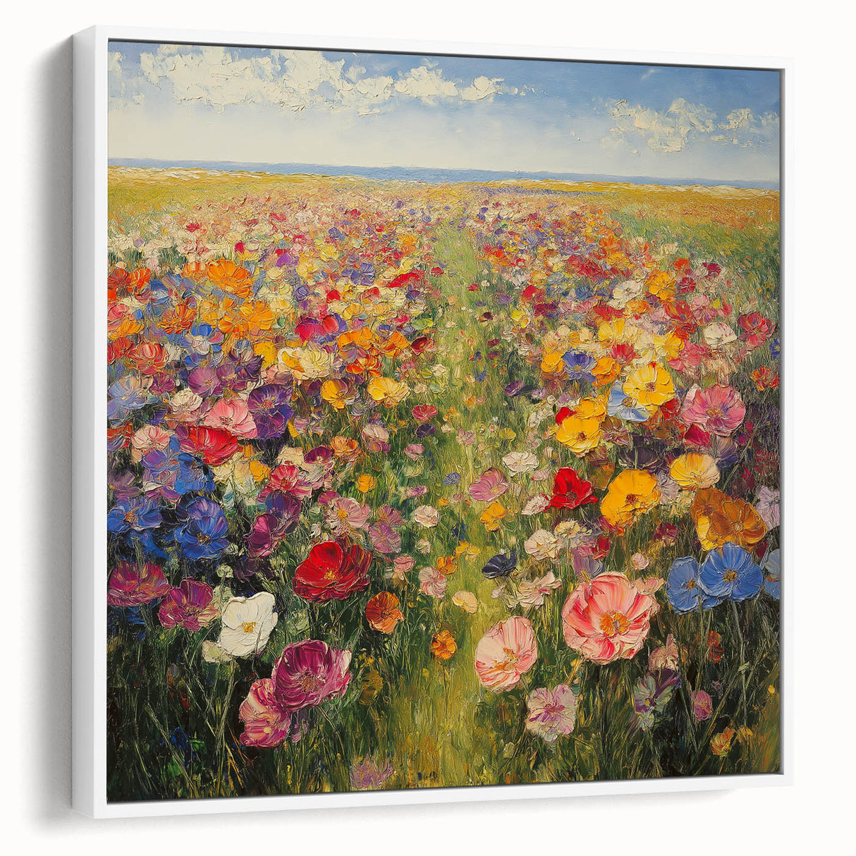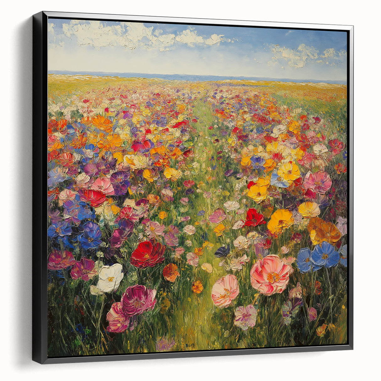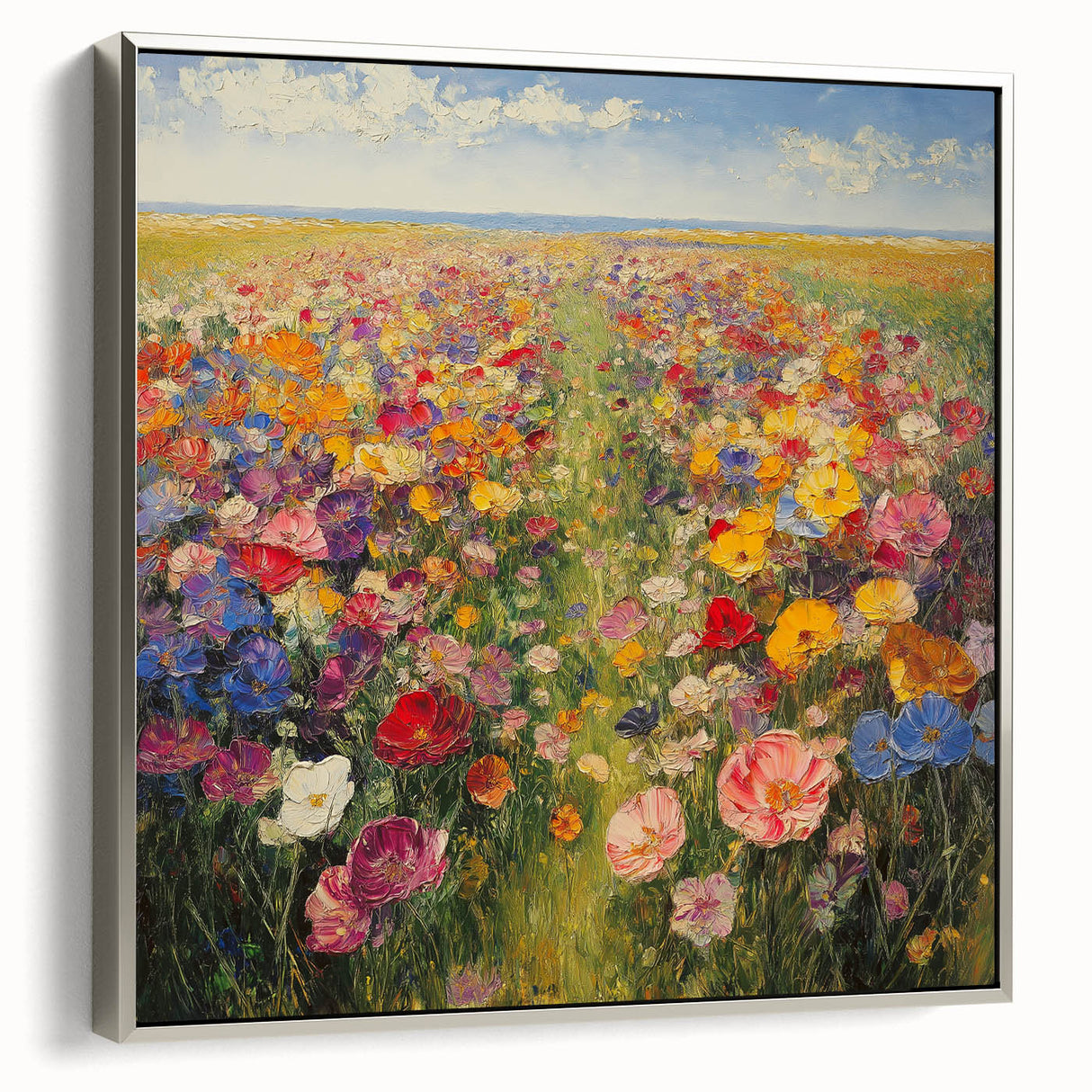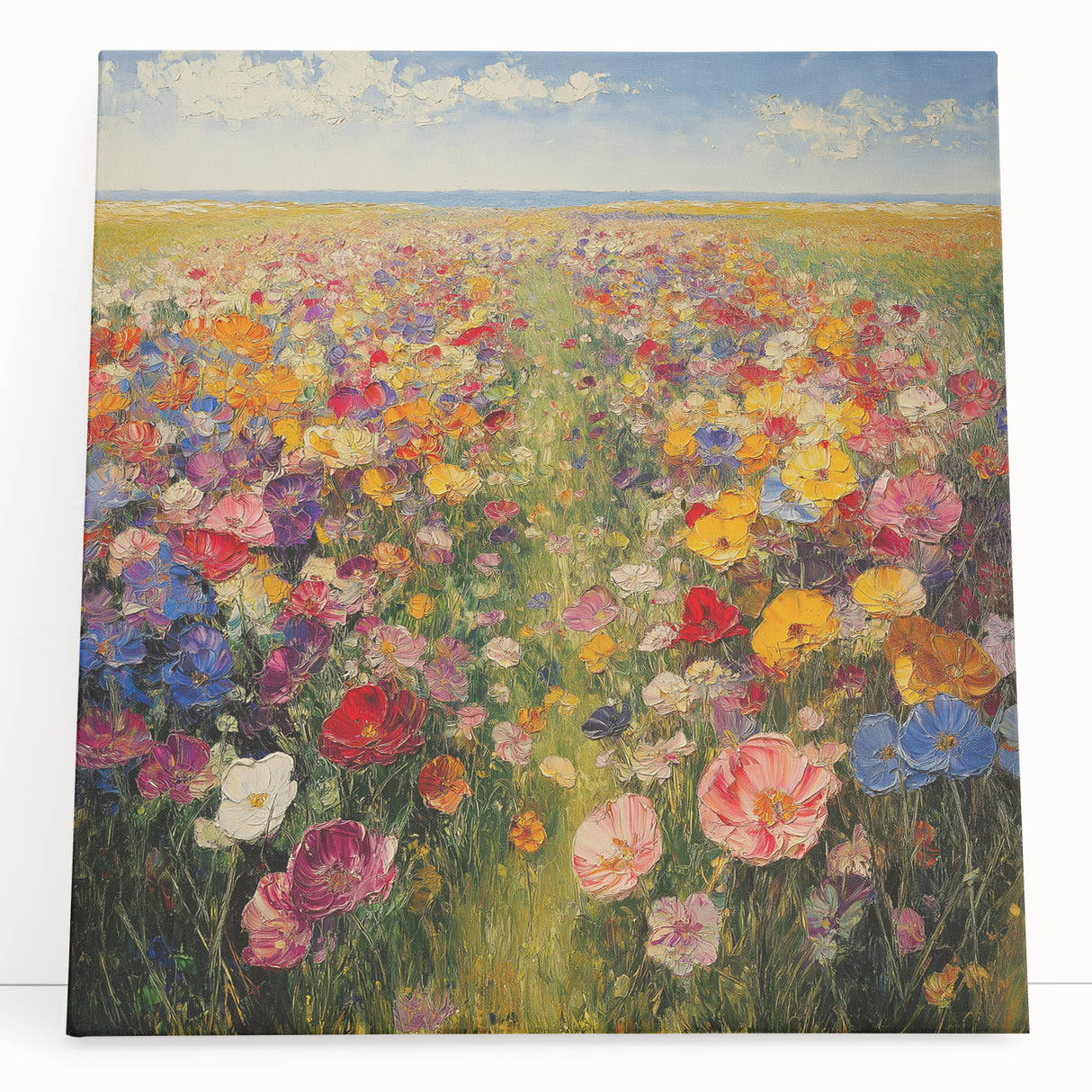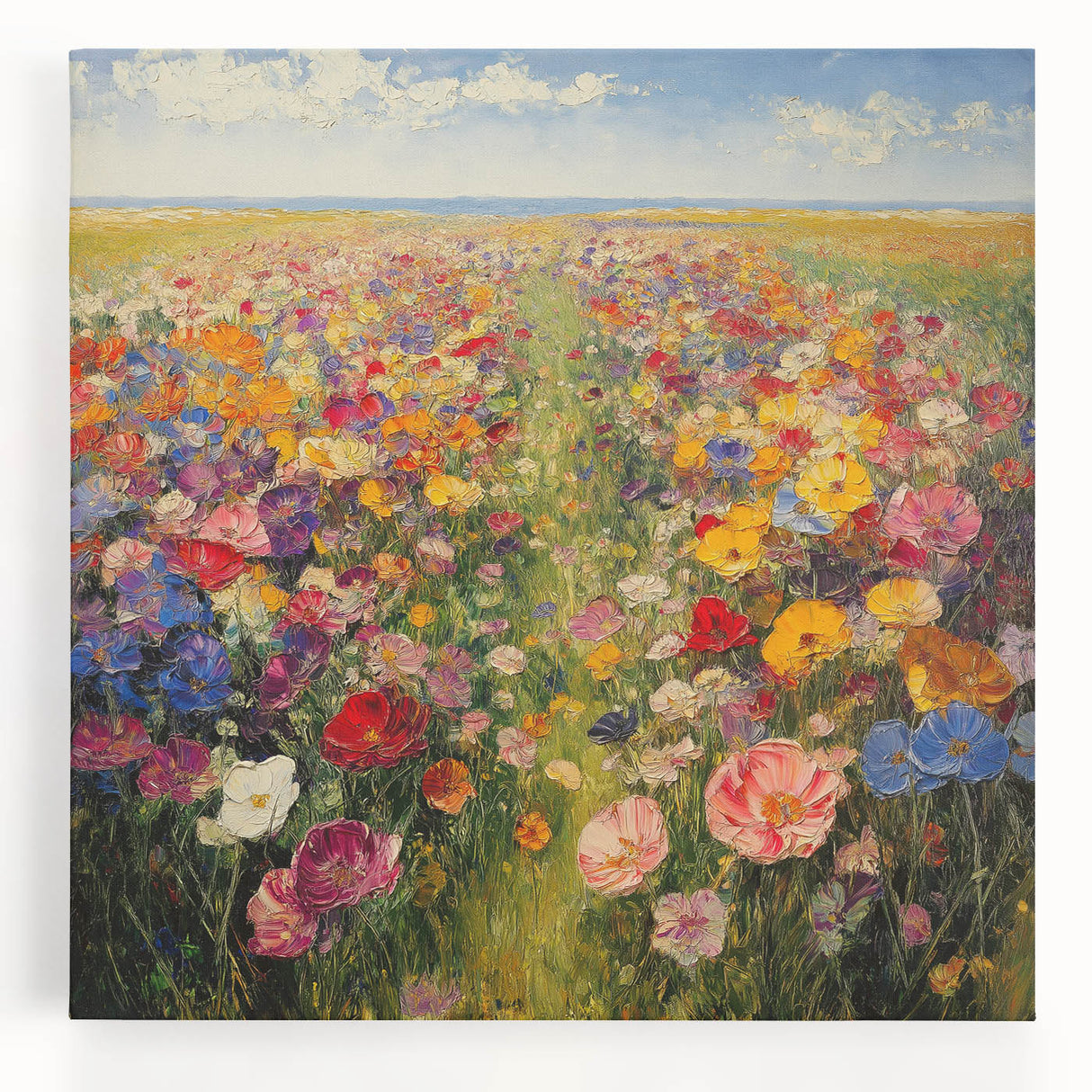 Immerse yourself in the beauty of nature with this Tree Art Print, featuring a breathtaking wildflower meadow bursting with color. A harmonious blend of vivid reds, yellows, pinks, blues, and purples stretches across the canvas, creating a stunning Nature-Inspired Wall Art piece that radiates warmth and joy. The impressionistic brushstrokes and rich textures bring the landscape to life, making it a perfect focal point for any space.