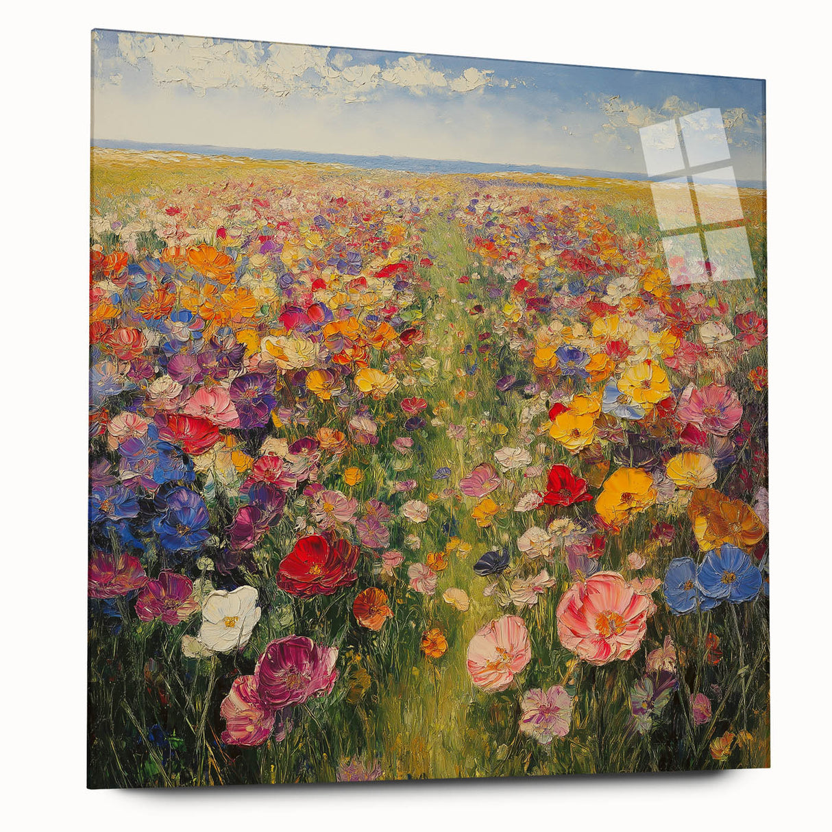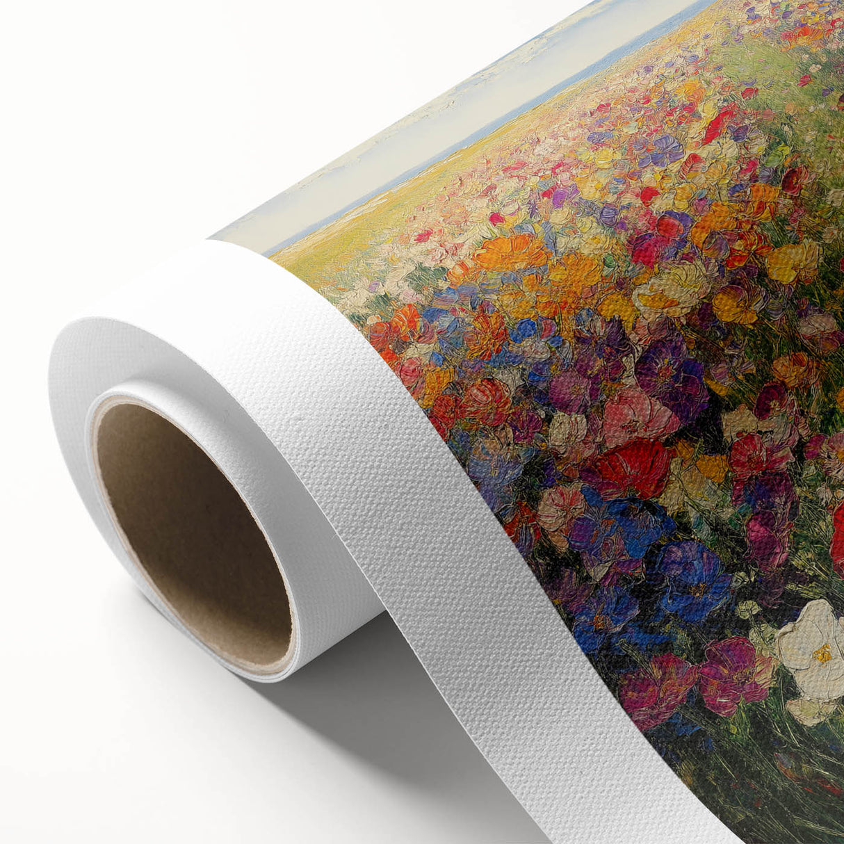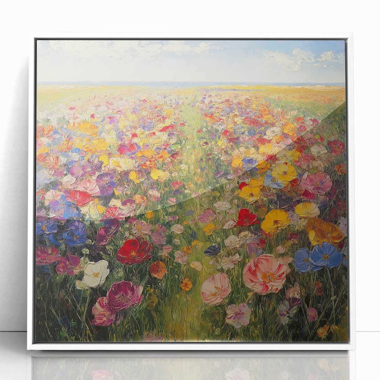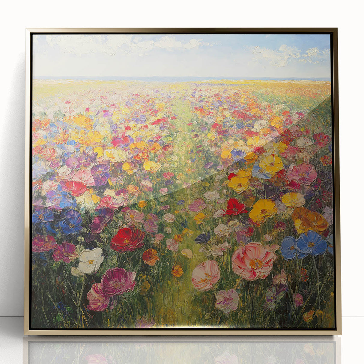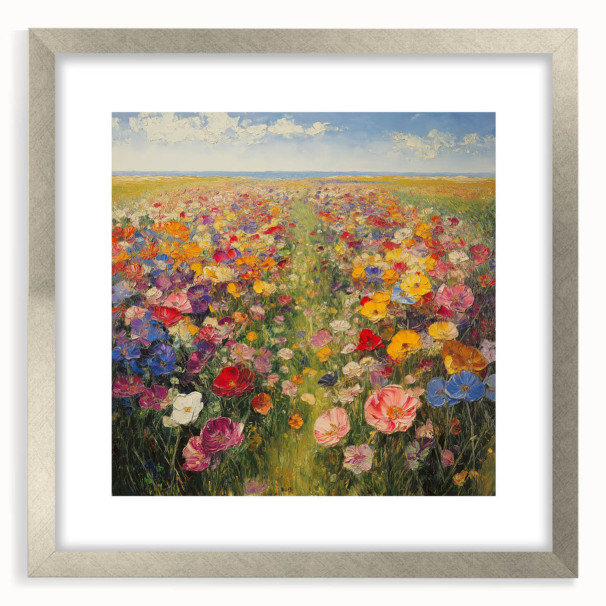 Immerse yourself in the beauty of nature with this Tree Art Print, featuring a breathtaking wildflower meadow bursting with color. A harmonious blend of vivid reds, yellows, pinks, blues, and purples stretches across the canvas, creating a stunning Nature-Inspired Wall Art piece that radiates warmth and joy. The impressionistic brushstrokes and rich textures bring the landscape to life, making it a perfect focal point for any space.