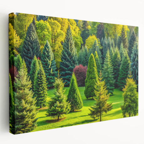 • Stretched canvas wall art showcasing a serene landscape with tall trees and vibrant greenery, perfect for home decor. Ideal for nature lovers and tranquil settings.