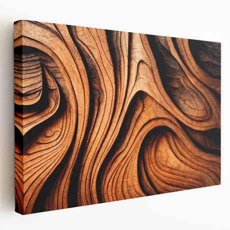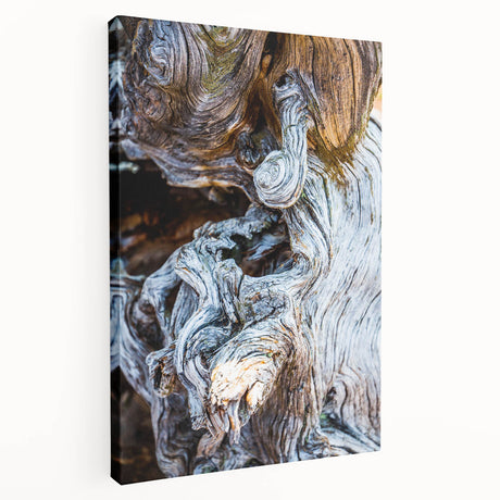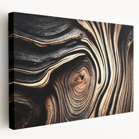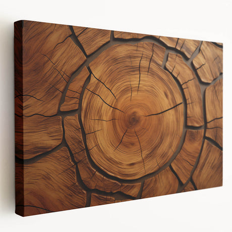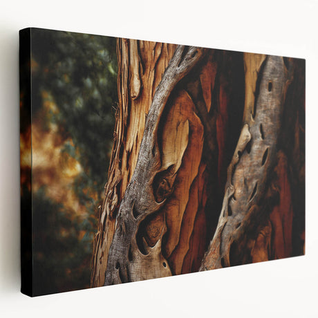 • Close-up of a tree's bark printed on stretched canvas, with detailed textures in earthy brown tones.