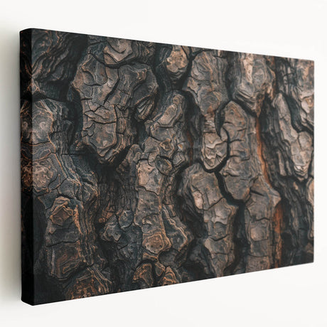 • Close-up of tree bark on a large stretched canvas with detailed textures in earth tones, ideal for kitchen wall art.