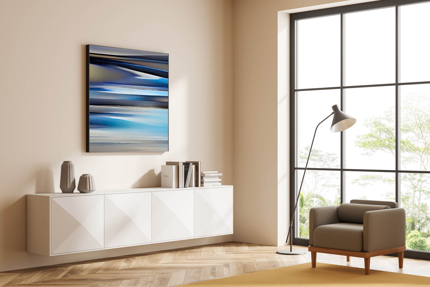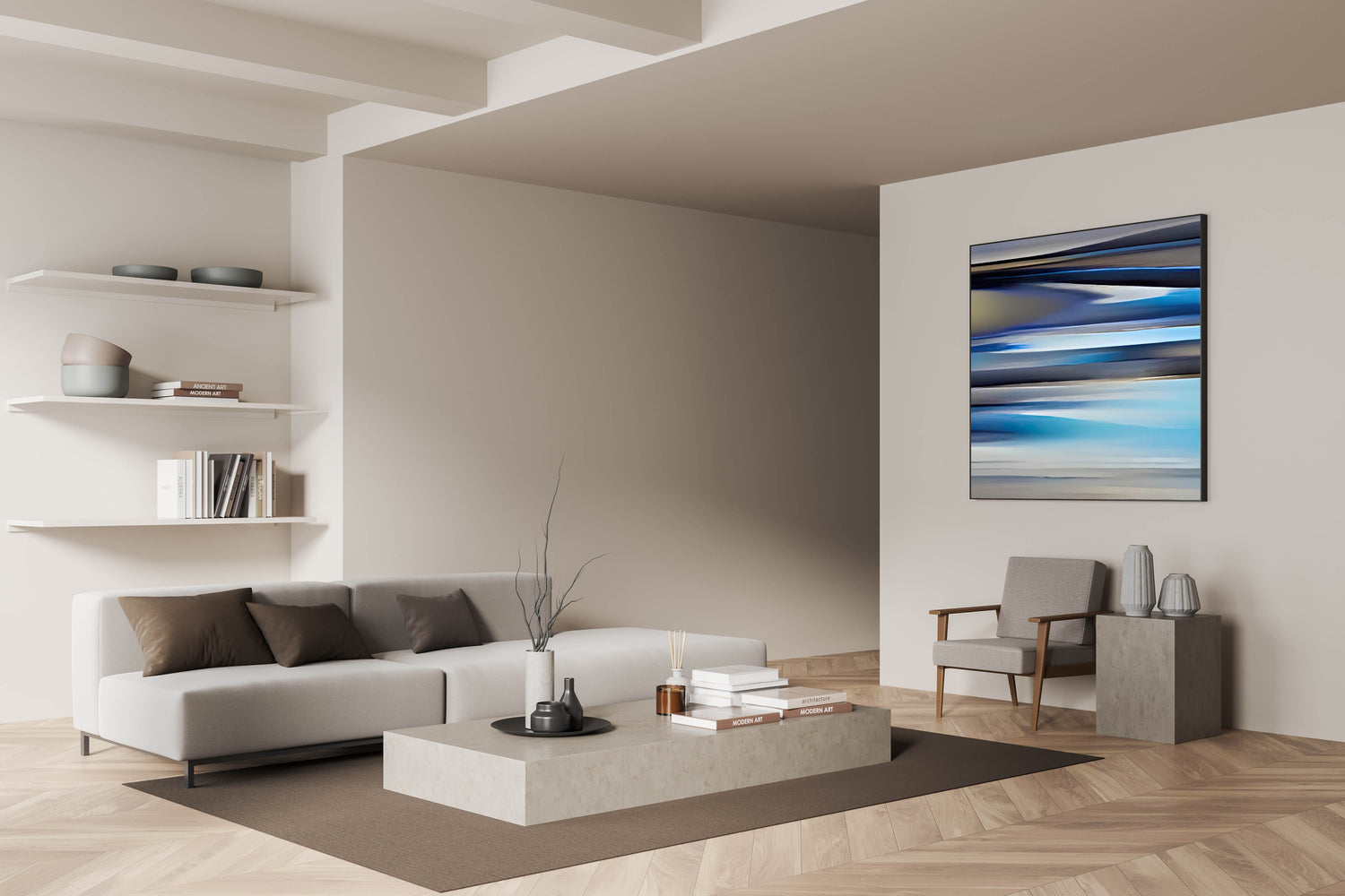 Immerse yourself in the serene beauty of this Modern Blue Horizon abstract art piece. The artwork features fluid, layered strokes in a soothing palette of navy blue, light blue, gray, and hints of beige. The horizontal lines create a sense of movement and calm, evoking the imagery of a distant seascape or tranquil horizon. This abstract line art brings a sophisticated, modern touch to any interior, making it a versatile choice for contemporary and minimalist decor.