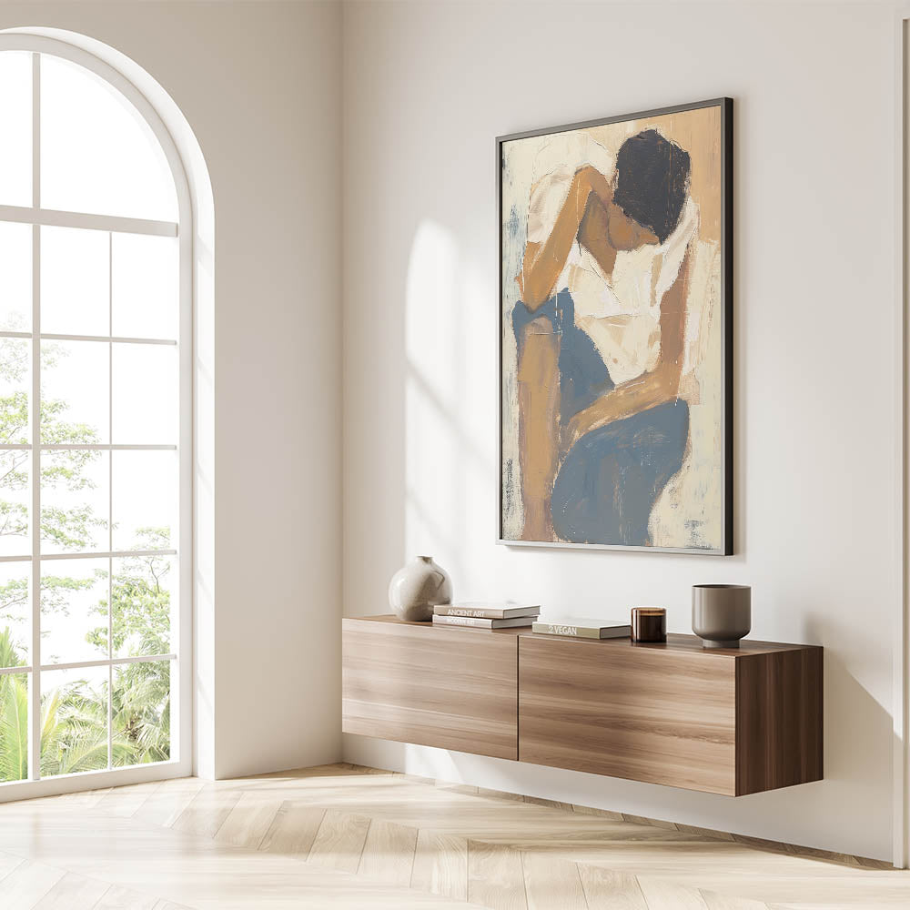 Introduce a sense of calm introspection to your space with this modern figurative abstract design. Featuring a poised figure rendered in warm earth tones and soft blue accents, this artwork celebrates the beauty of human form and emotion. Its textured brushstrokes and intricate details make it a standout piece for any contemporary home.