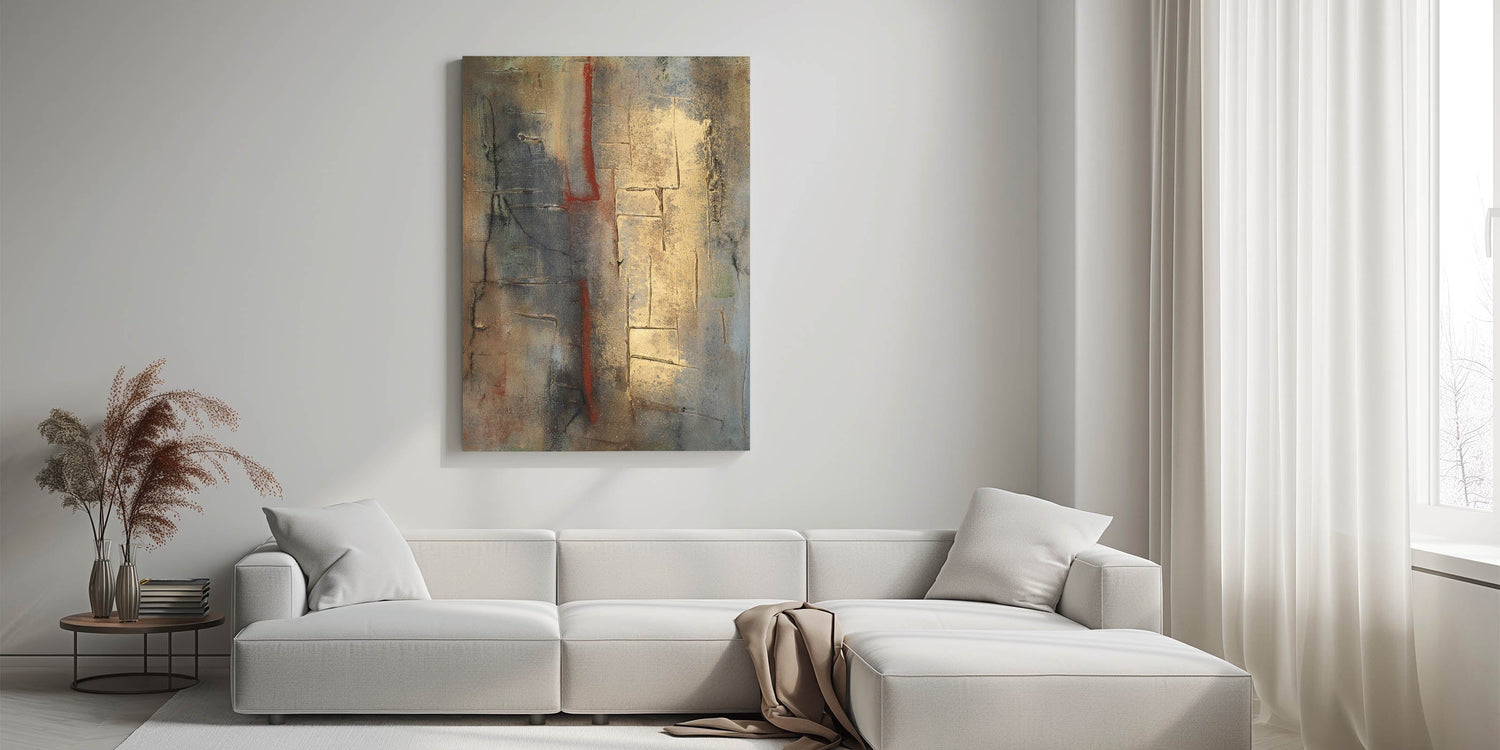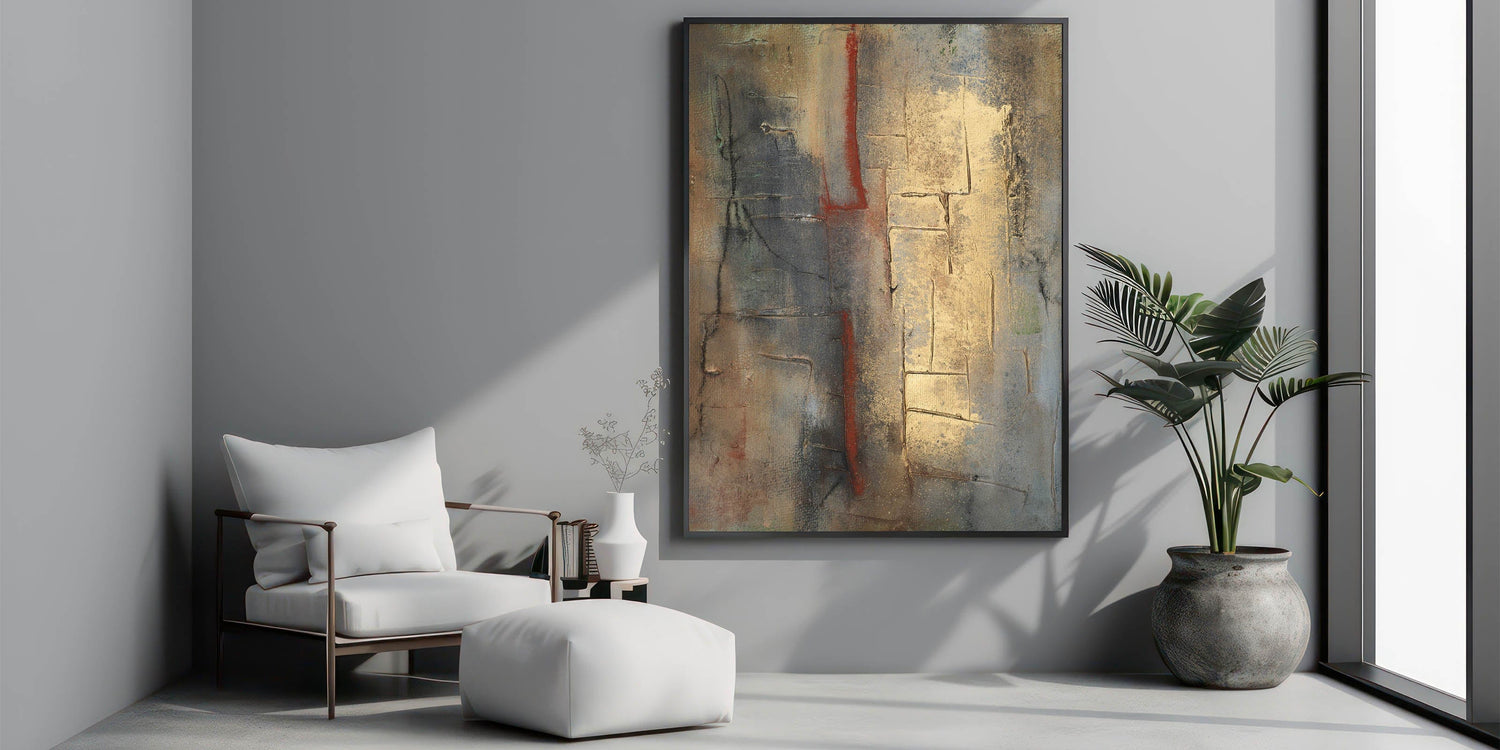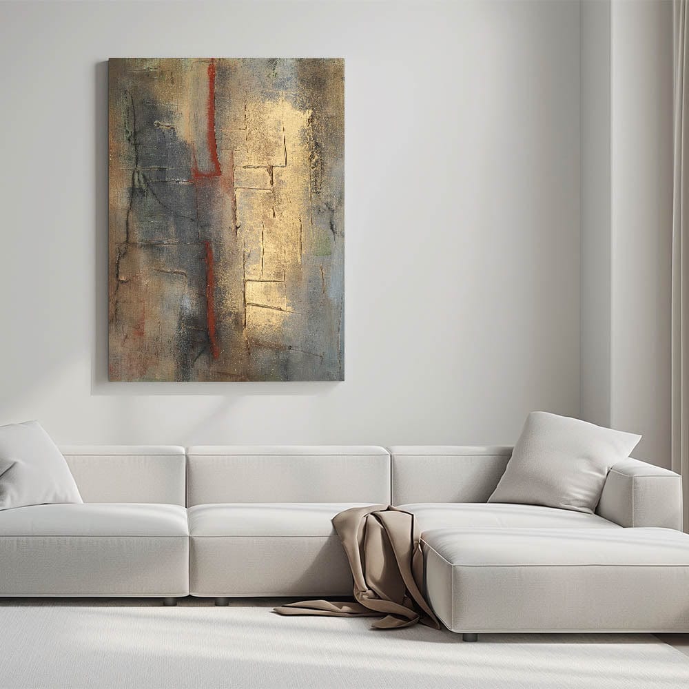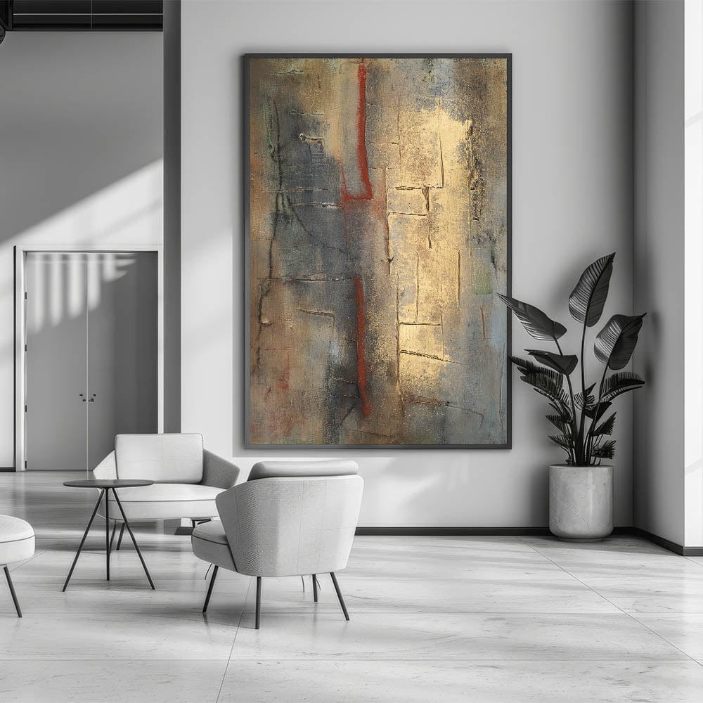 Bring a bold and sophisticated touch to your space with this moody modern wall art, featuring a rich blend of gold, red, and gray tones. The striking contrast between deep earthy hues and shimmering metallic textures creates a visually captivating abstract wall art piece. The layered composition adds depth and movement, making it an ideal statement for contemporary interiors, offices, or gallery walls.