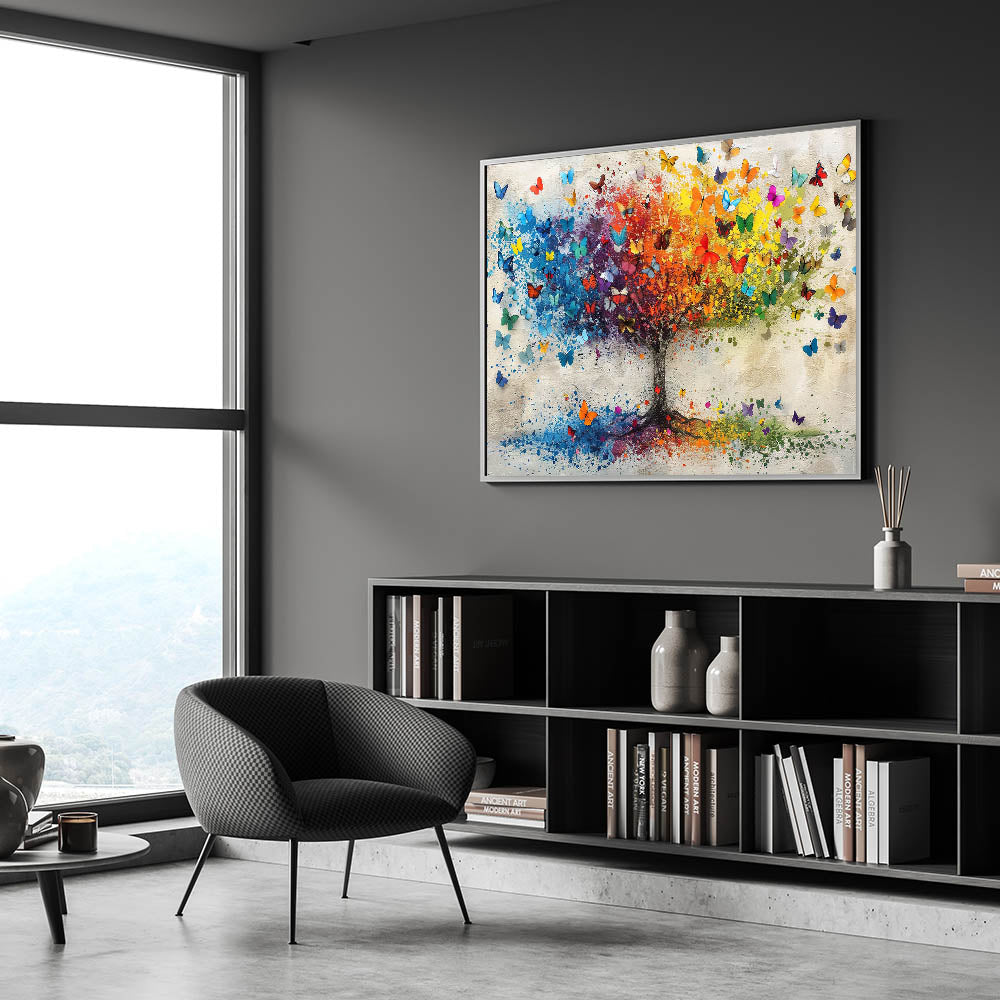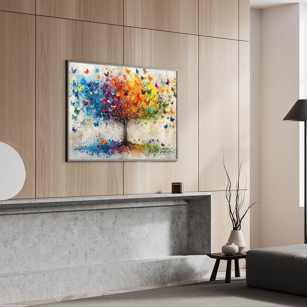 Add a burst of vibrant energy to your space with this Colorful Butterfly Tree Wall Art. This mesmerizing design features a dynamic explosion of multicolored butterflies emerging from a striking abstract tree, symbolizing freedom, transformation, and beauty. With splashes of blue, orange, yellow, green, and red, this canvas wall art creates an eye-catching focal point, perfect for modern living room decor. Whether you prefer stretched canvas, framed prints, or acrylic glass, this large wall art will elevate any space with its unique charm.