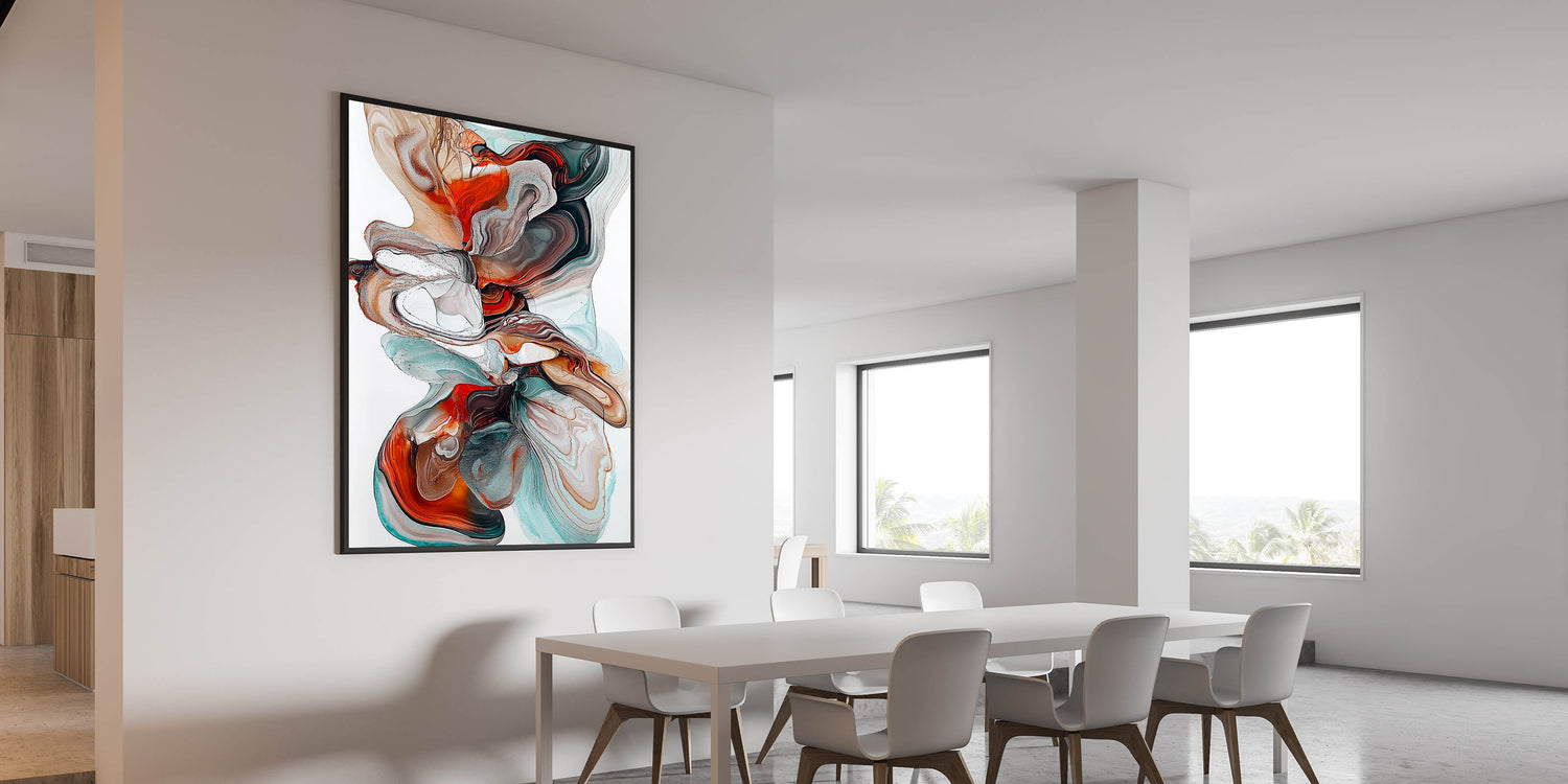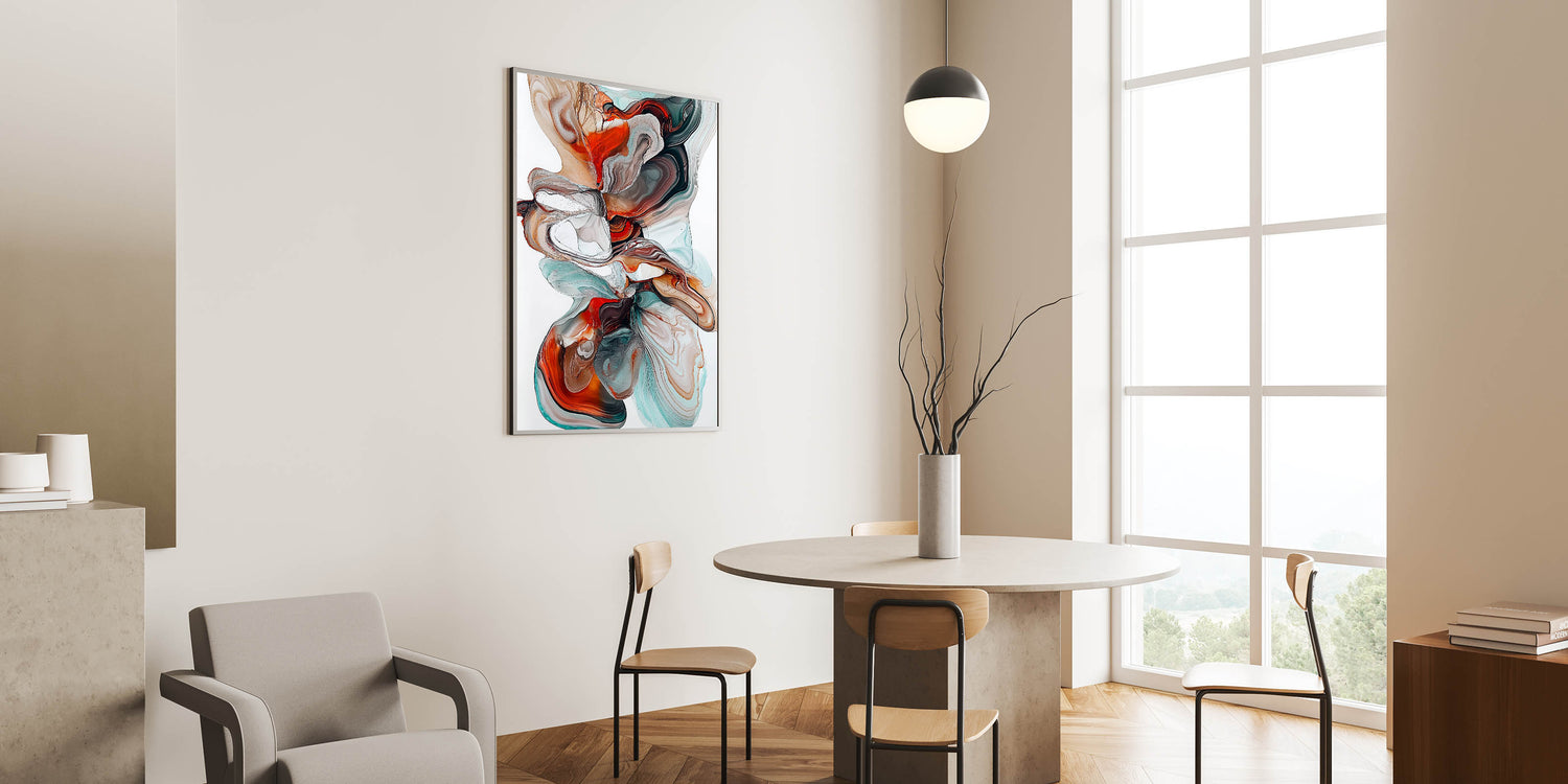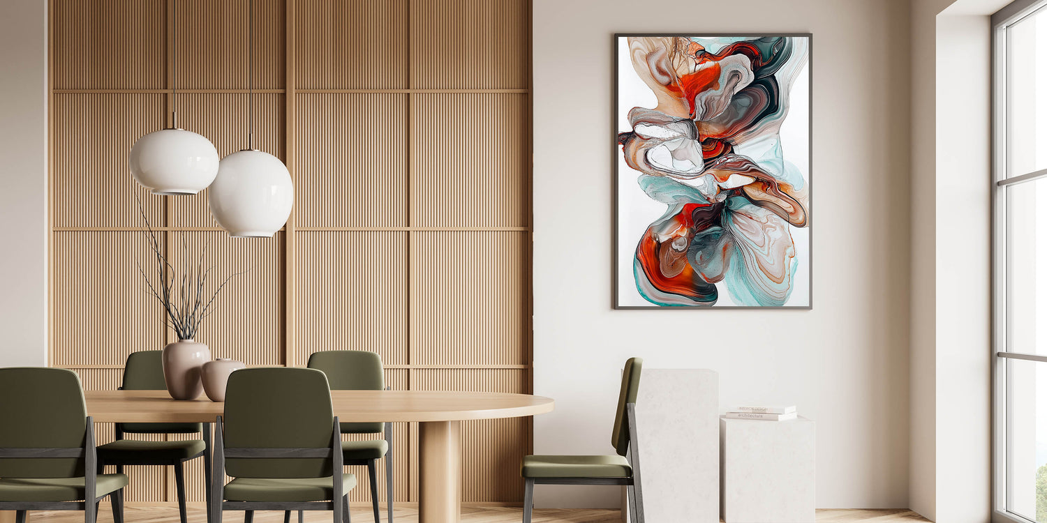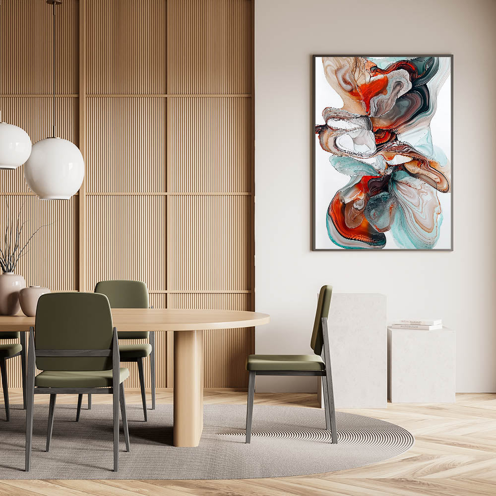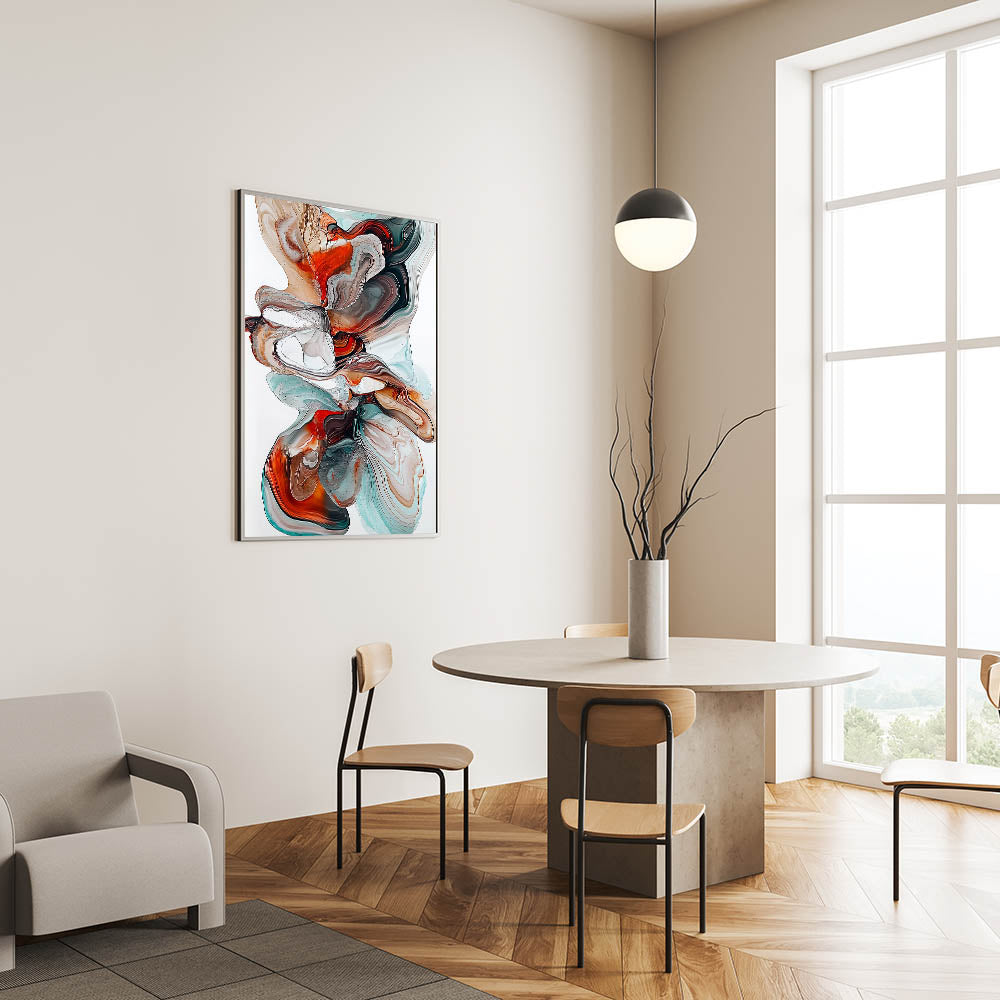 Bring a dynamic and elegant touch to your dining space with this contemporary dining art piece. Featuring a mesmerizing flow of teal, burnt orange, brown, and white tones, this artwork captures the beauty of fluid movement and organic patterns. The rich contrast of warm and cool colors makes this piece a bold yet sophisticated addition to any modern dining room wall art collection.
