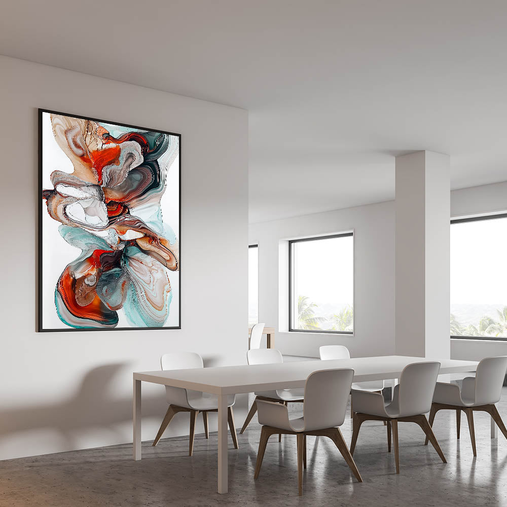 • Fluid Abstract Design: Swirling hues of teal, orange, and brown create a striking visual statement.