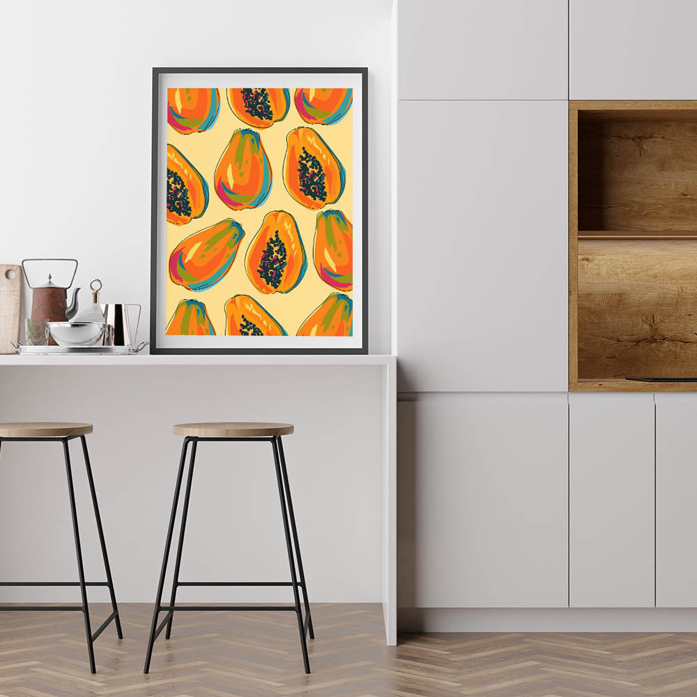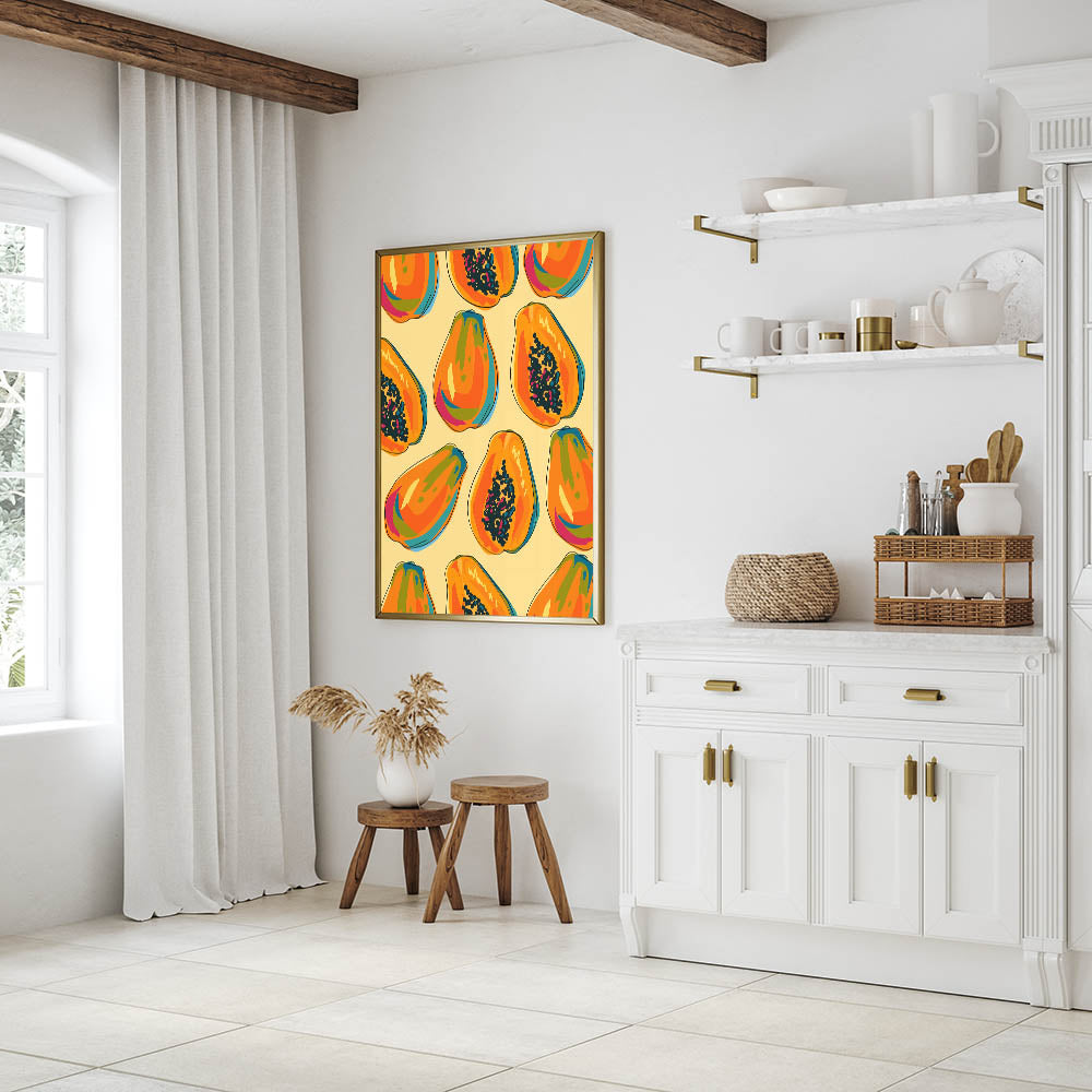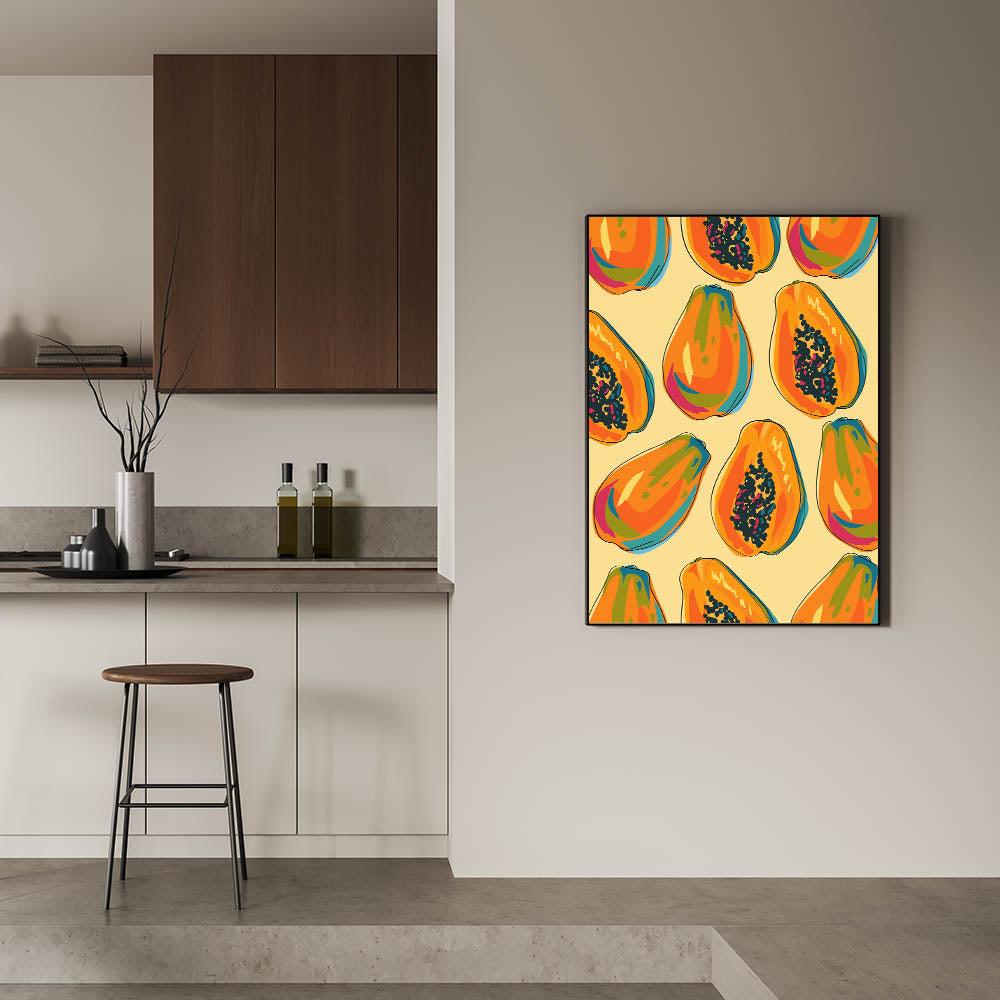 This fruit poster art is ideal for those looking to brighten their space with a bold and modern tropical vibe. Whether you love fruit still life art or want to add a pop of color to your walls, this artistic papaya print is a must-have for your kitchen fruit decor collection.