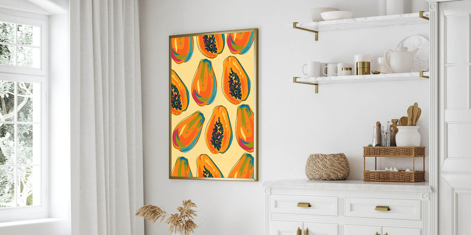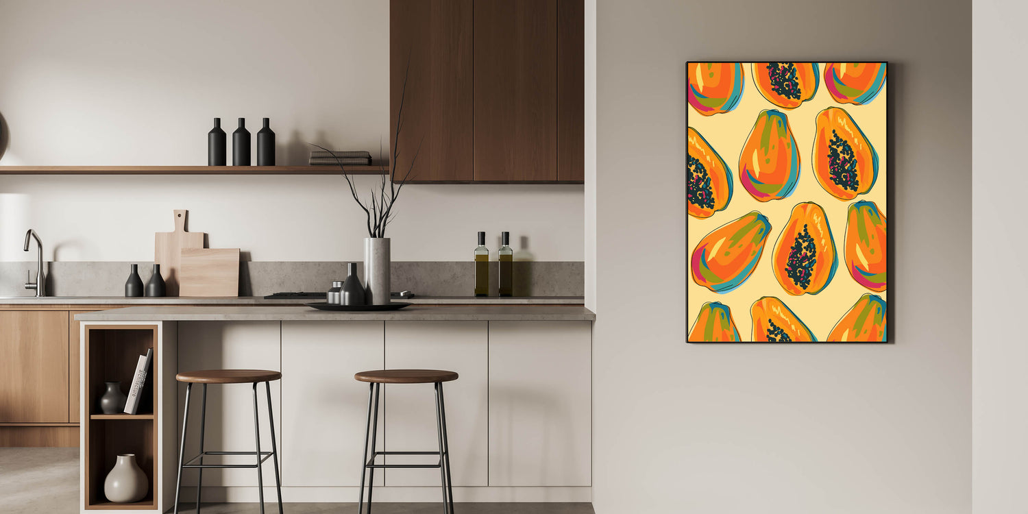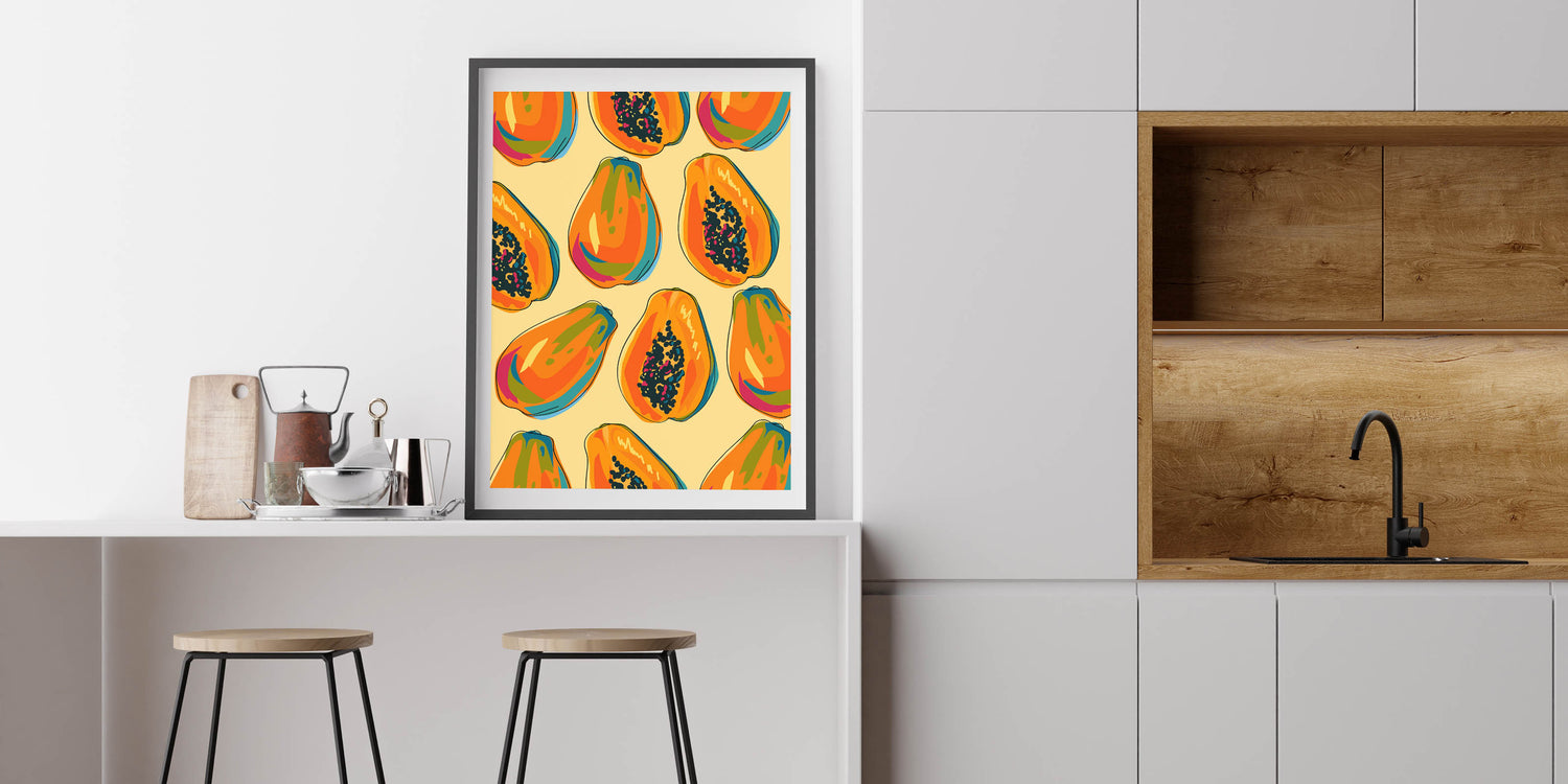 This fruit poster art is ideal for those looking to brighten their space with a bold and modern tropical vibe. Whether you love fruit still life art or want to add a pop of color to your walls, this artistic papaya print is a must-have for your kitchen fruit decor collection.