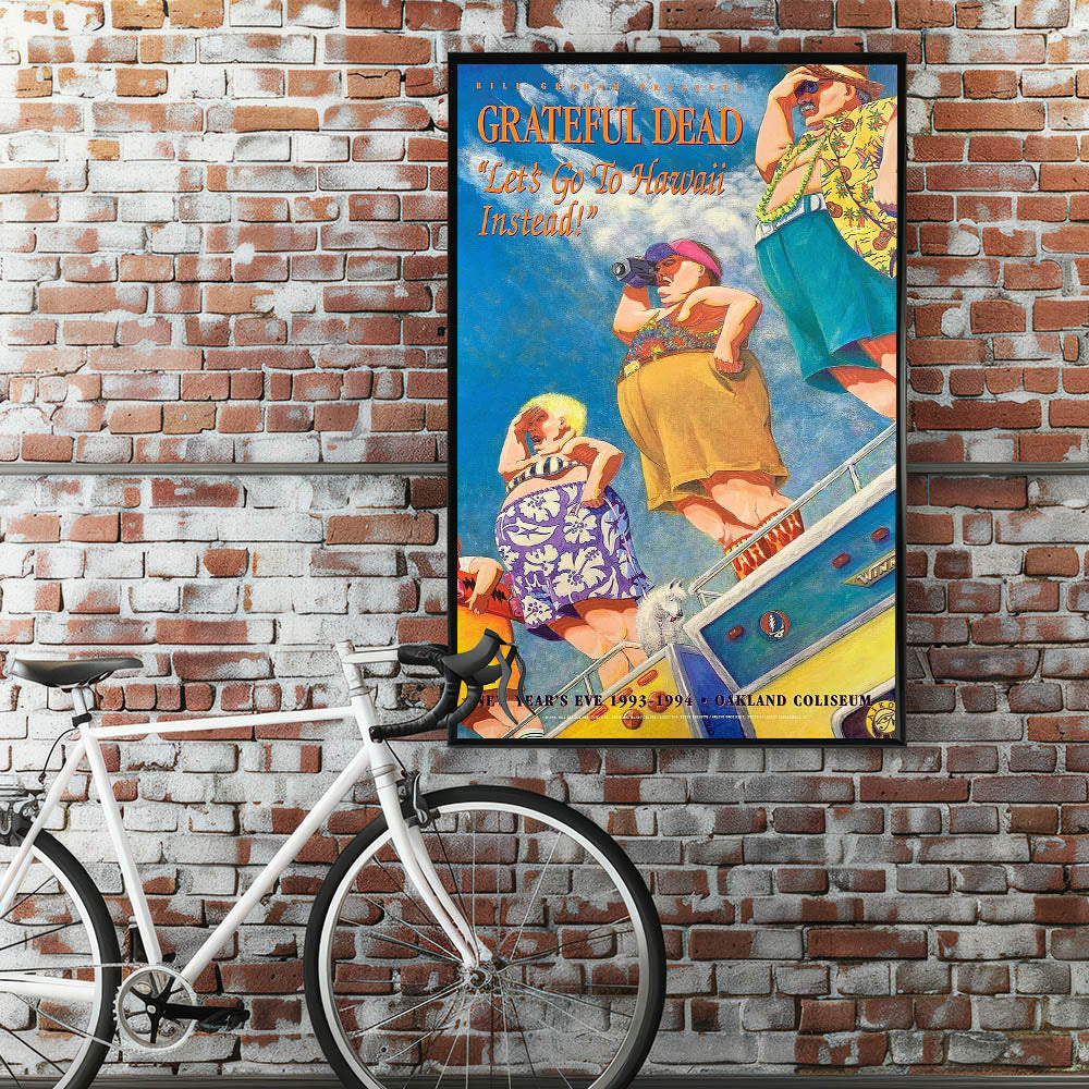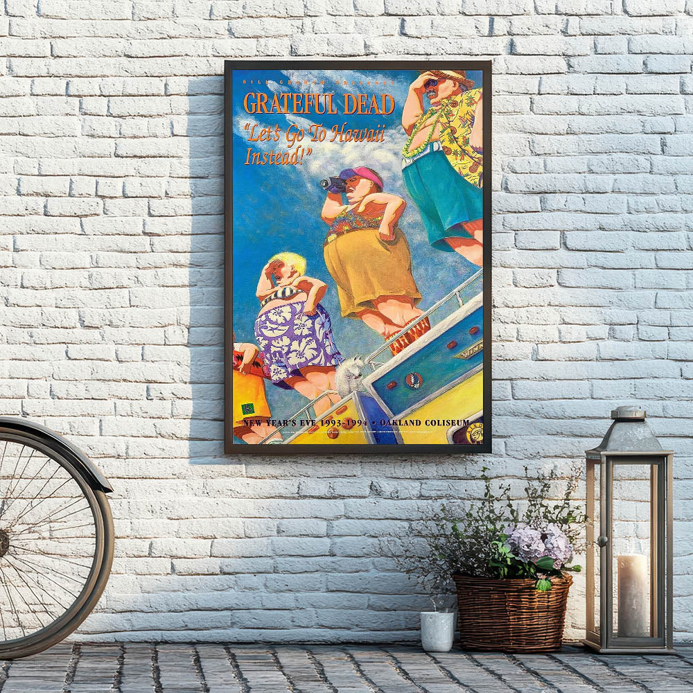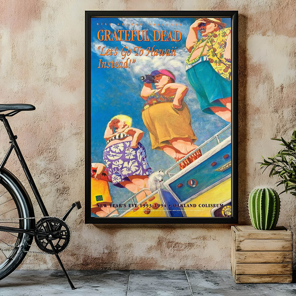 Bring a touch of humor and nostalgia to your space with this Grateful Dead Retro Wall Art, a vintage print from their New Year’s Eve 1993-94 concert at Oakland Coliseum. Featuring a quirky, colorful illustration of beachgoers looking off into the distance, this retro poster art perfectly captures classic retro style with a mix of vintage decor and playful design. The phrase "Let’s Go to Hawaii Instead!" adds a fun, lighthearted vibe, making this piece perfect for fans of nostalgic art prints.