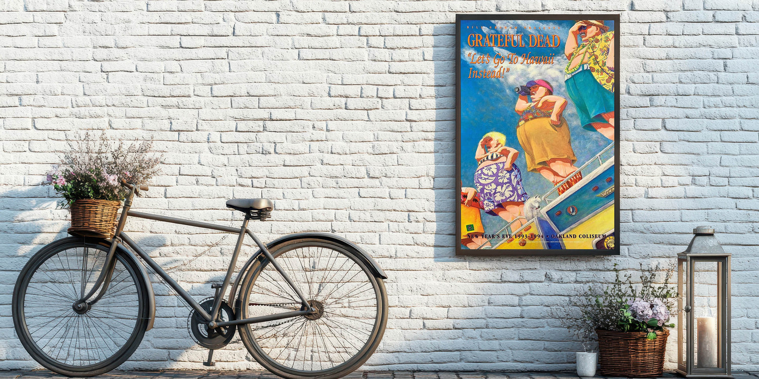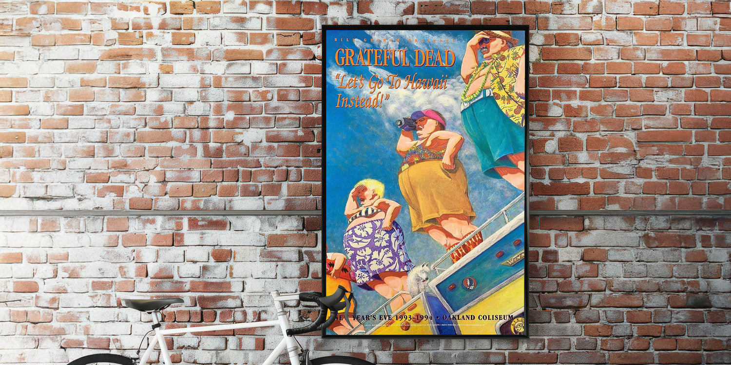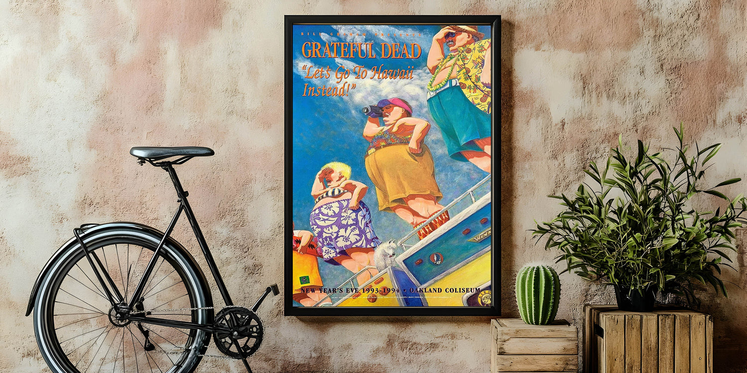 Bring a touch of humor and nostalgia to your space with this Grateful Dead Retro Wall Art, a vintage print from their New Year’s Eve 1993-94 concert at Oakland Coliseum. Featuring a quirky, colorful illustration of beachgoers looking off into the distance, this retro poster art perfectly captures classic retro style with a mix of vintage decor and playful design. The phrase "Let’s Go to Hawaii Instead!" adds a fun, lighthearted vibe, making this piece perfect for fans of nostalgic art prints.