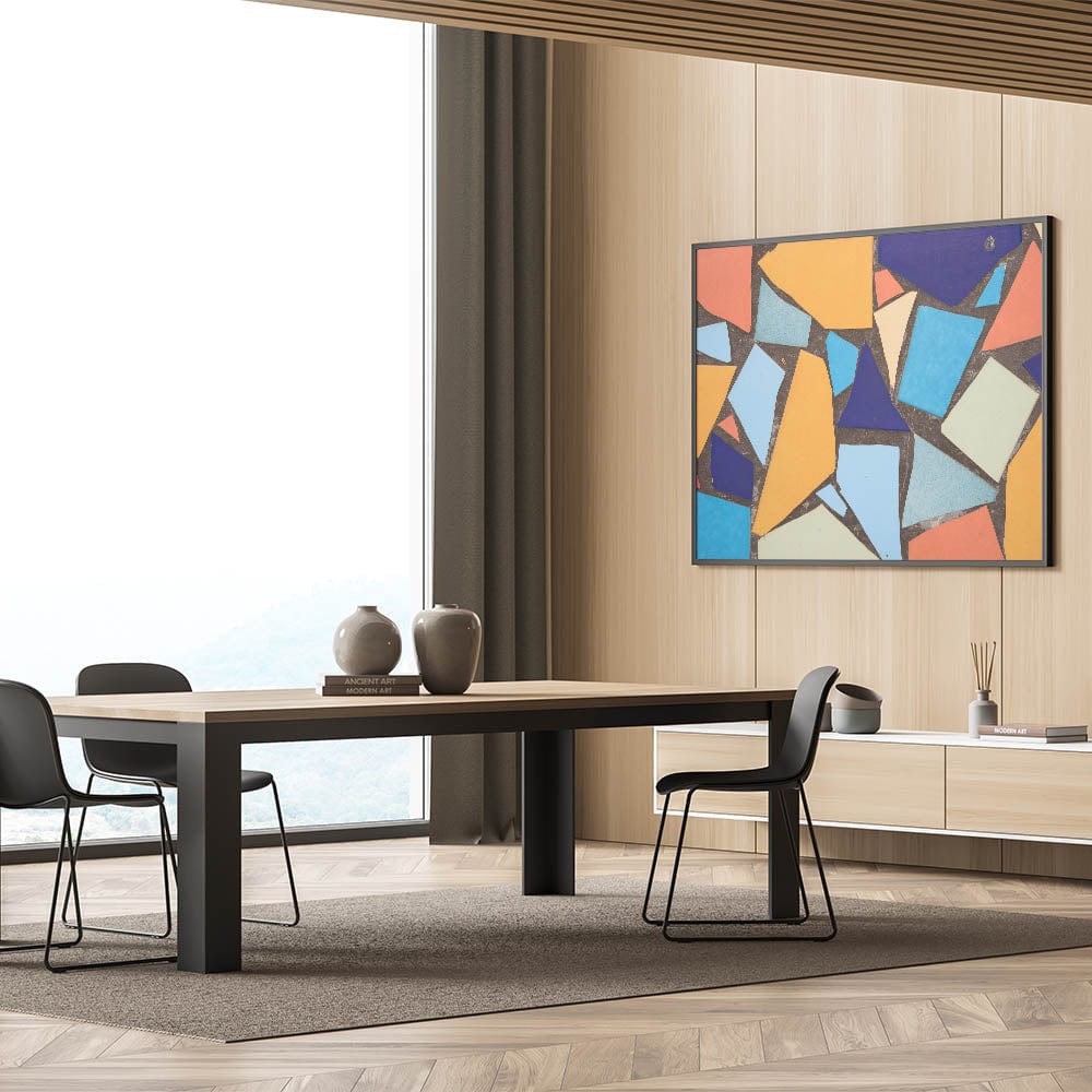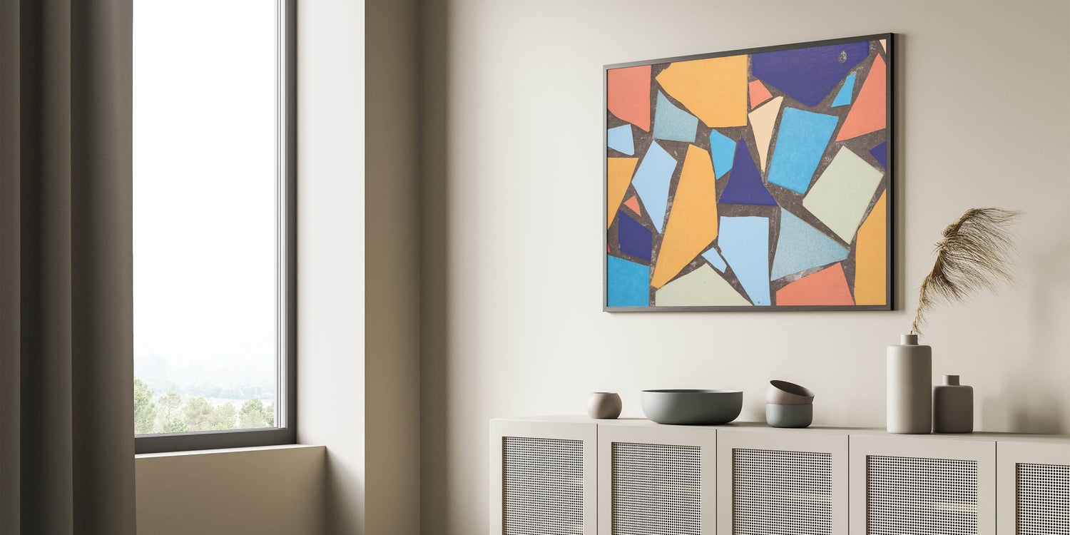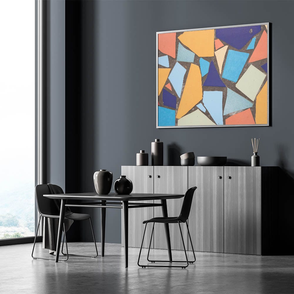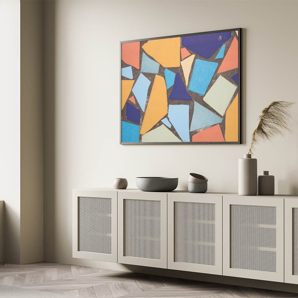 Brighten your space with this large abstract wall art, a vibrant composition featuring blue, orange, yellow, and beige hues. Inspired by mosaic patterns, the bold geometric fragments create a dynamic sense of movement, making this modern abstract painting a statement piece for any contemporary setting.