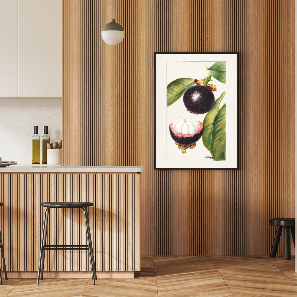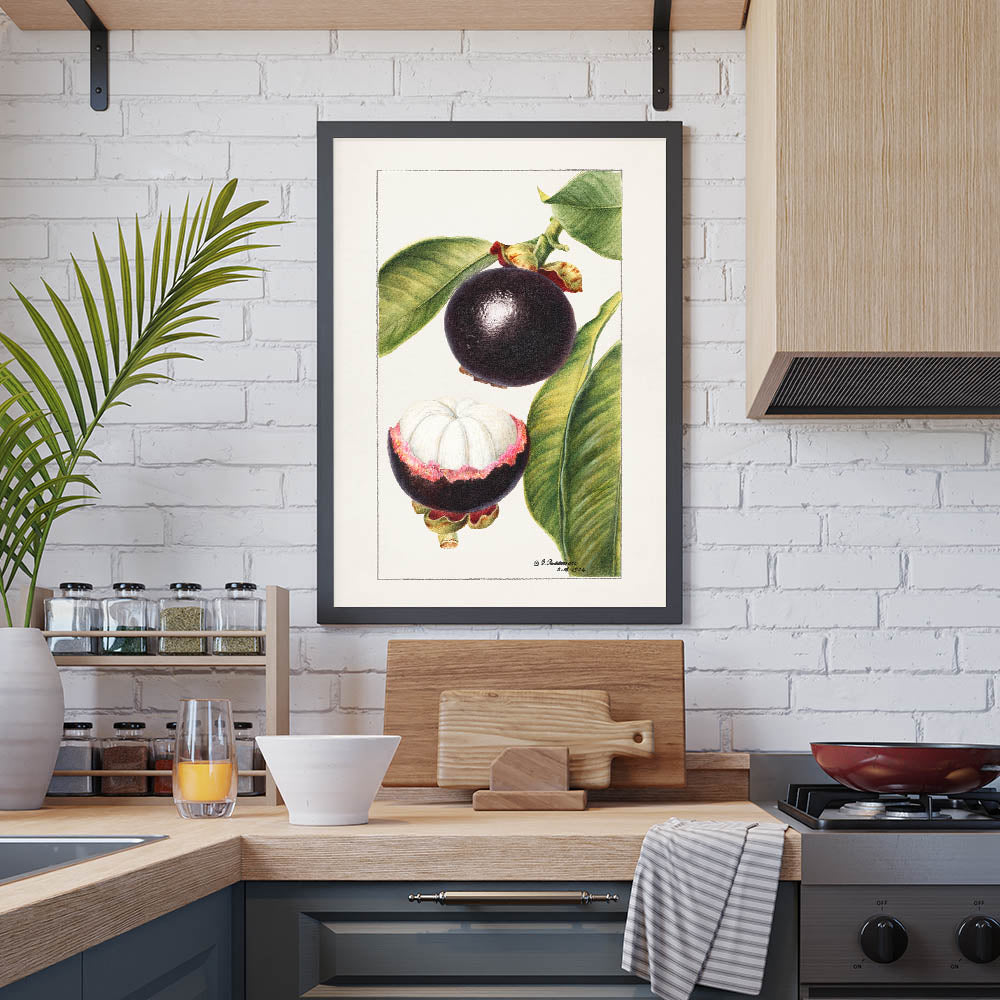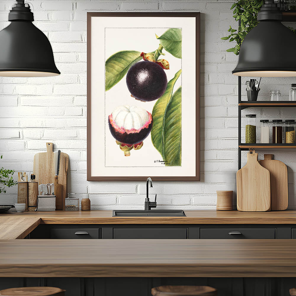 Bring tropical elegance to your home with this fruit-themed wall art, featuring a vintage botanical illustration of mangosteen. With deep purple hues and lush green leaves, this fruit canvas art captures the exotic beauty of the mangosteen fruit. The detailed artwork showcases both the whole and halved fruit, making it a perfect addition to kitchen fruit decor, cafés, and tropical-themed interiors.