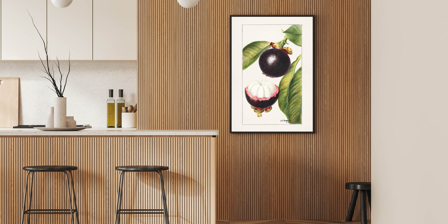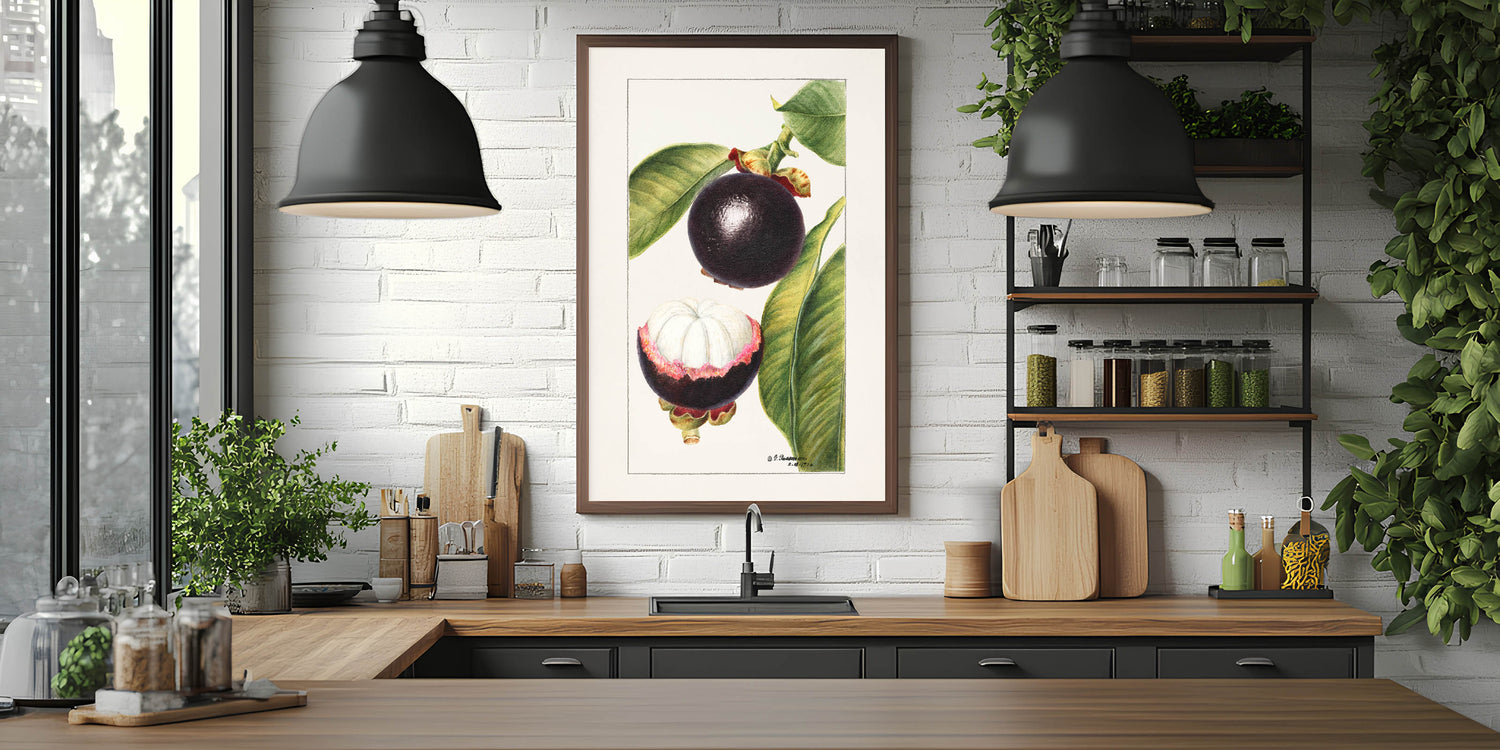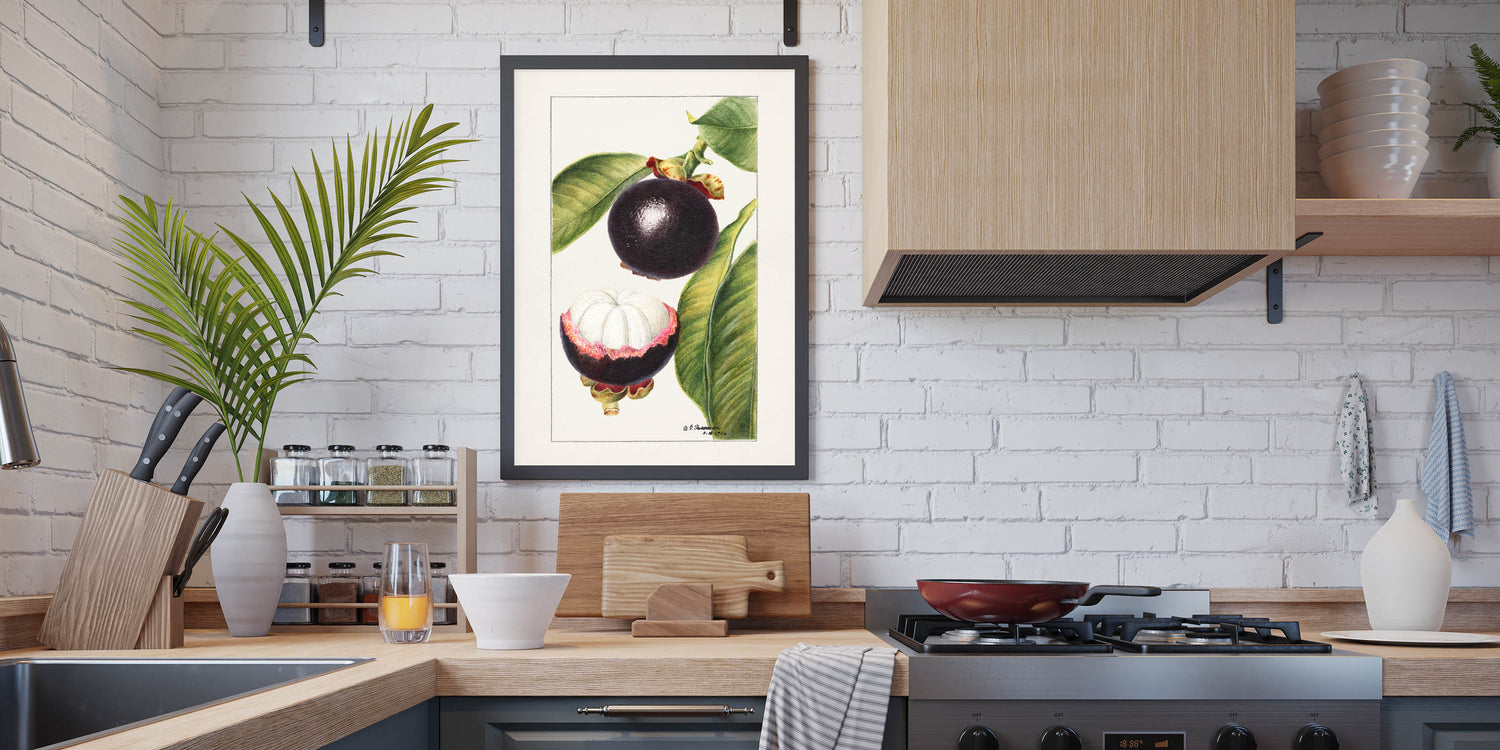 Bring tropical elegance to your home with this fruit-themed wall art, featuring a vintage botanical illustration of mangosteen. With deep purple hues and lush green leaves, this fruit canvas art captures the exotic beauty of the mangosteen fruit. The detailed artwork showcases both the whole and halved fruit, making it a perfect addition to kitchen fruit decor, cafés, and tropical-themed interiors.
