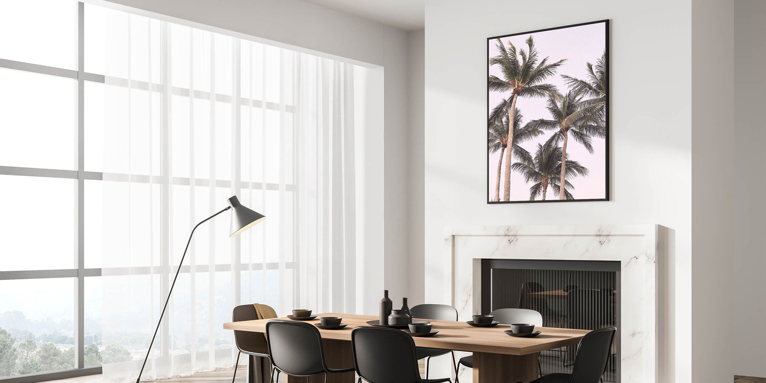 - High-resolution details capturing the graceful textures of palm fronds and soft pastel sky