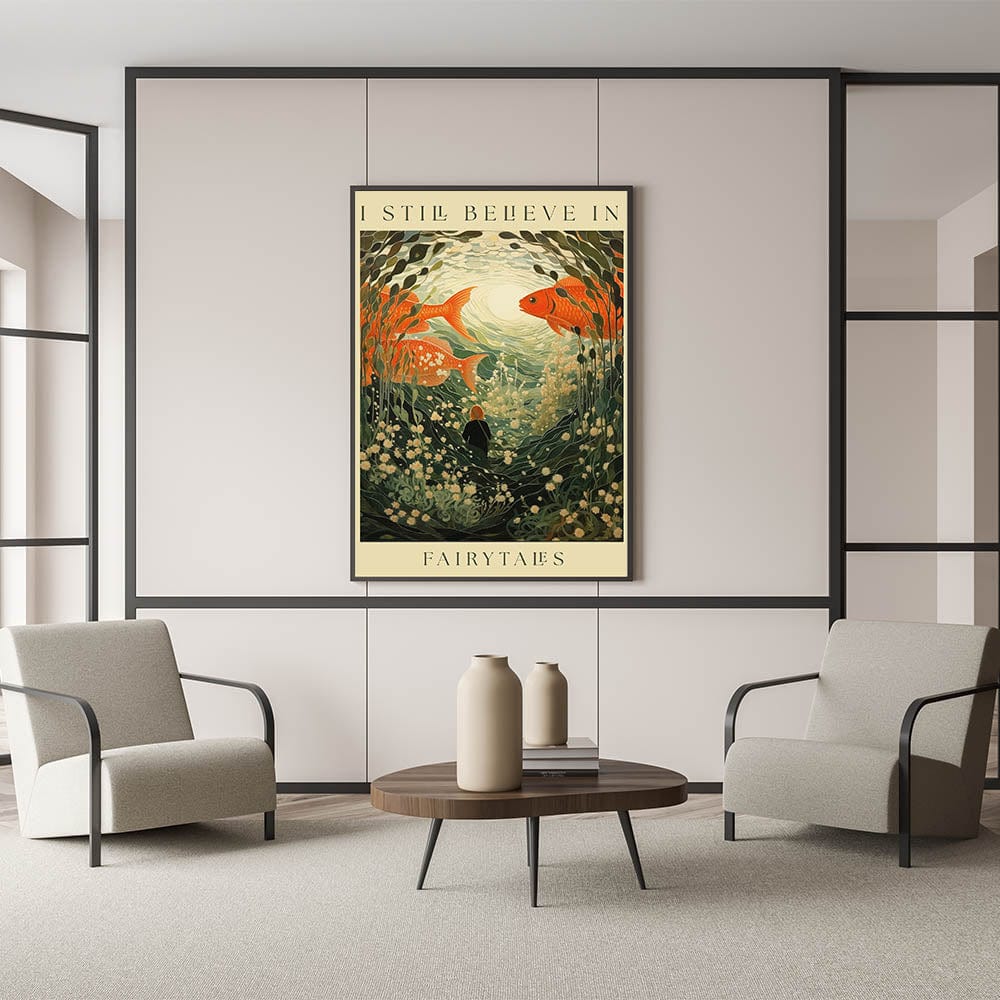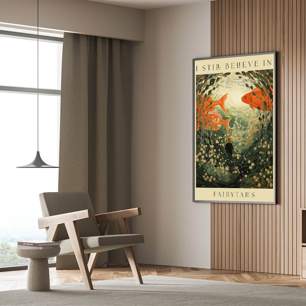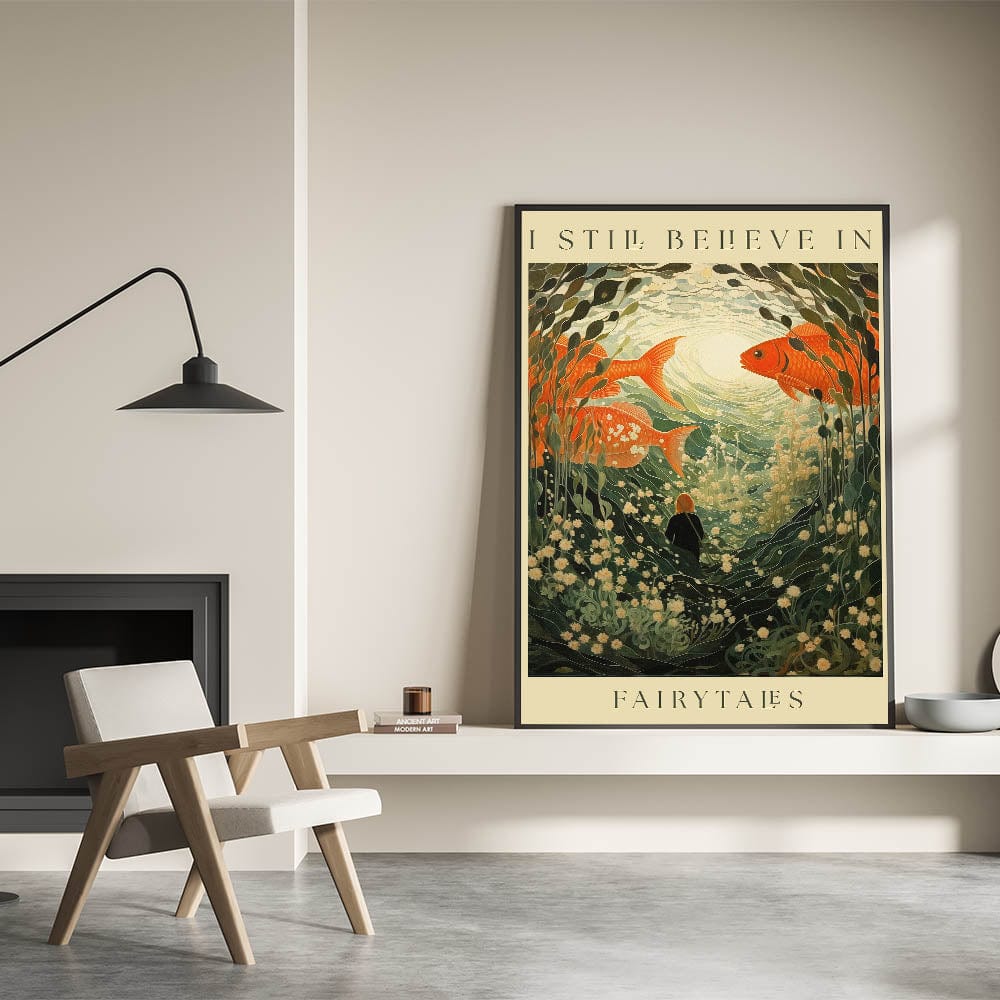 Add a touch of magic and wonder to your space with this vintage botanical art print featuring a mystical fairytale scene. A young figure walks through an enchanting garden, surrounded by vibrant orange fish, lush greenery, and whimsical flowers. The soft, earthy tones and playful design make this botanical wall decor perfect for those who love nature-inspired art with a dreamlike twist. This print brings a sense of nostalgia and creativity to any room, ideal for anyone who enjoys retro floral wall art or vintage style decor.