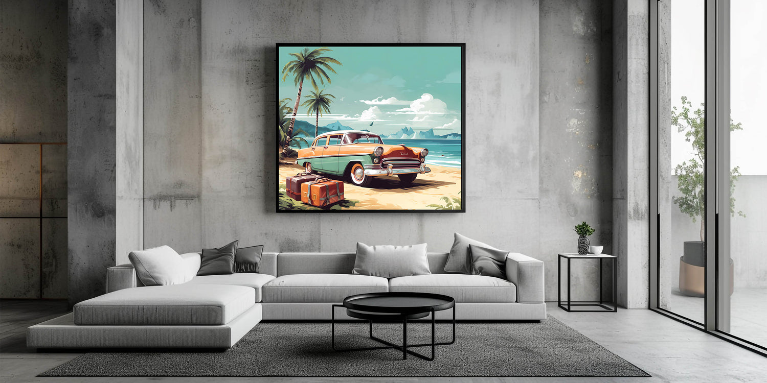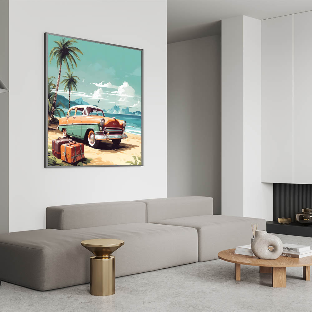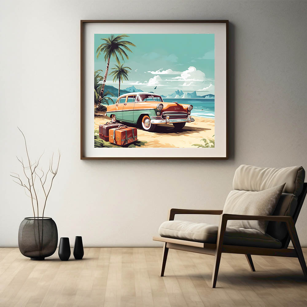 This wall art is the perfect addition to any living space, office, or vacation home, bringing a sense of adventure and retro charm. Whether you're a vintage car collector or looking for a unique statement piece, this print will transport you to sun-soaked days and scenic drives. Its vibrant colors and timeless appeal make it a standout choice for any art collection.