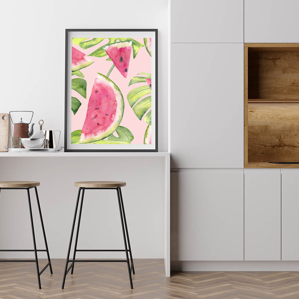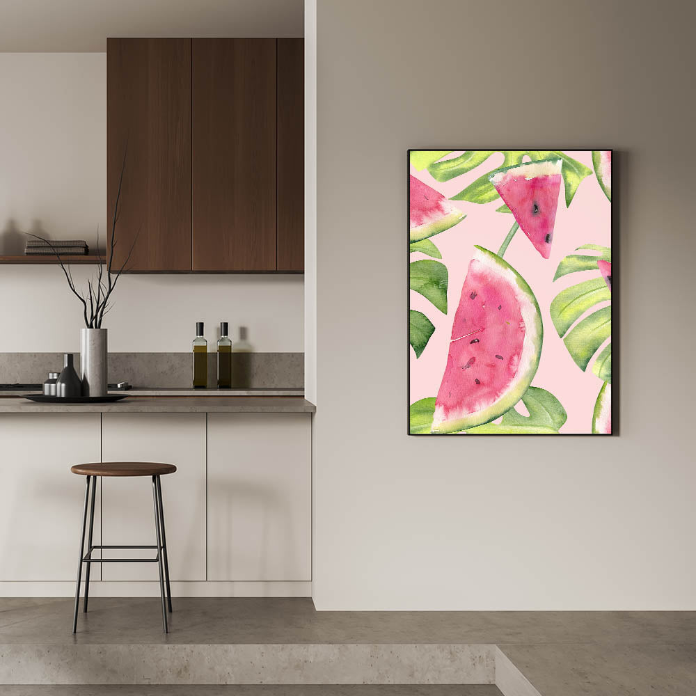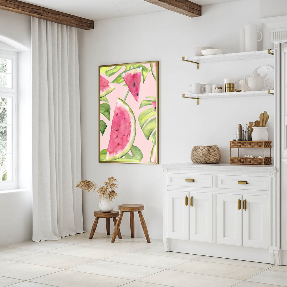 Brighten up your space with this fruit-themed wall art, featuring a playful and refreshing watercolor illustration of watermelon slices and tropical leaves. The vibrant pink, lush green, and soft pastel background make this fruit illustration print a lively addition to kitchens, dining areas, and modern interiors. This fruit watercolor art brings a fresh and contemporary touch to any space, perfect for summer-inspired decor.