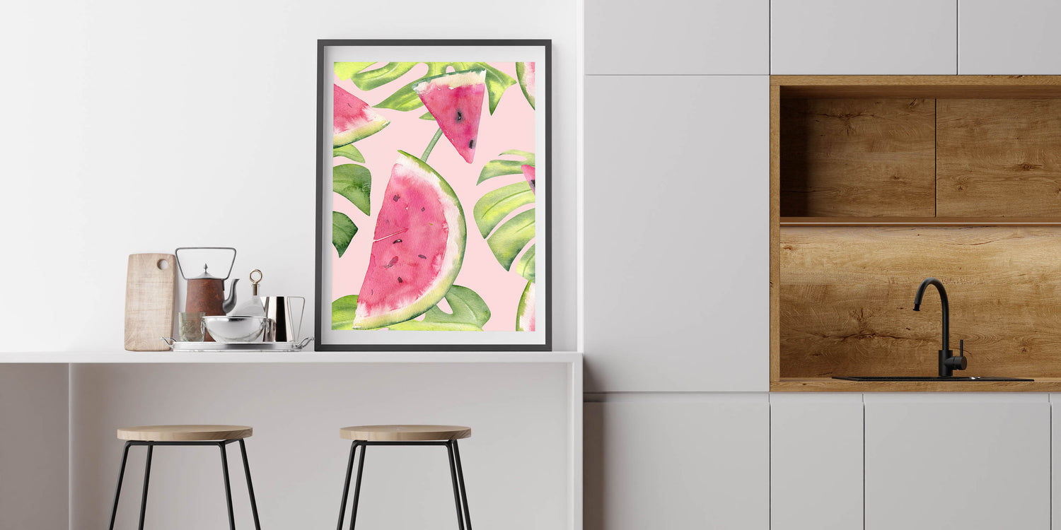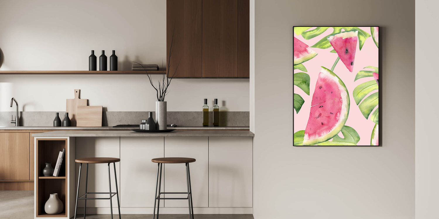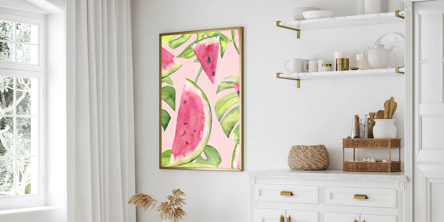 Brighten up your space with this fruit-themed wall art, featuring a playful and refreshing watercolor illustration of watermelon slices and tropical leaves. The vibrant pink, lush green, and soft pastel background make this fruit illustration print a lively addition to kitchens, dining areas, and modern interiors. This fruit watercolor art brings a fresh and contemporary touch to any space, perfect for summer-inspired decor.