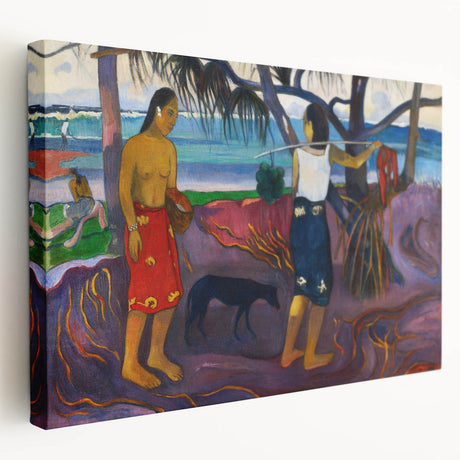 • Side view of a large stretched canvas featuring an impressionist depiction of a lively street scene in vibrant.