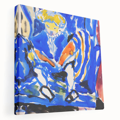 • Stretched canvas wall art featuring an abstract design of colorful strokes in hues of blue, orange, and yellow, displayed from a side view to highlight depth and texture. Perfect for modern home decor.