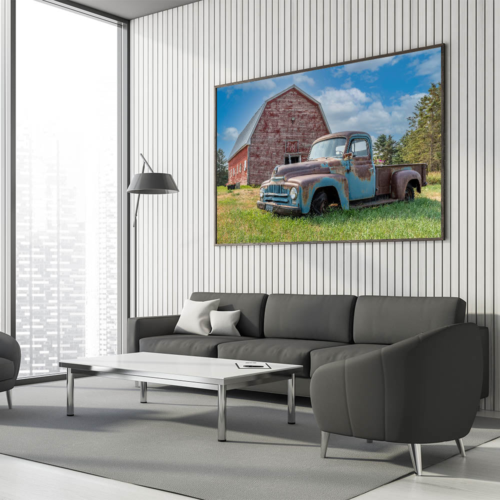 Celebrate the charm of rural life with this captivating wall art featuring an old, rusted truck parked beside a weathered red barn. The scene beautifully captures the essence of country living, with the blue skies and green fields adding a touch of vibrancy to the rustic tones of the truck and barn. This artwork is perfect for those who appreciate the beauty of vintage vehicles and the peacefulness of farm life.