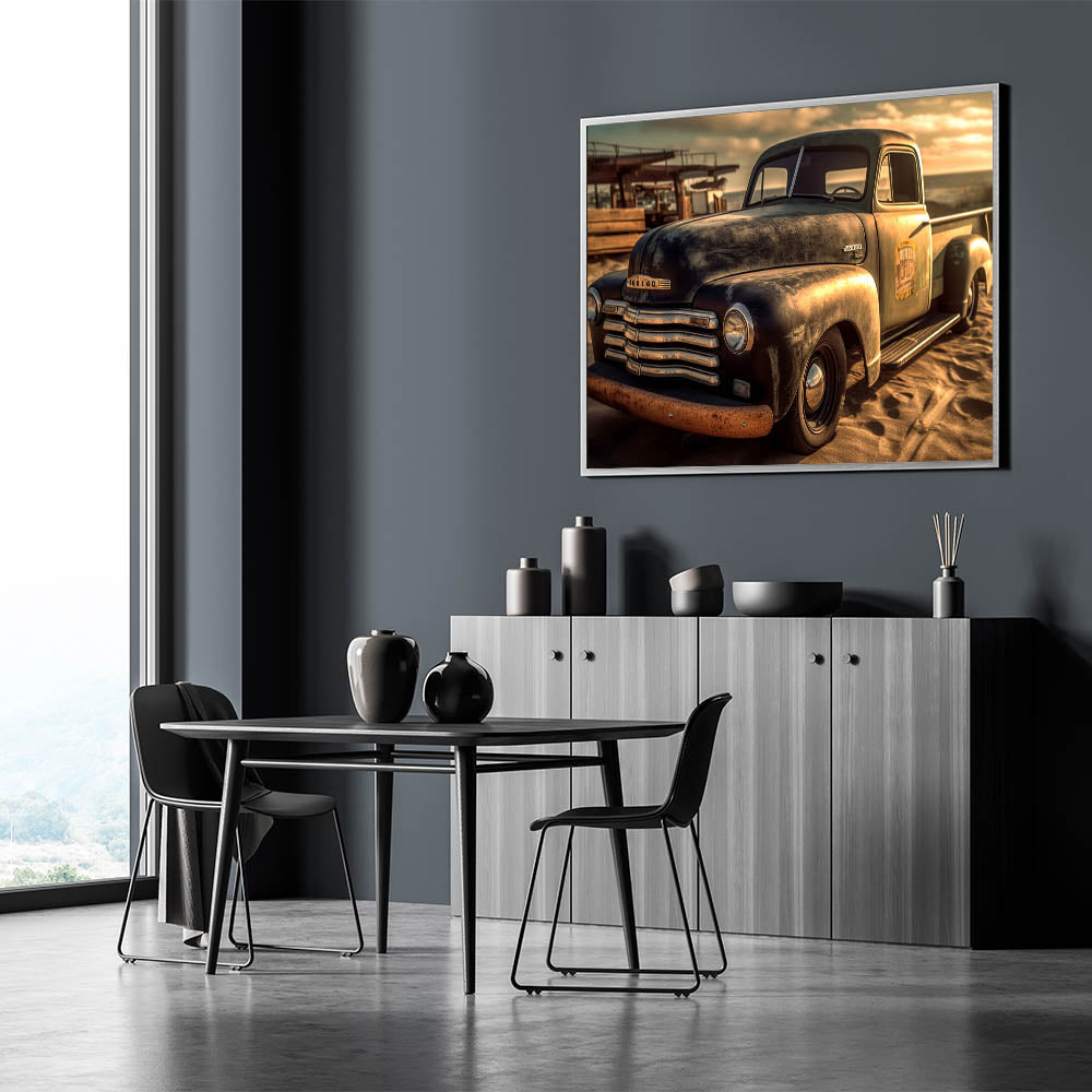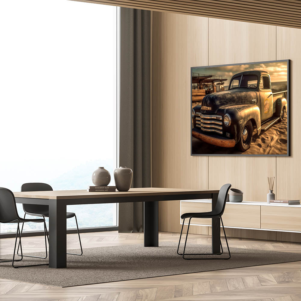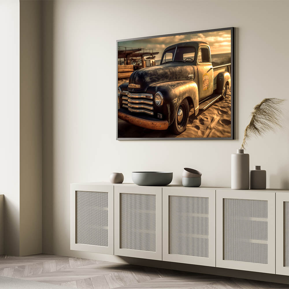 Capture the essence of coastal nostalgia with this stunning wall art featuring a vintage truck resting on a sandy beach. The weathered paint and rusted metal of the truck contrast beautifully with the warm golden tones of the setting sun, creating a serene and timeless scene that evokes memories of days gone by. This artwork is perfect for those who appreciate both the rustic charm of classic vehicles and the calming beauty of the seaside.