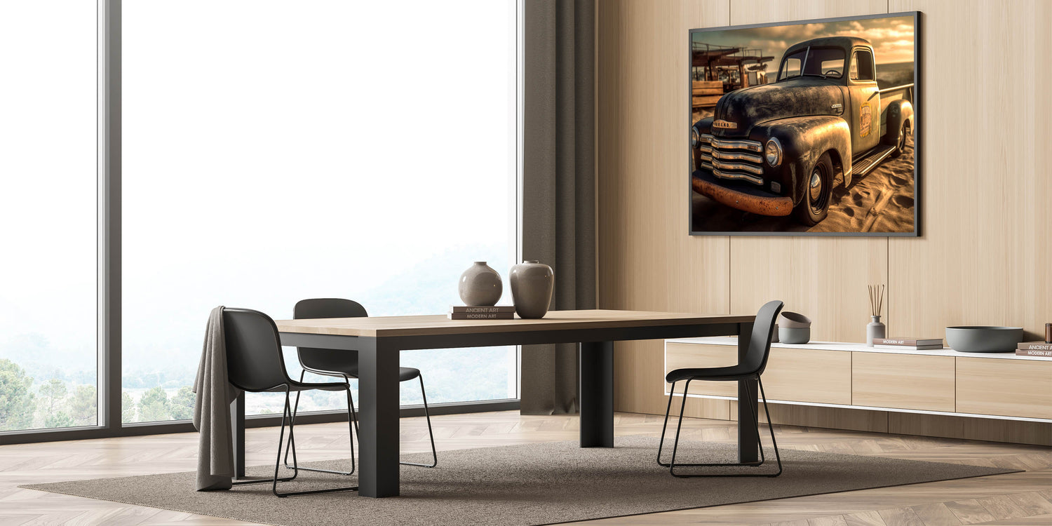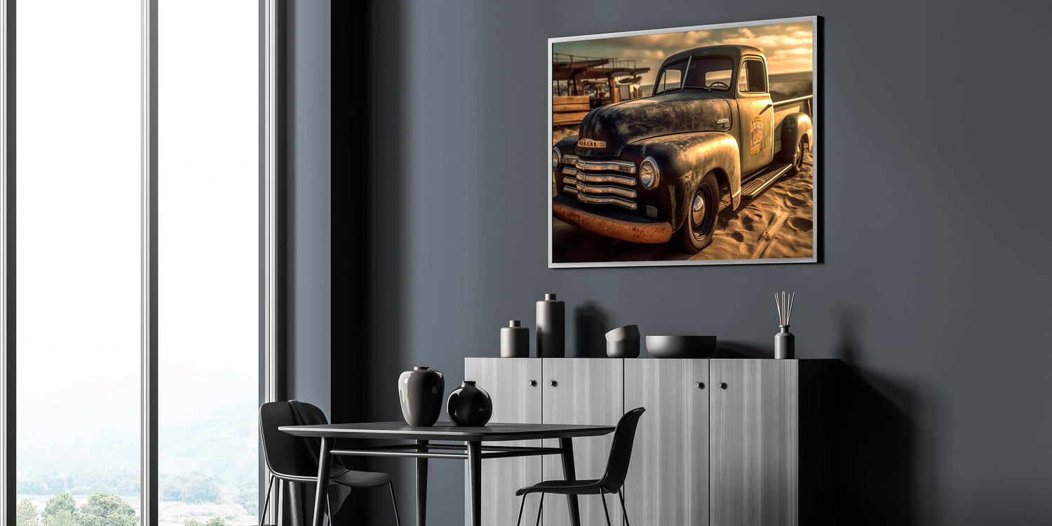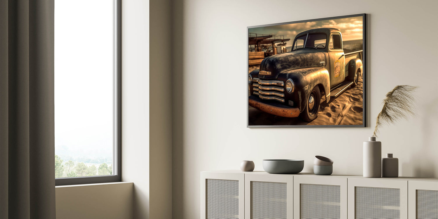 Capture the essence of coastal nostalgia with this stunning wall art featuring a vintage truck resting on a sandy beach. The weathered paint and rusted metal of the truck contrast beautifully with the warm golden tones of the setting sun, creating a serene and timeless scene that evokes memories of days gone by. This artwork is perfect for those who appreciate both the rustic charm of classic vehicles and the calming beauty of the seaside.