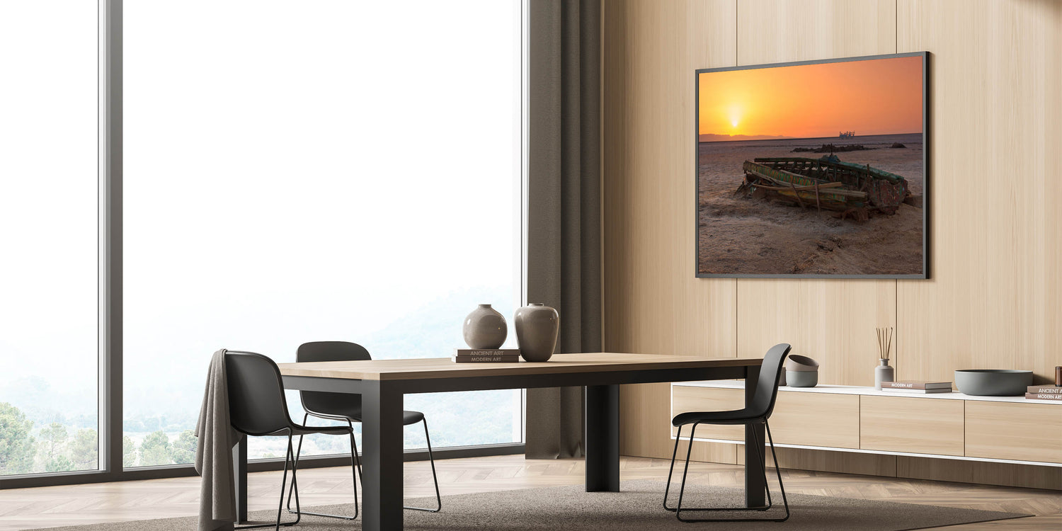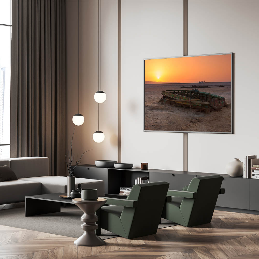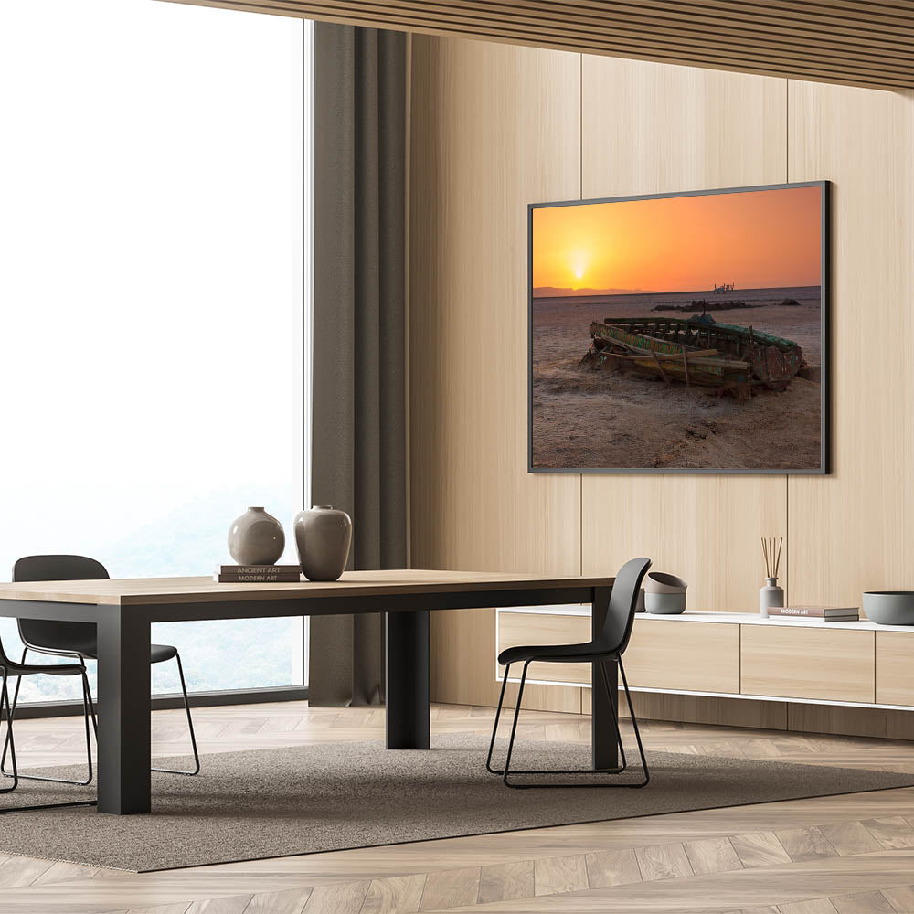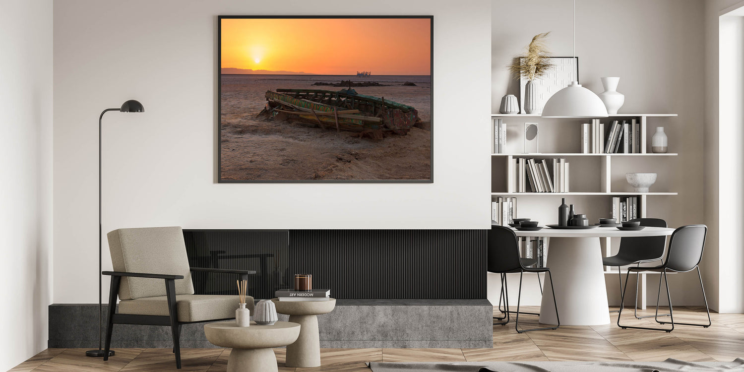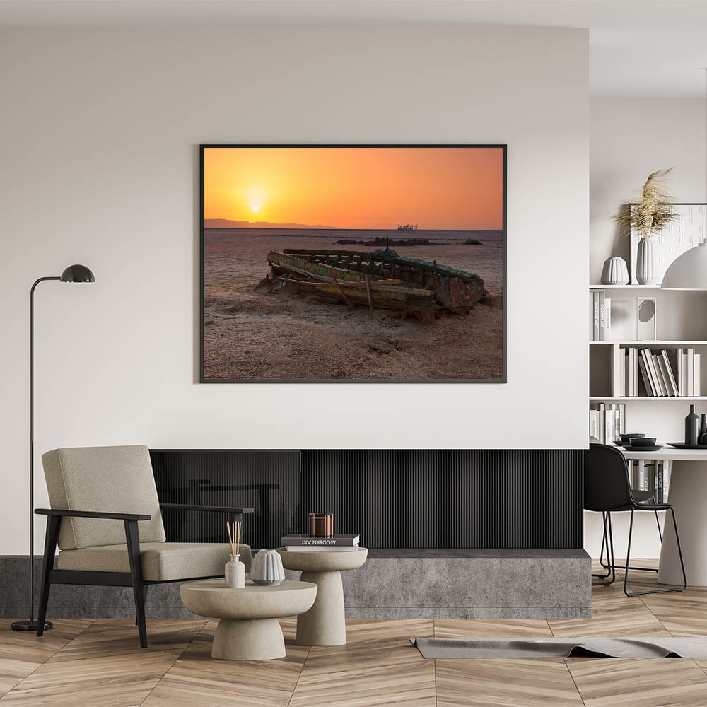 Immerse yourself in the breathtaking beauty of Tunisia with this captivating wall art showcasing a stunning desert sunset. The image features the haunting remains of a wrecked boat set against the warm hues of the setting sun, casting a golden glow over the landscape. This artwork captures the quiet, reflective beauty of the Tunisian desert, making it a perfect addition to any space that embraces natural beauty and serene landscapes.